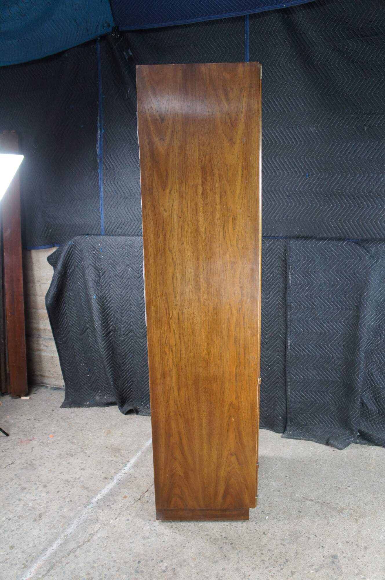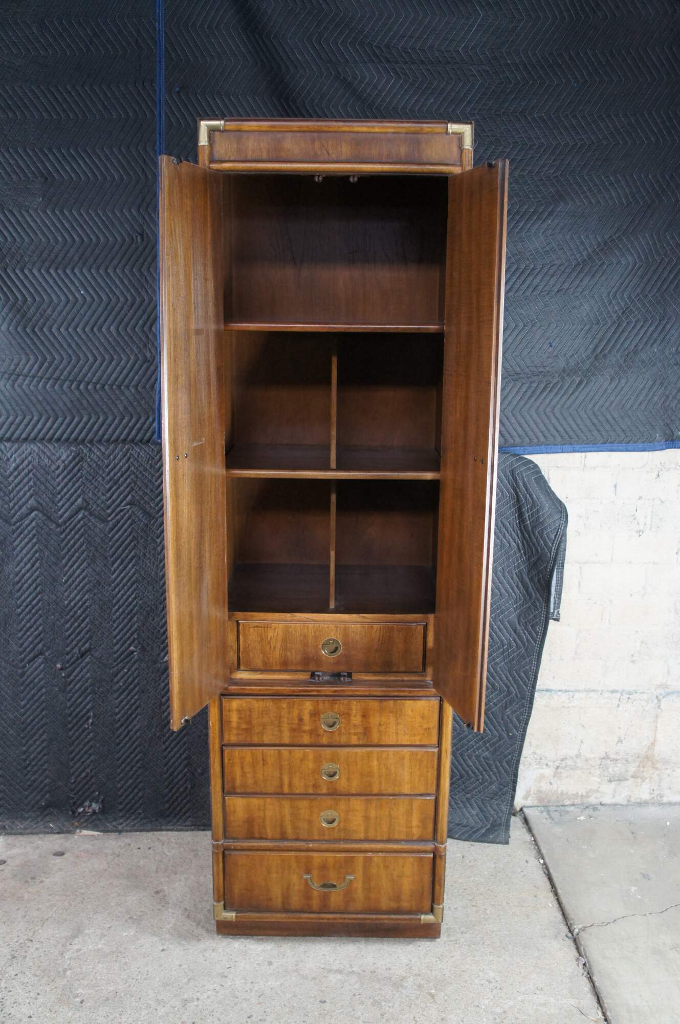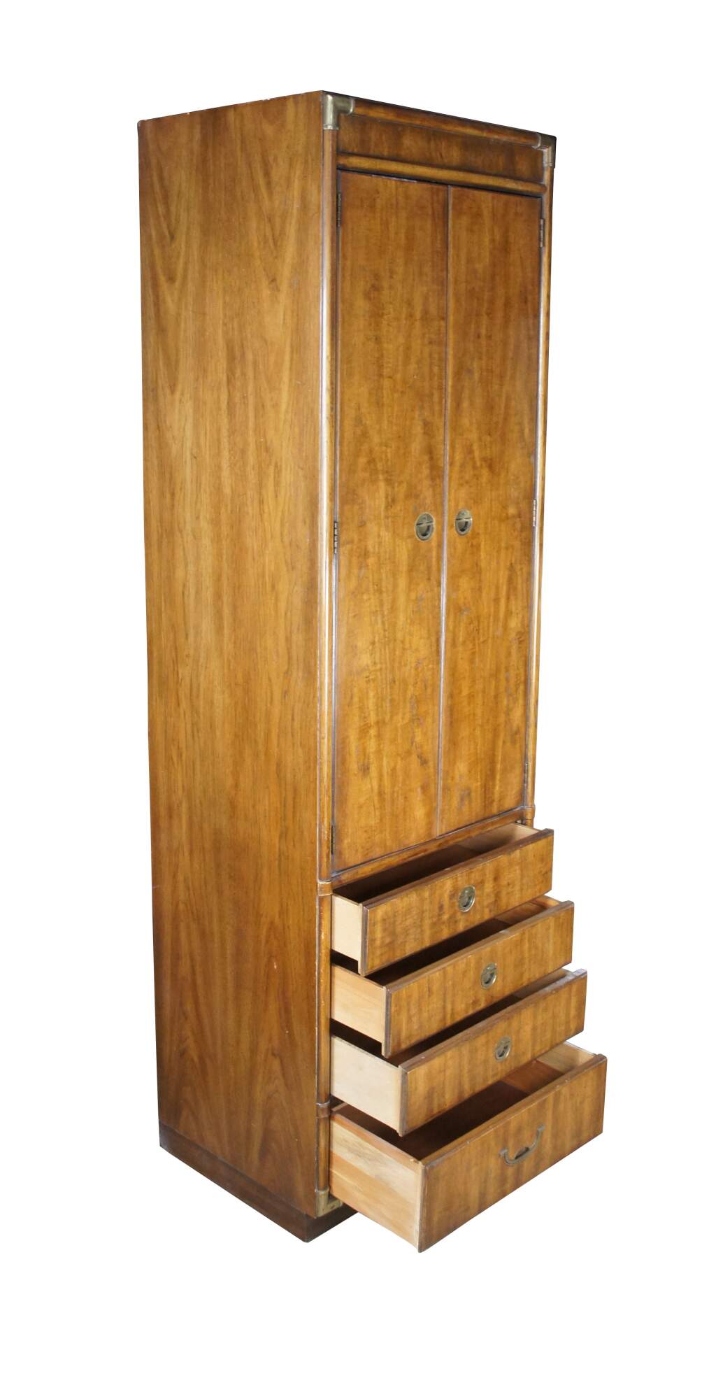 A pair of vintage Drexel Accolade II clothing armoires, cabinets, closets. Made of walnut featuring Campaign styling with divided upper cubbies over lower chest of drawers with brass hardware.