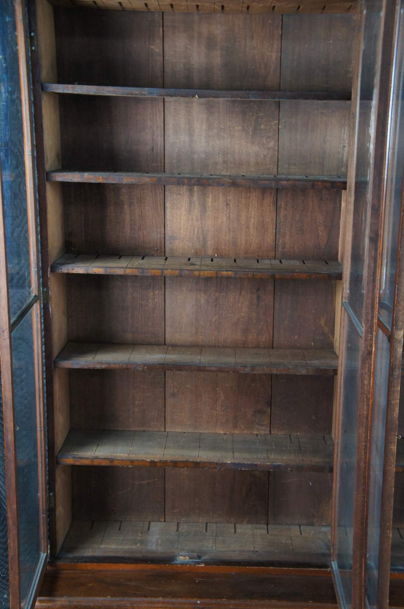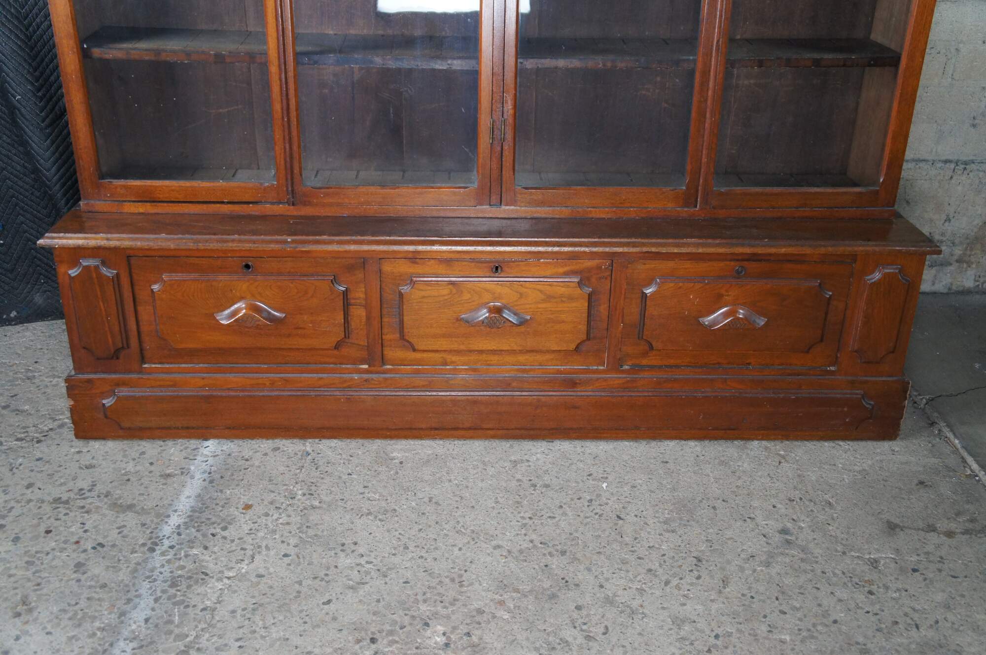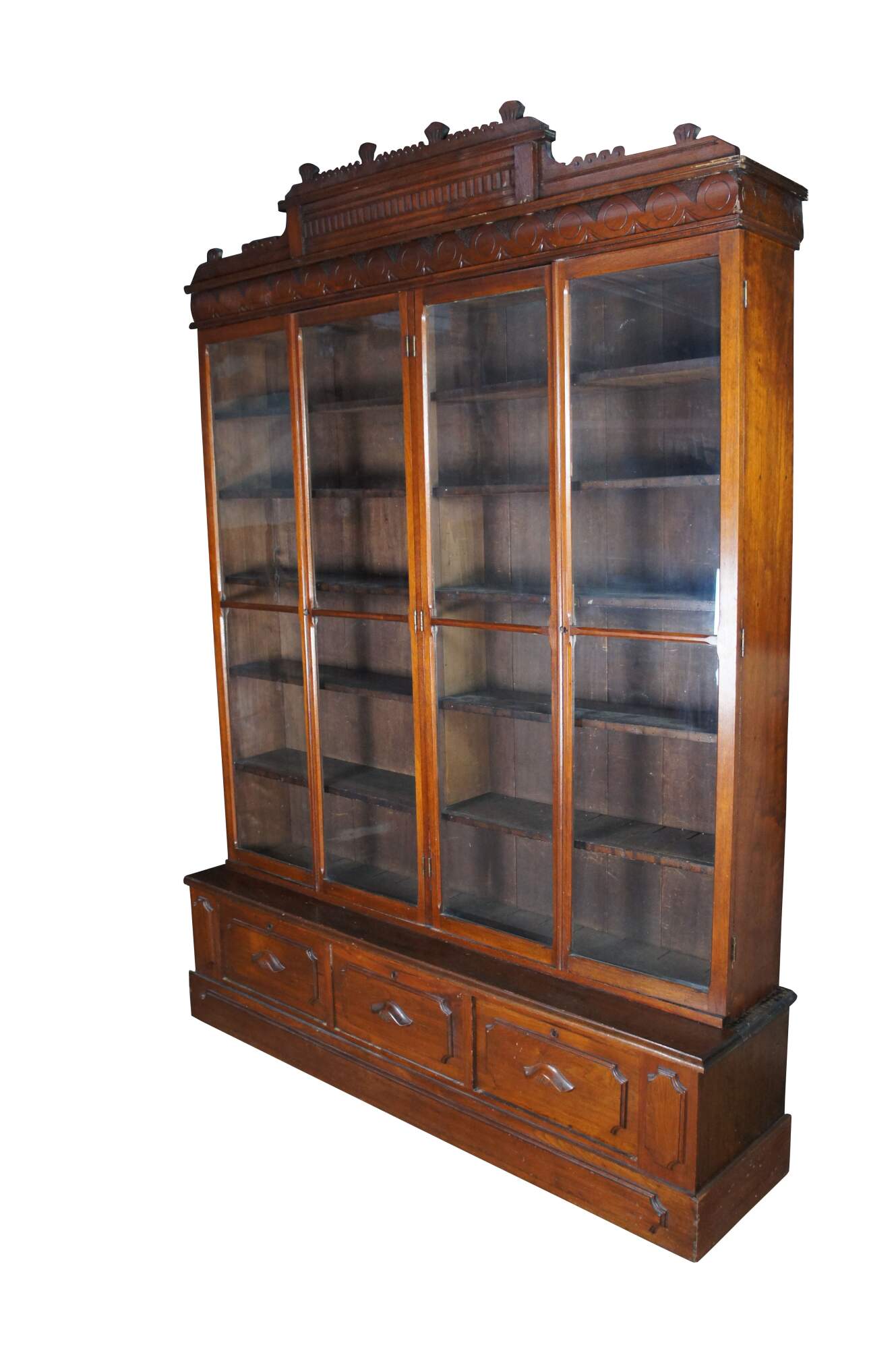 A very large and impressive Antique Victorian stepback library book display case / curio cabinet / showcase. Made of walnut featuring Eastlake styling with large full length / full view doors supported by paneled base with three drawers.