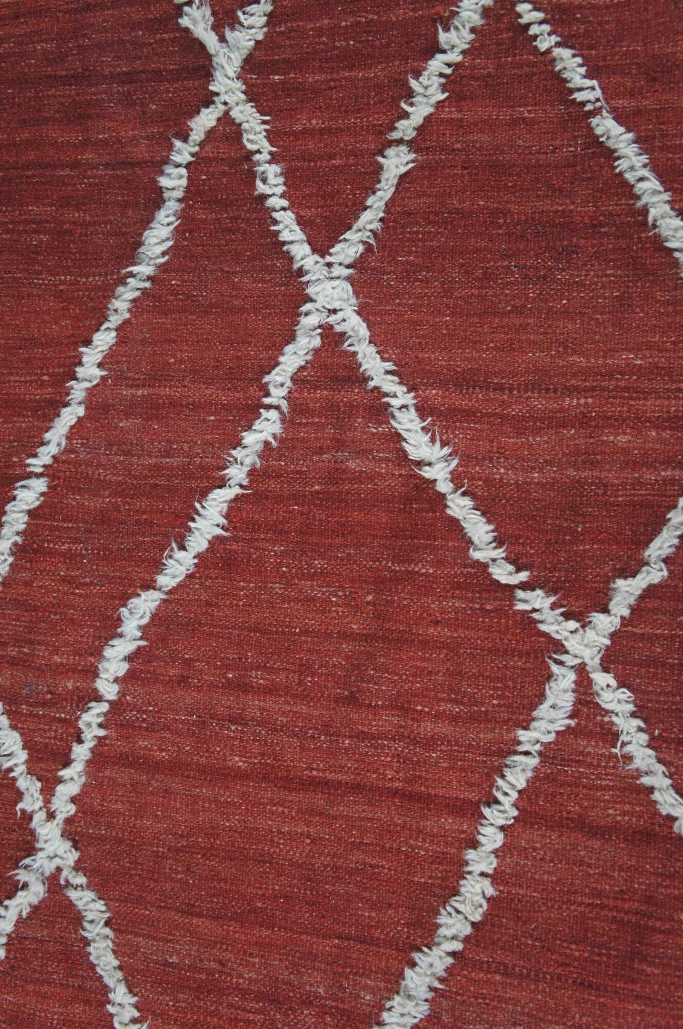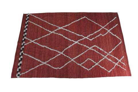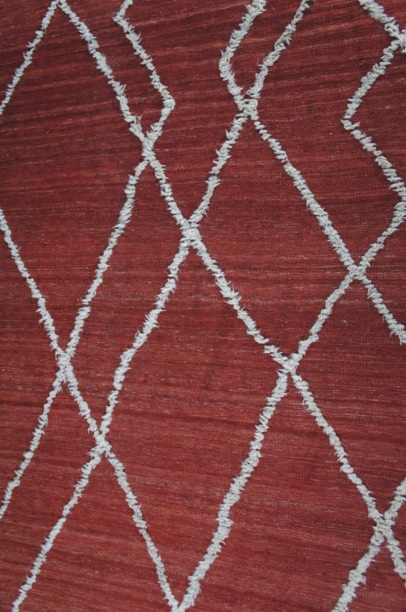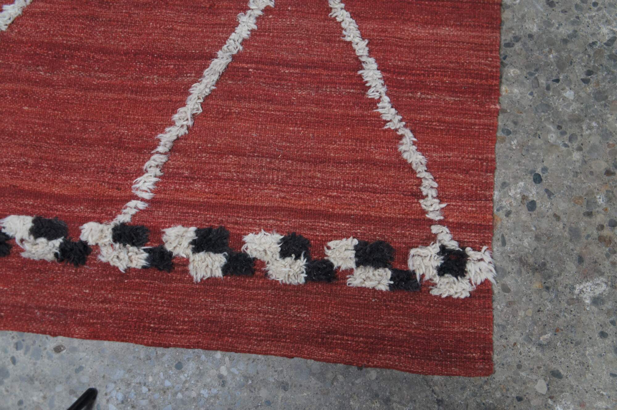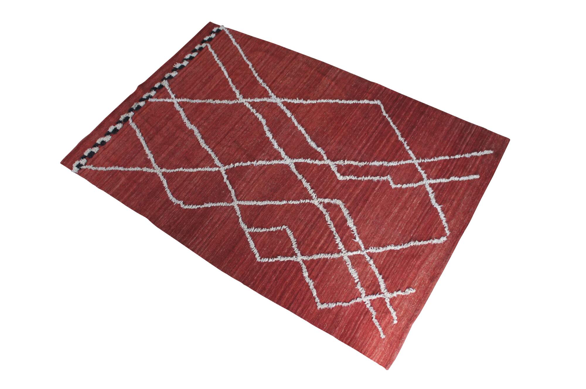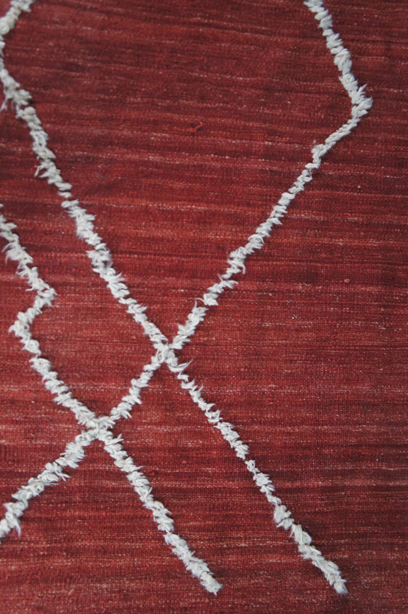 Vintage hand knotted Moroccan style wool kilim area rug with geometric raised fringe pattern that terminates into a checkerboard finish line accent.