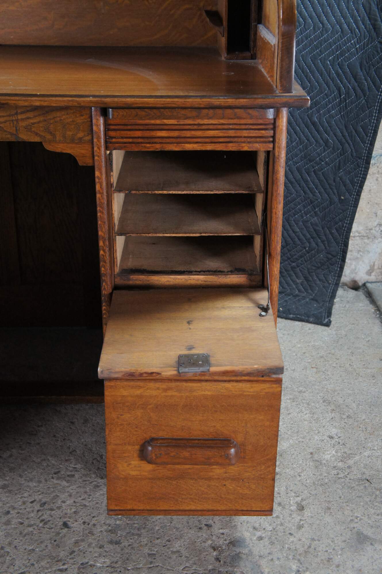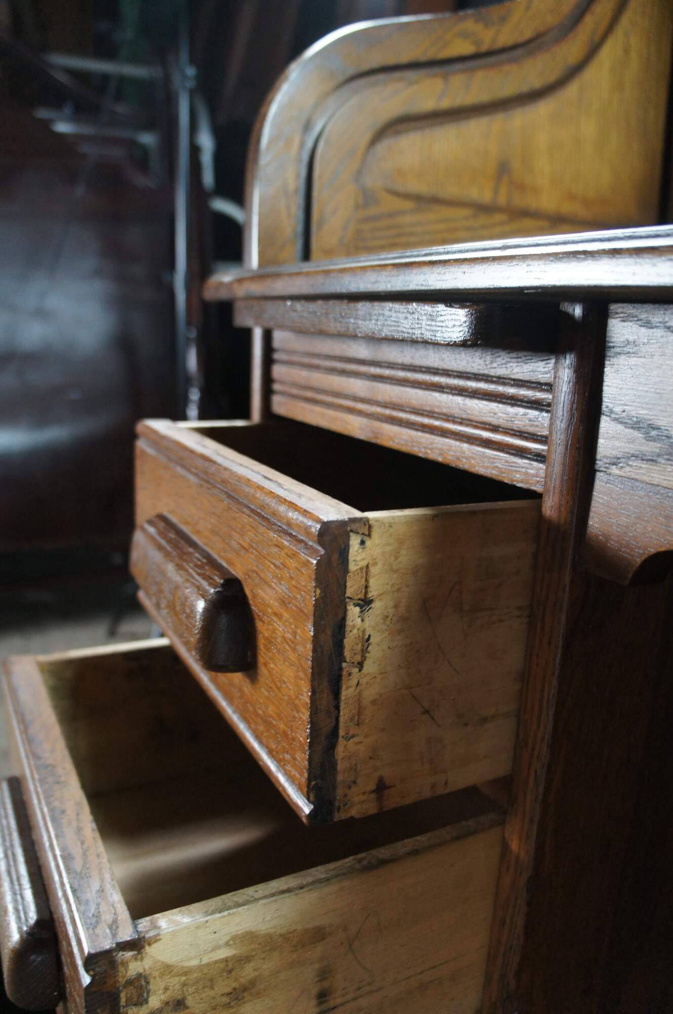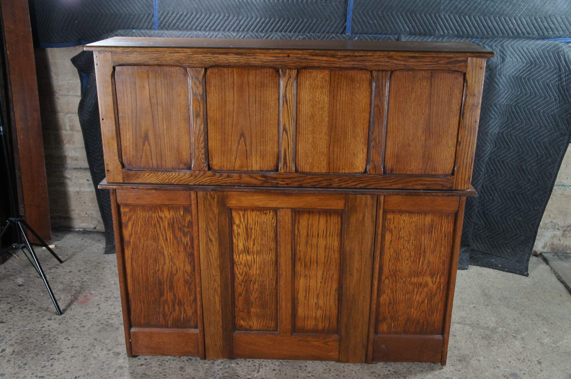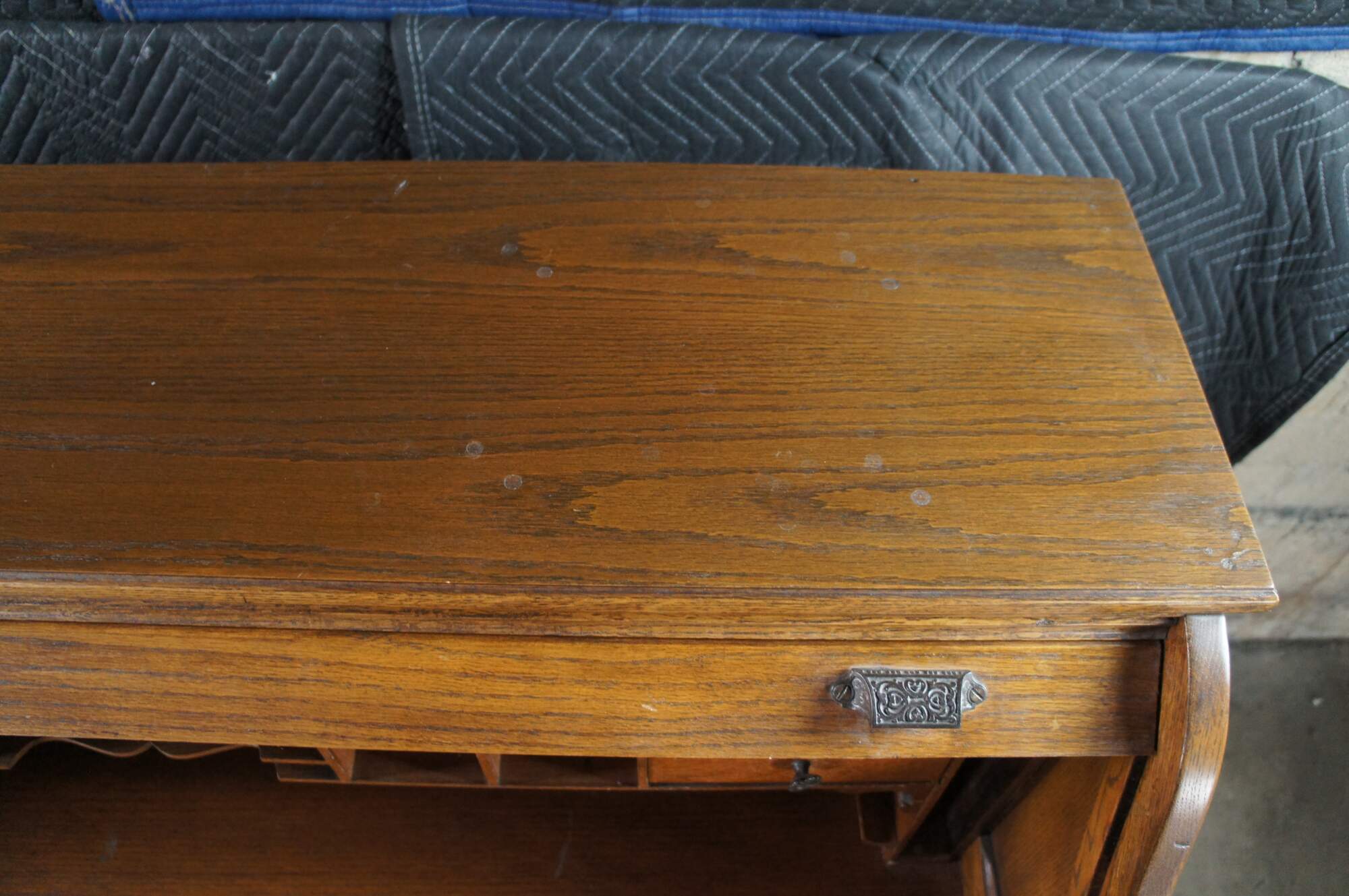 Edge wear, missing trim pieces, missing hardware pin left middle, missing latch uplock, scuffing, fading, exposed hardware / splitting back right.