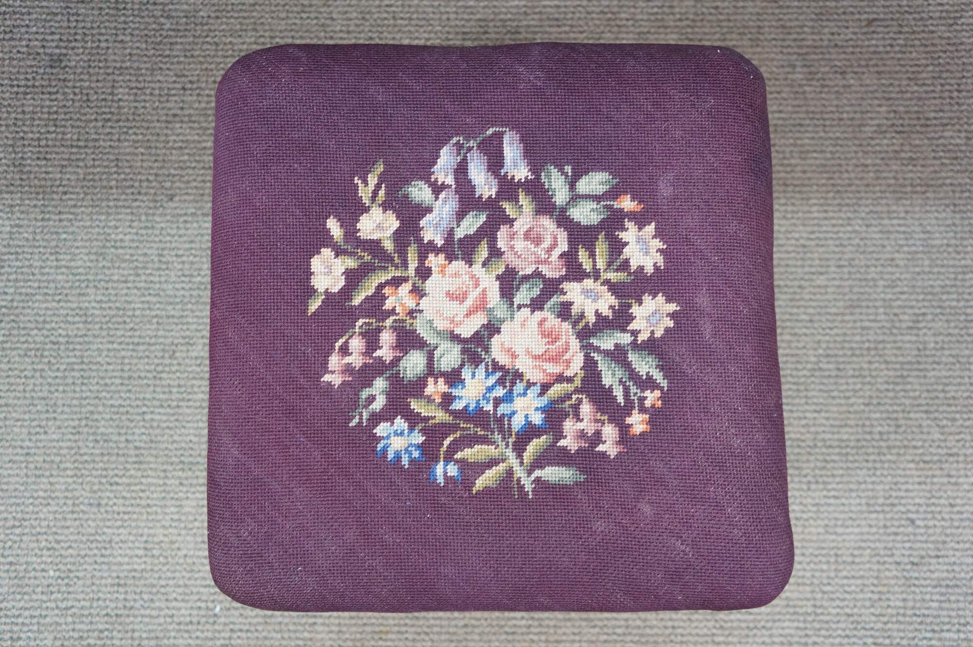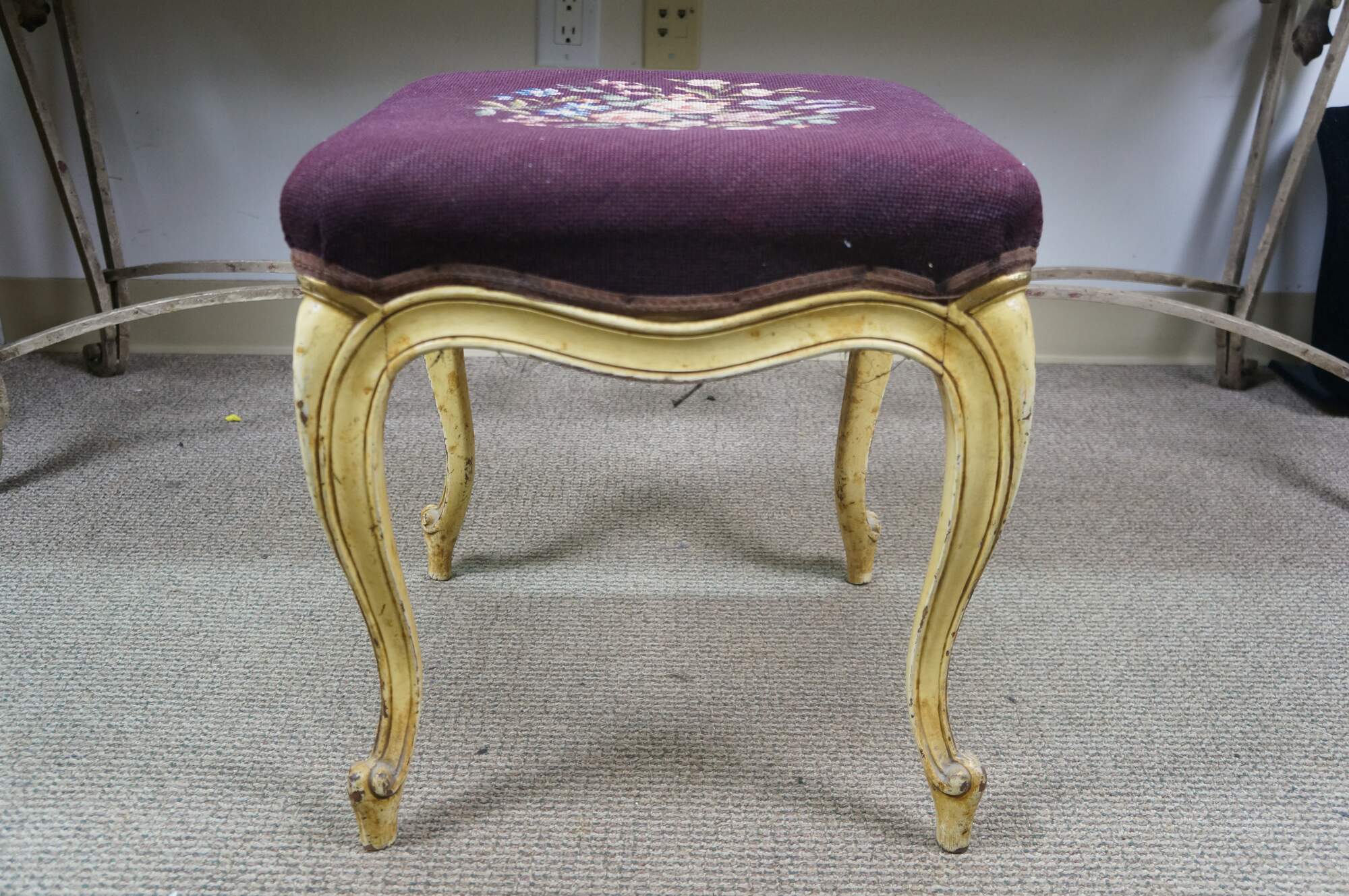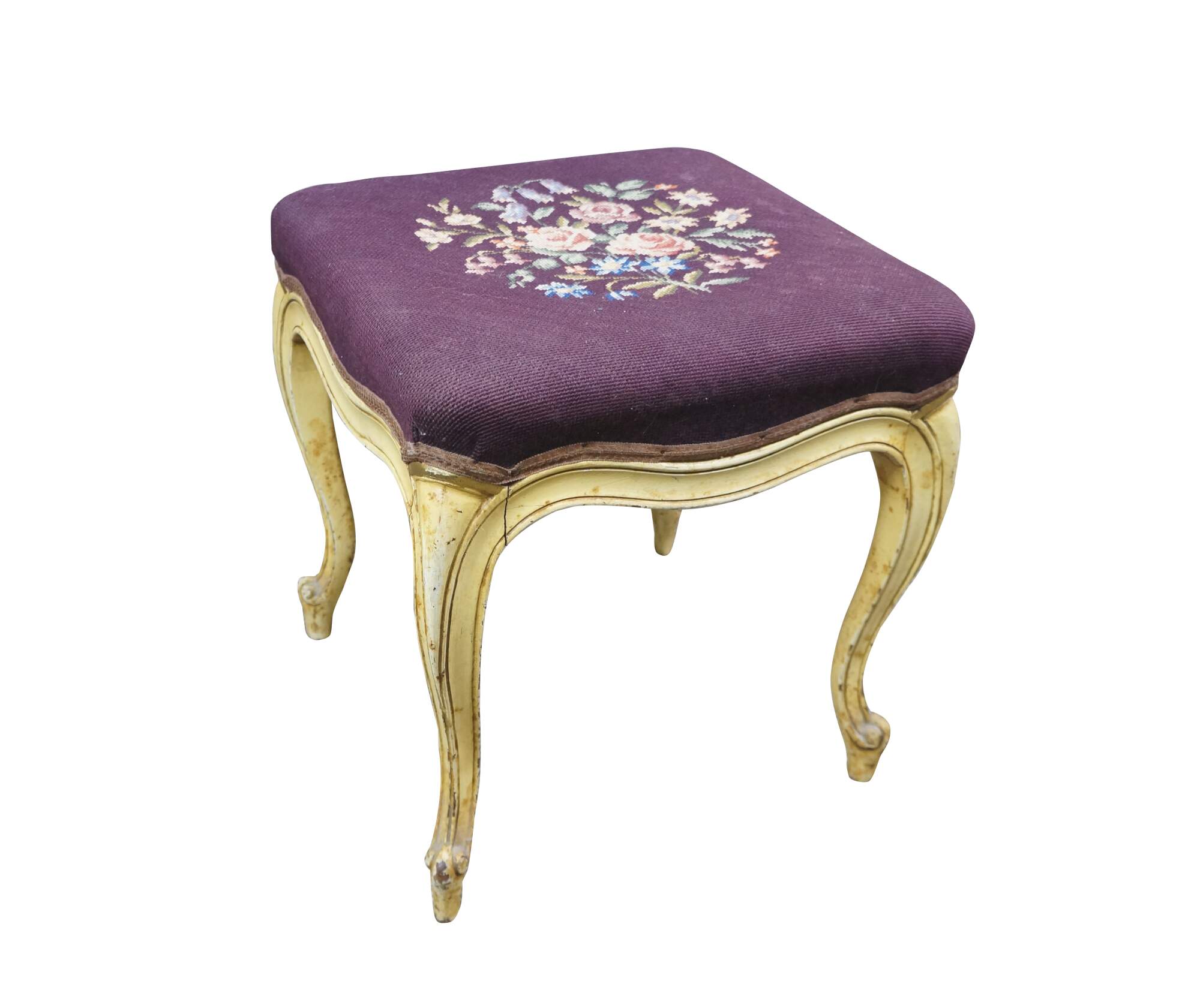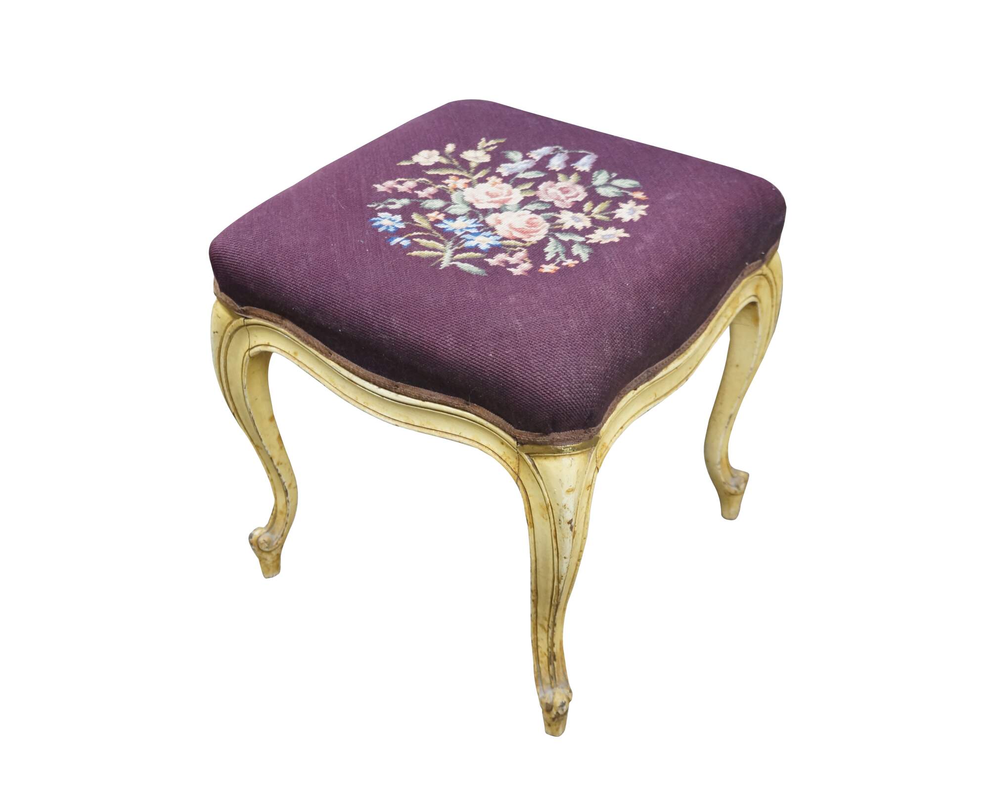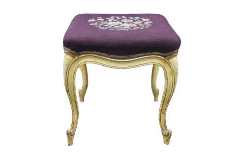 Early to mid 20th century vanity bench / stool. Off white painted cabriole legs; grape purple needlepoint seat embroidered with a bouquet of flowers. French provincial / Queen Anne / Victorian styling.