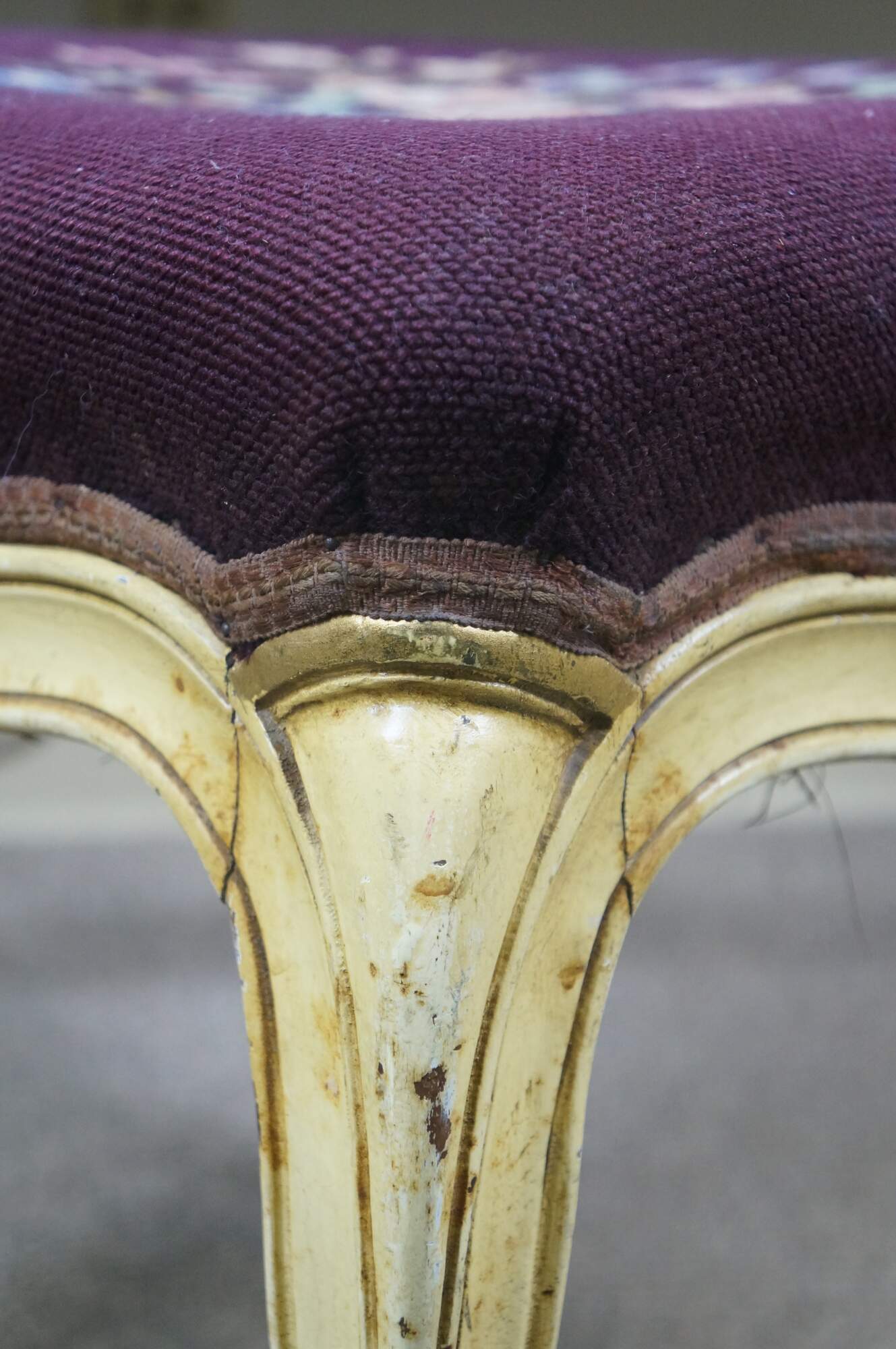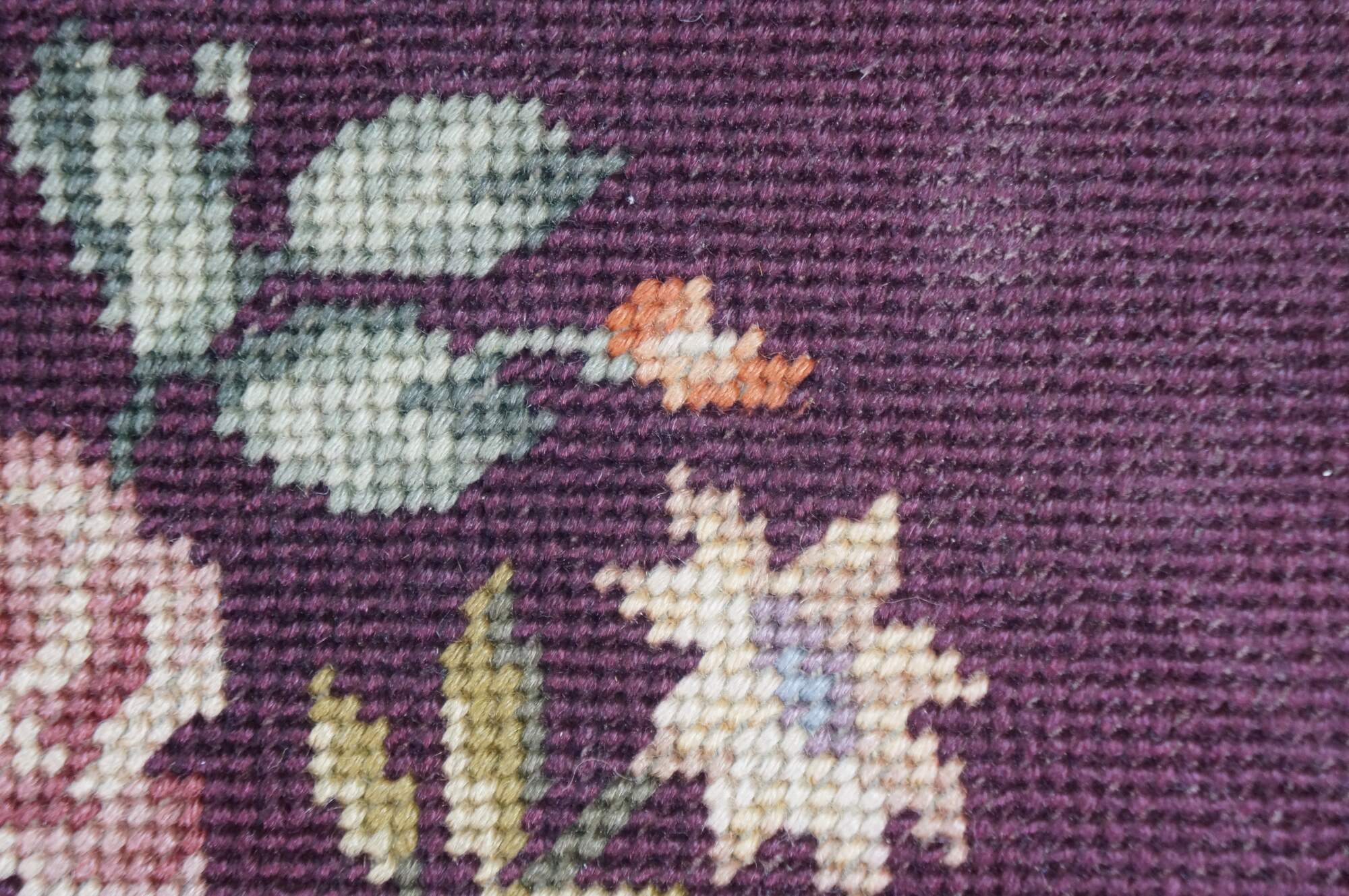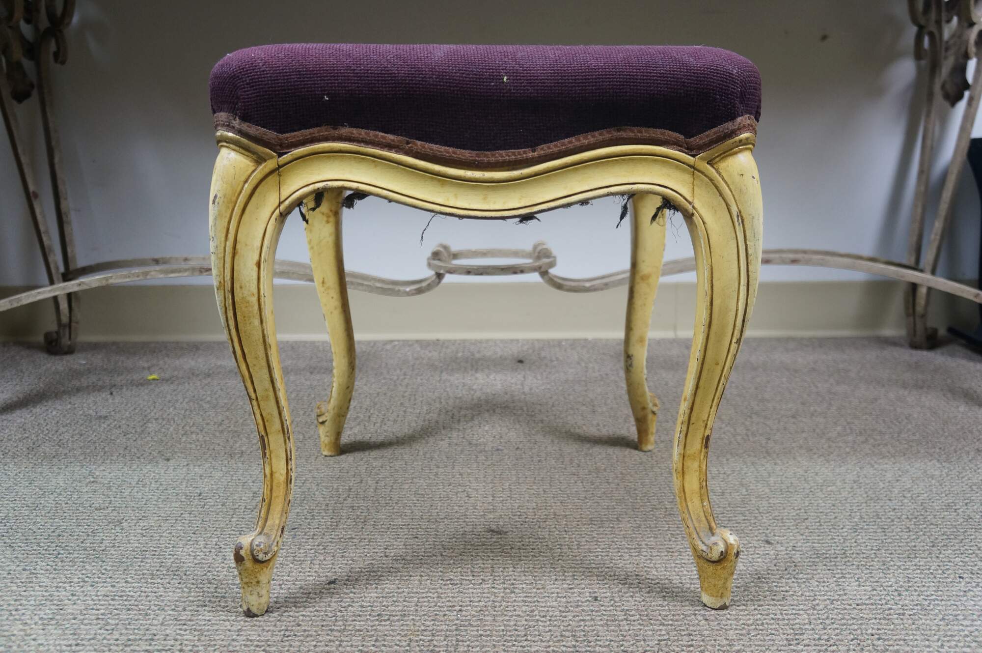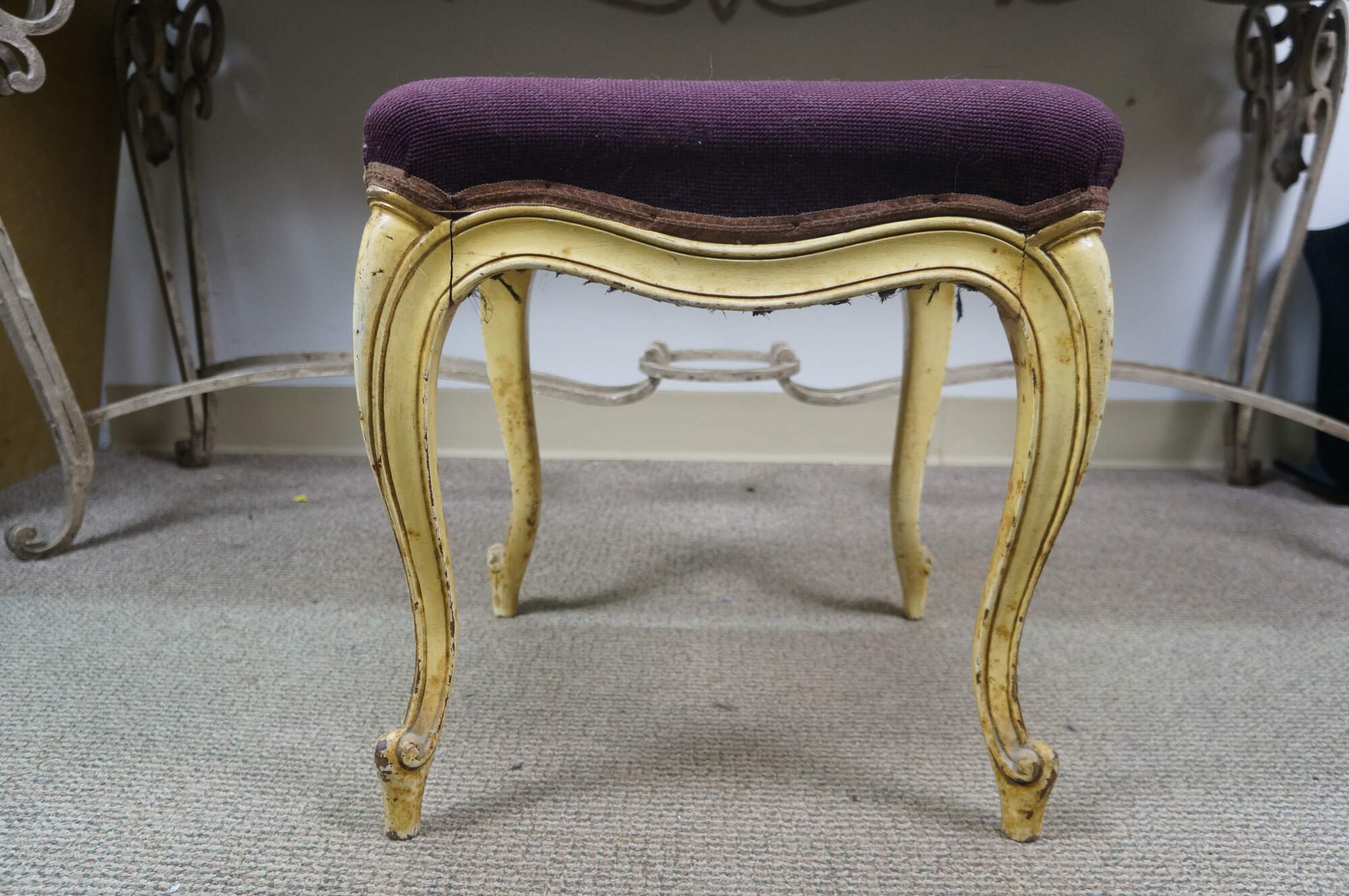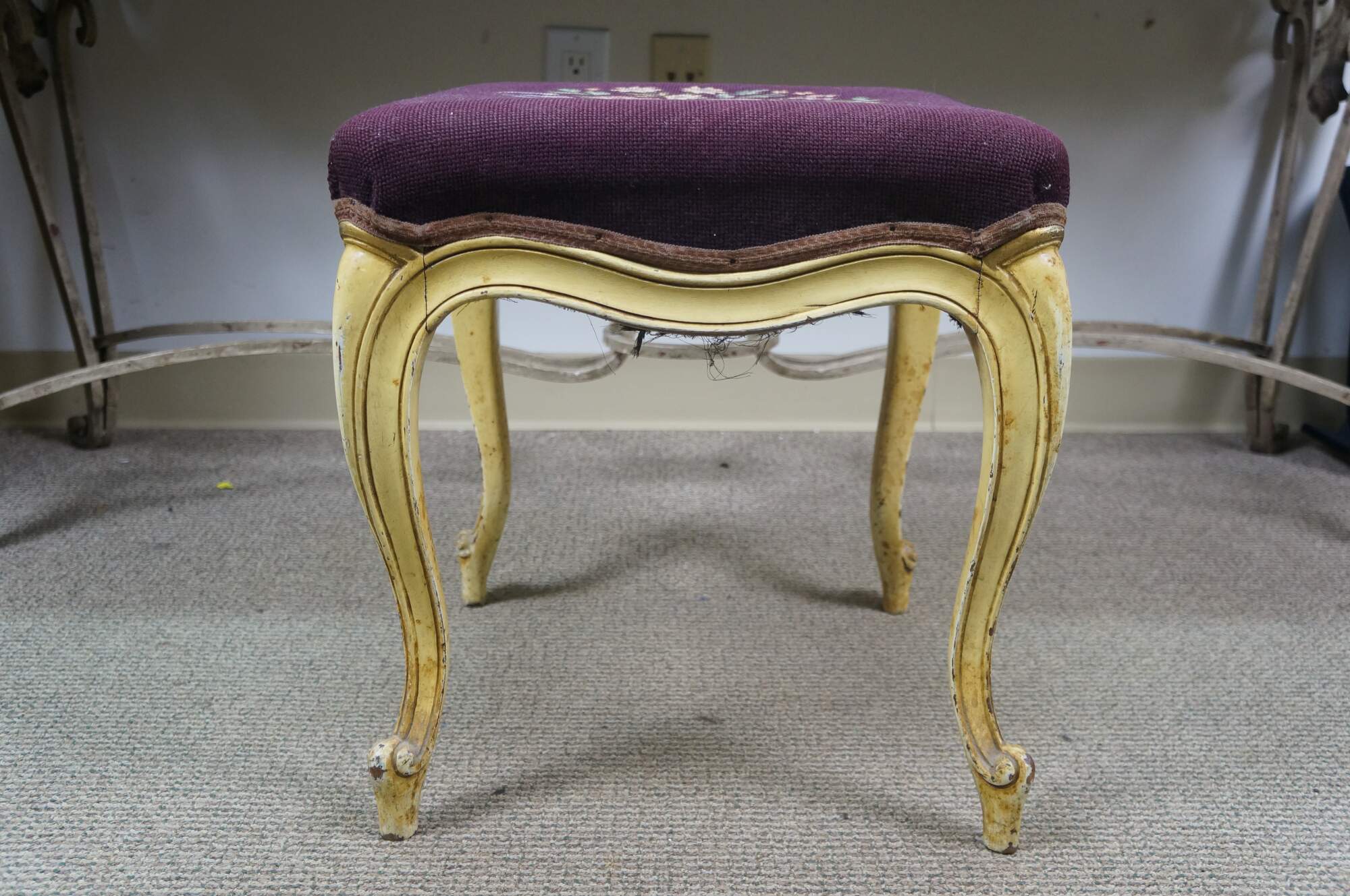 Early to mid 20th century vanity bench / stool. Off white painted cabriole legs; grape purple needlepoint seat embroidered with a bouquet of flowers. French provincial / Queen Anne / Victorian styling.