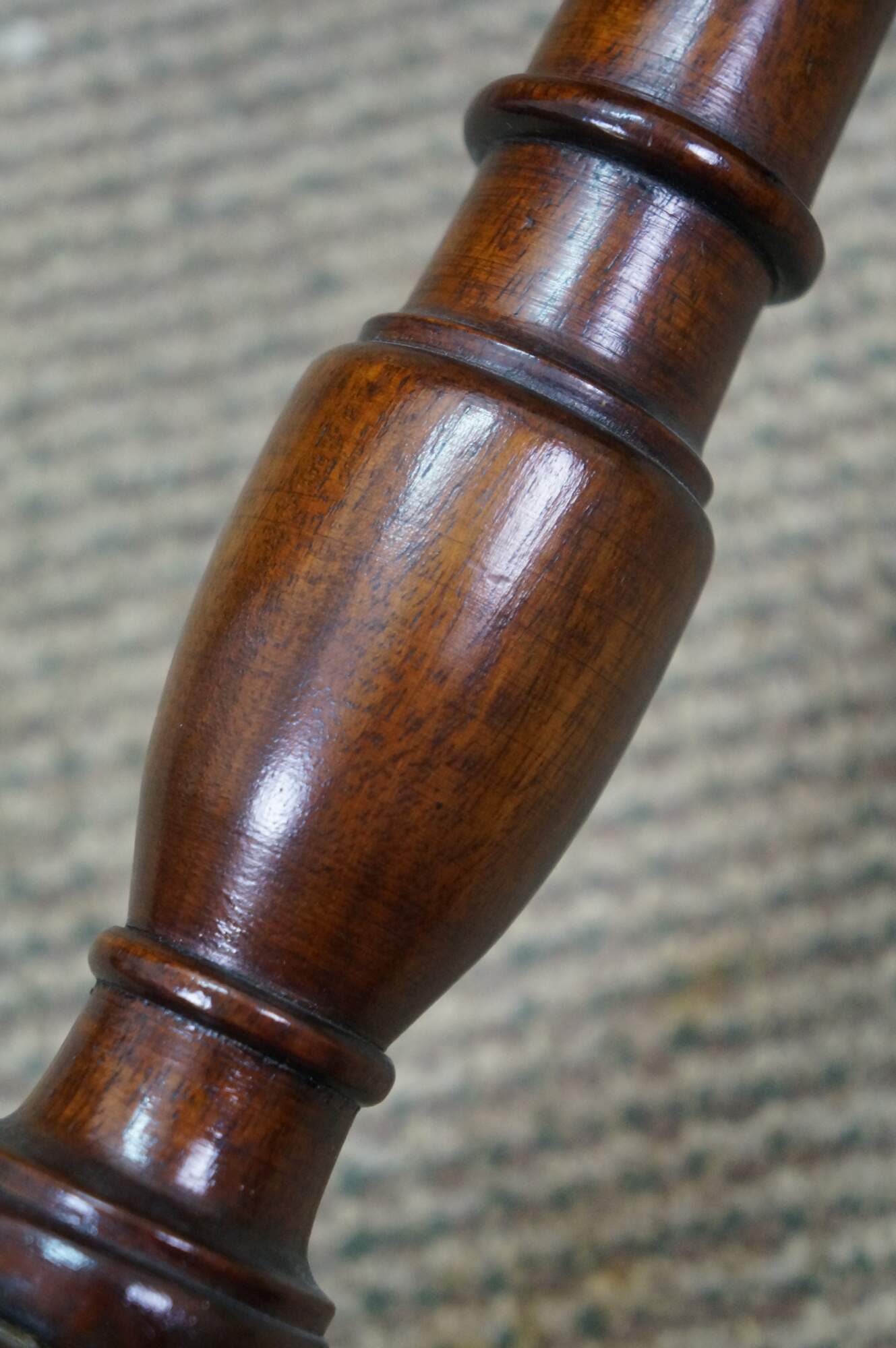 Circa mid 20th century mahogany candle / plant stand with round top, turned pedestal base and tripod feet. Top screws onto base. Made in England.