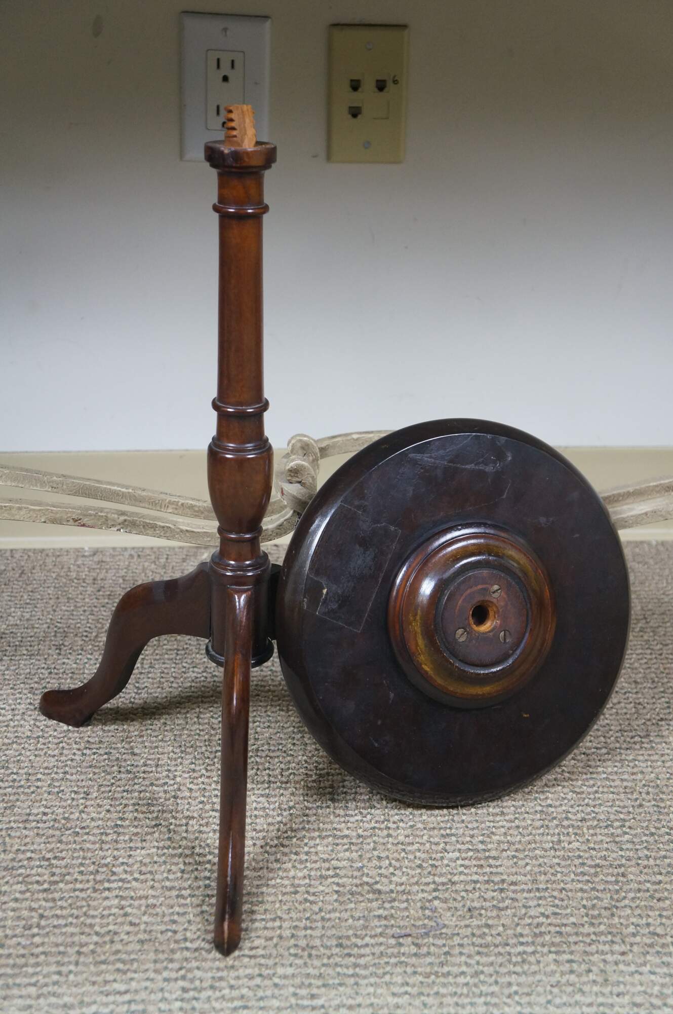 Good Overall - scuffing/finish loss/water spots; damage to wood screw - does not affect stability; one loose leg.