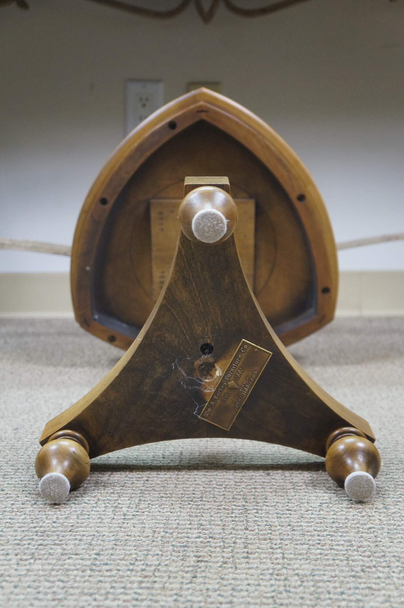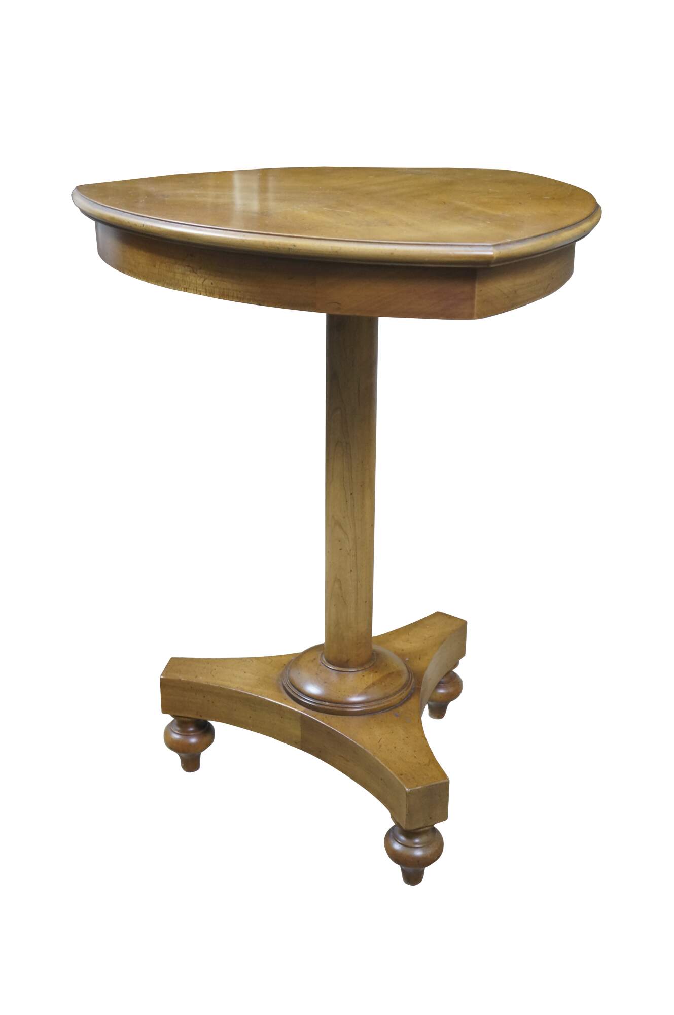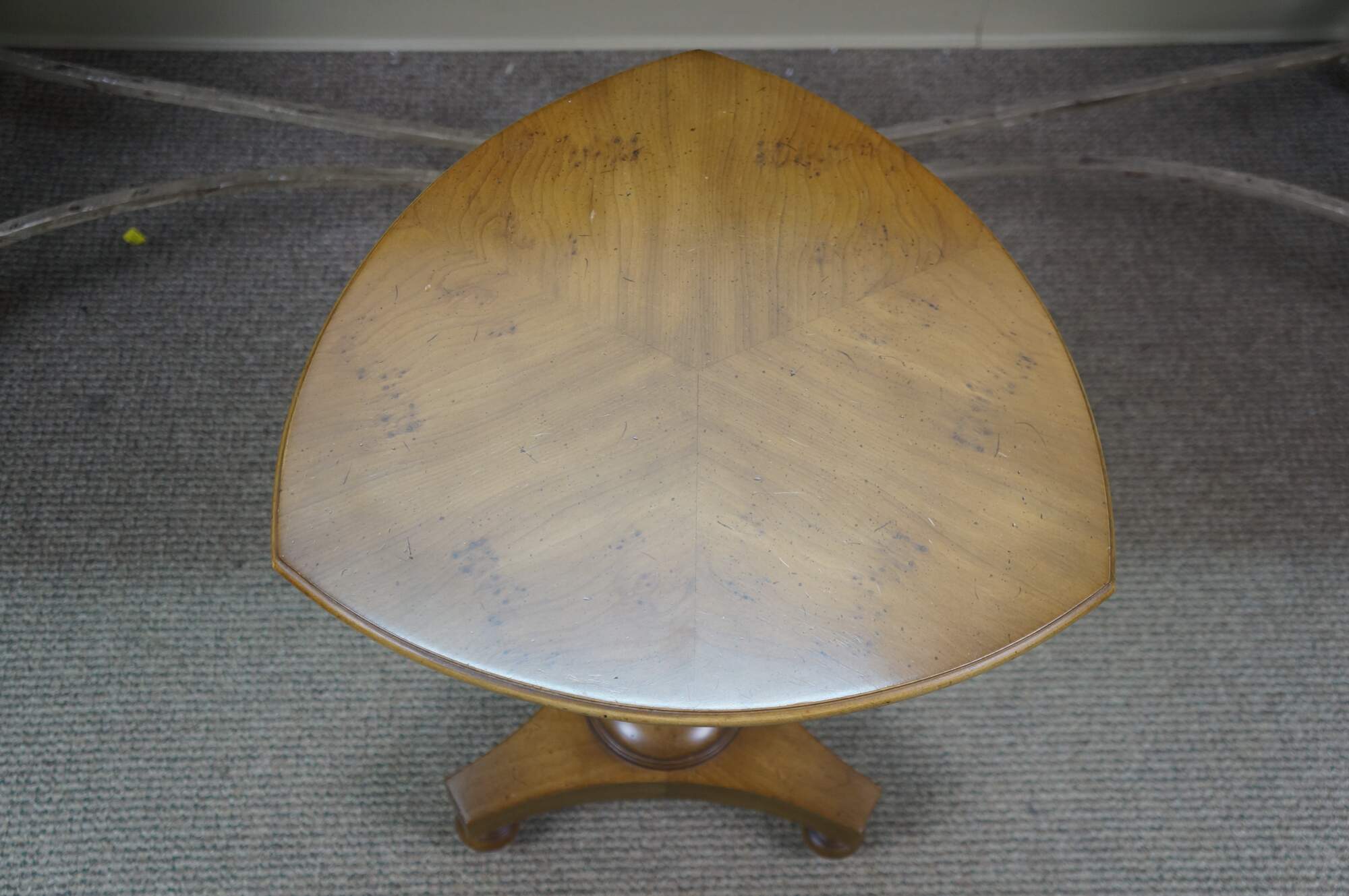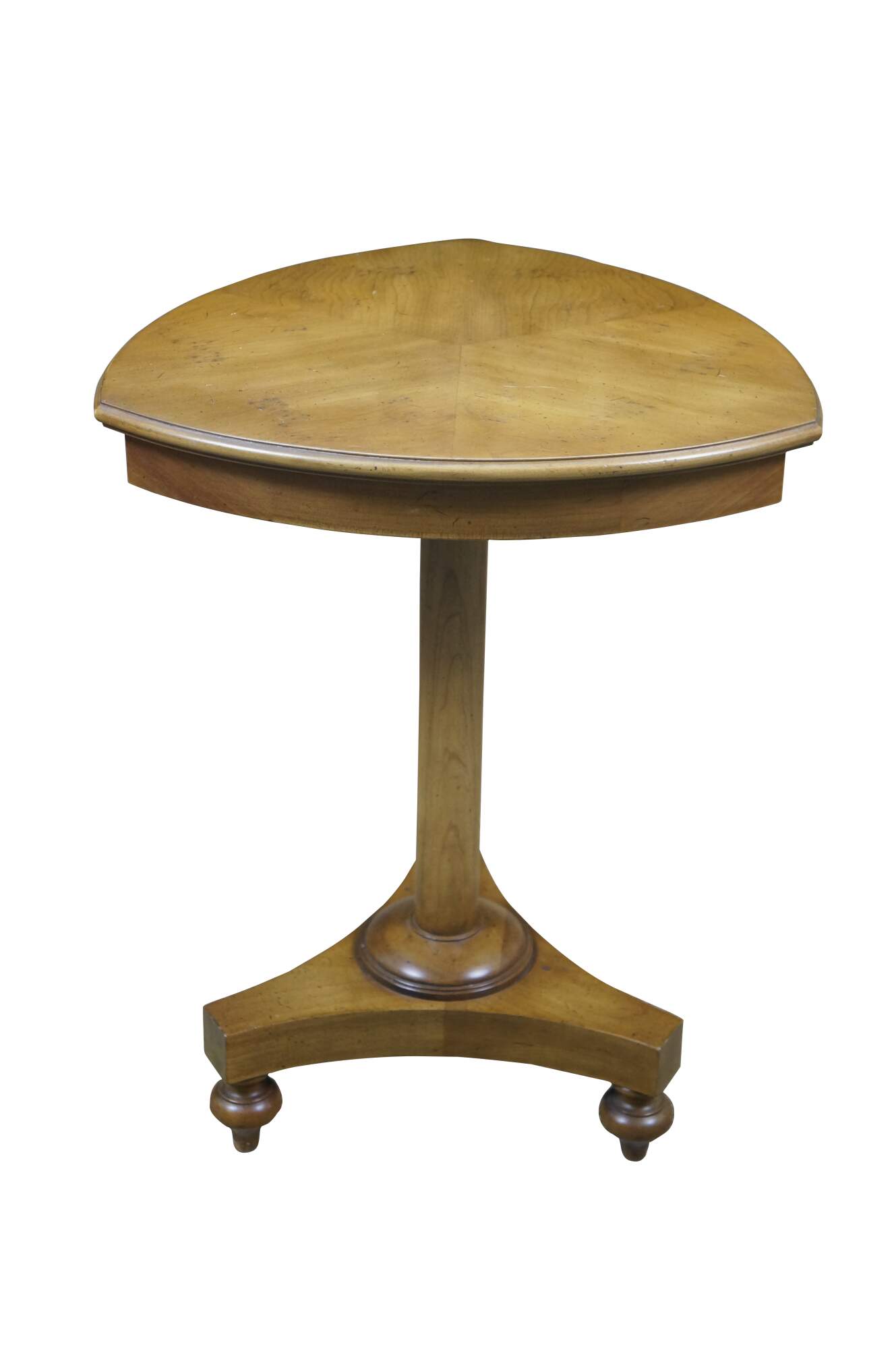 Mid century William A. Berkey / John Widdicomb Olive wood side / end / accent table. Rounded triangular top with pedestal base and onion shaped feet.