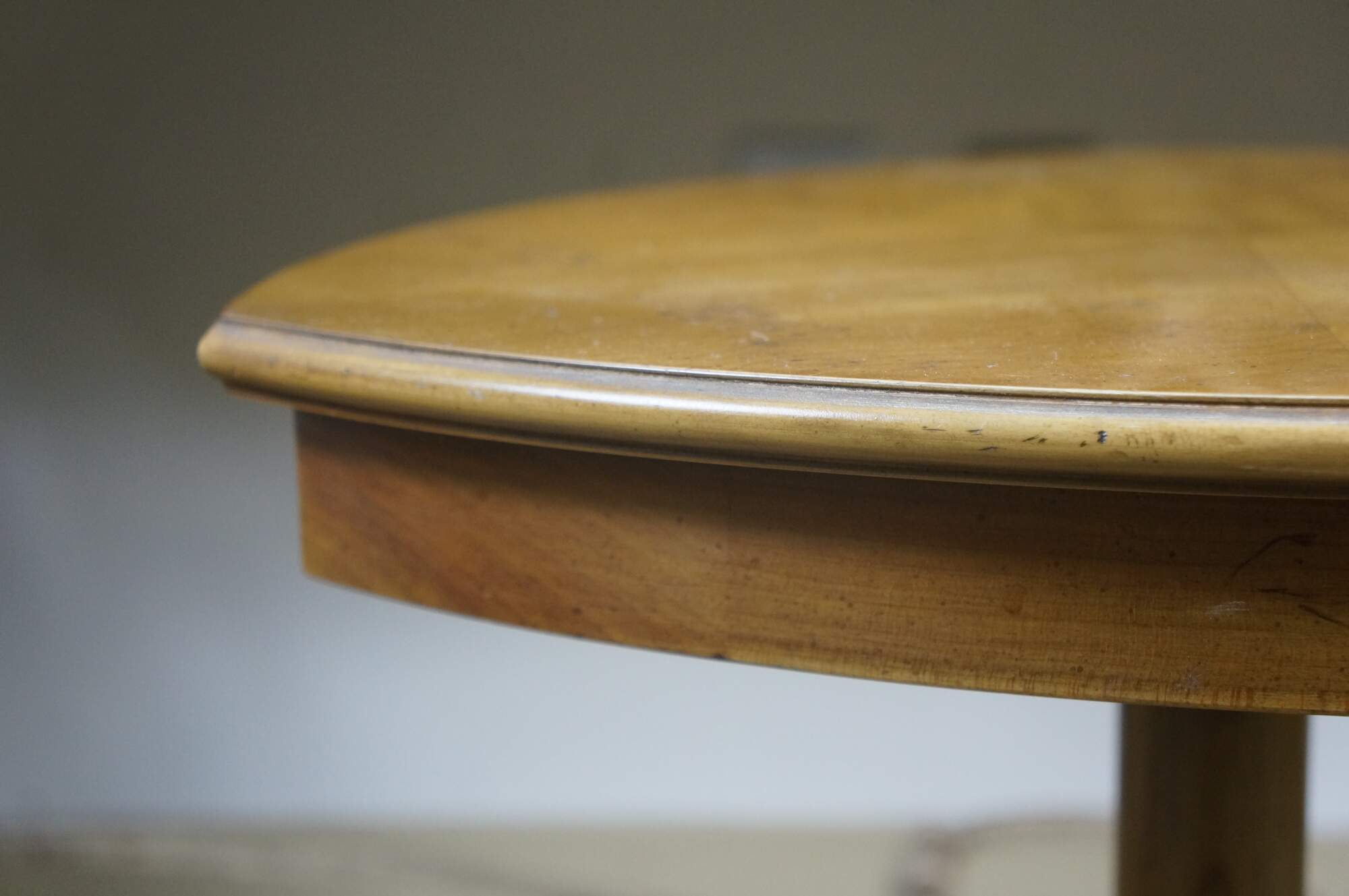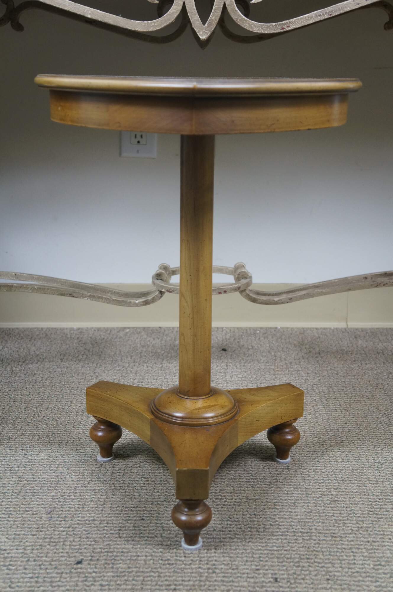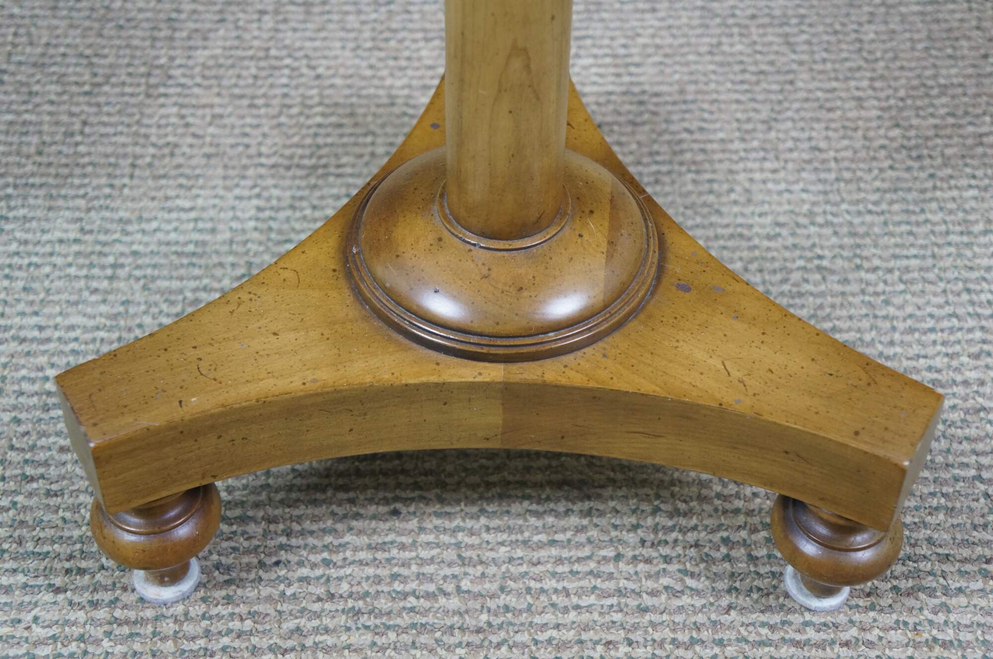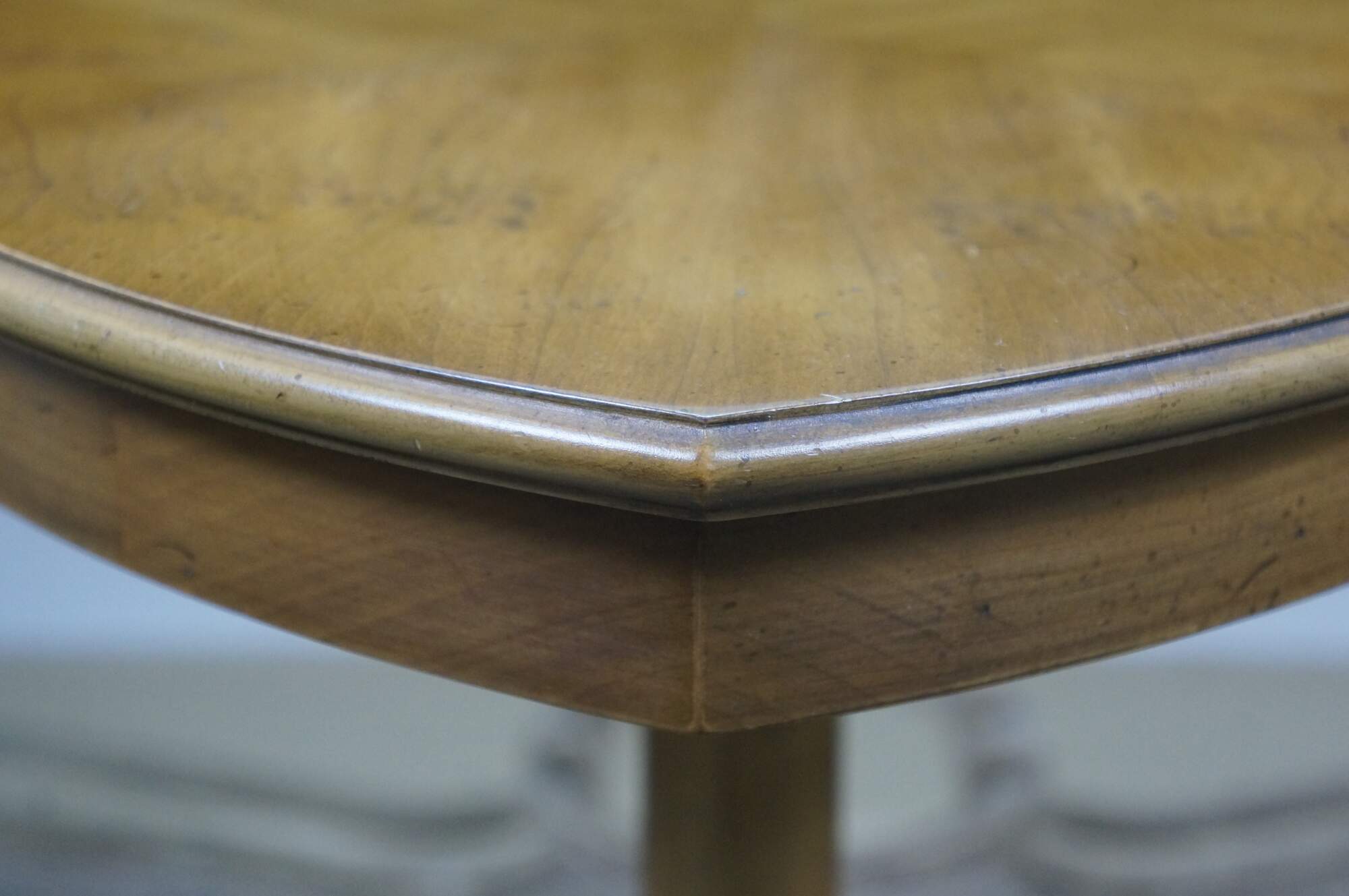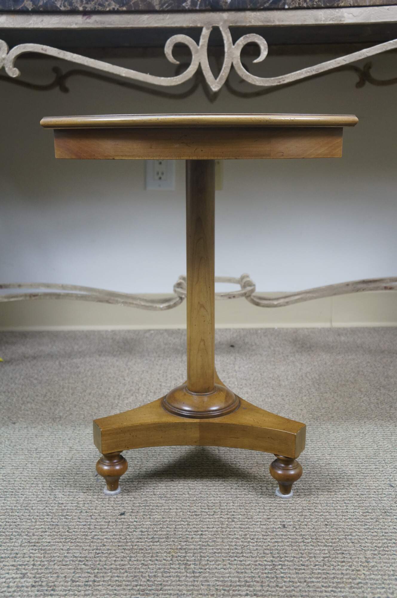 Mid century William A. Berkey / John Widdicomb Olive wood side / end / accent table. Rounded triangular top with pedestal base and onion shaped feet.