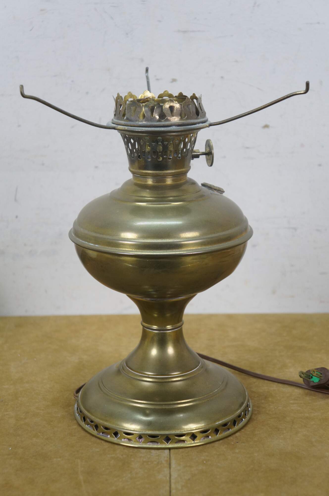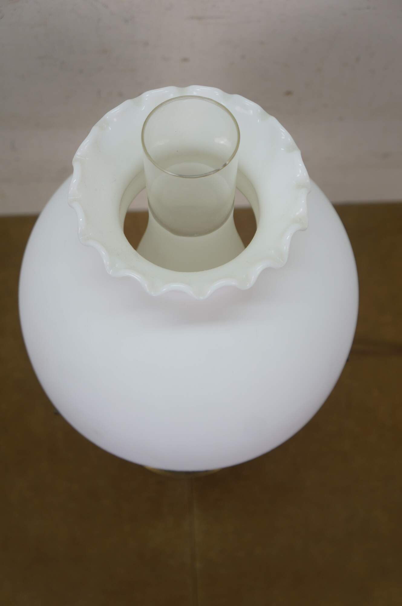 Early 20th century Mantle Lamp company Aladdin brass oil lamp with hurricane and matte milk glass shade with ruffled top. Converted to electric with push button switch.