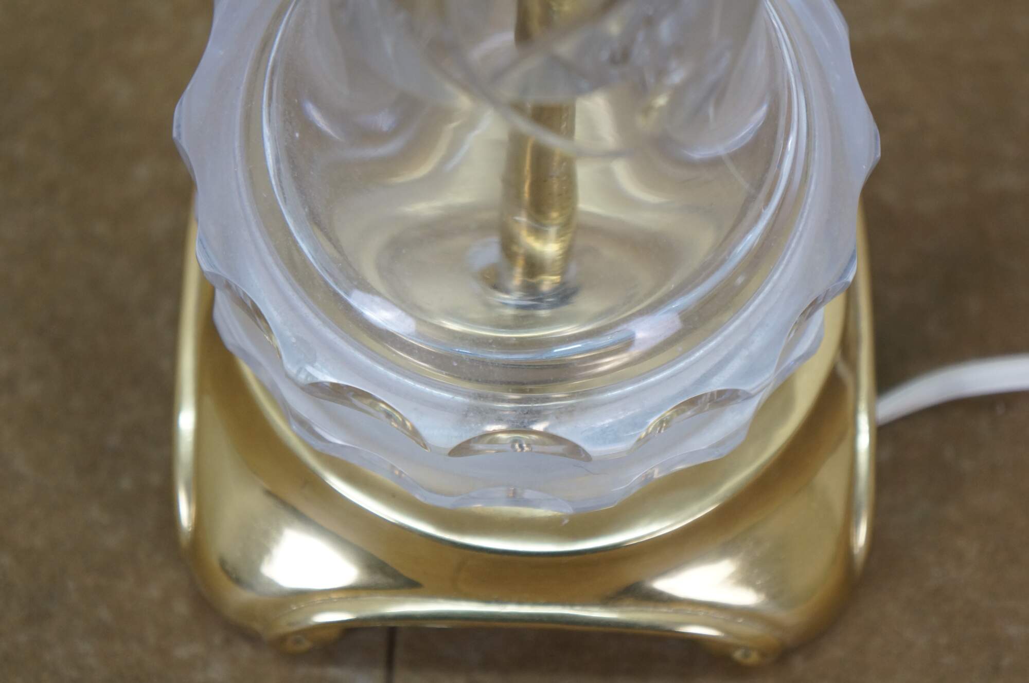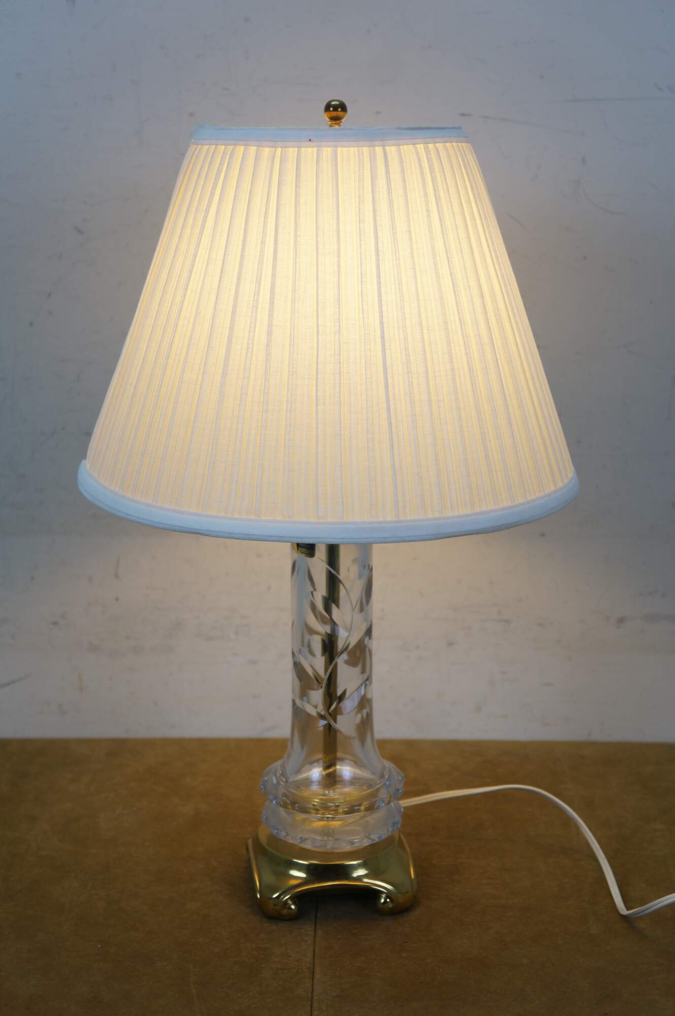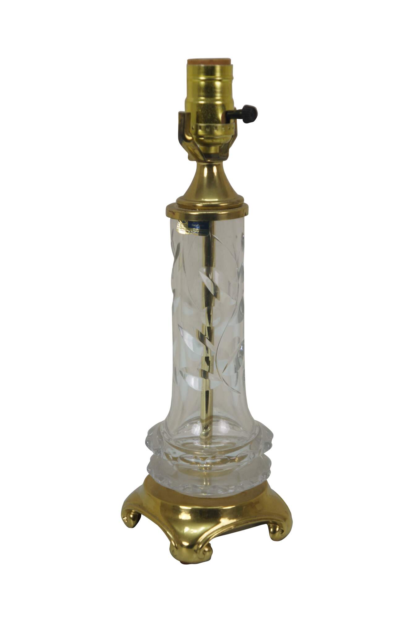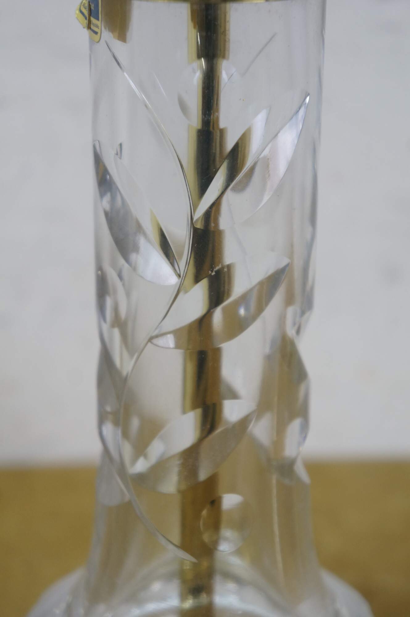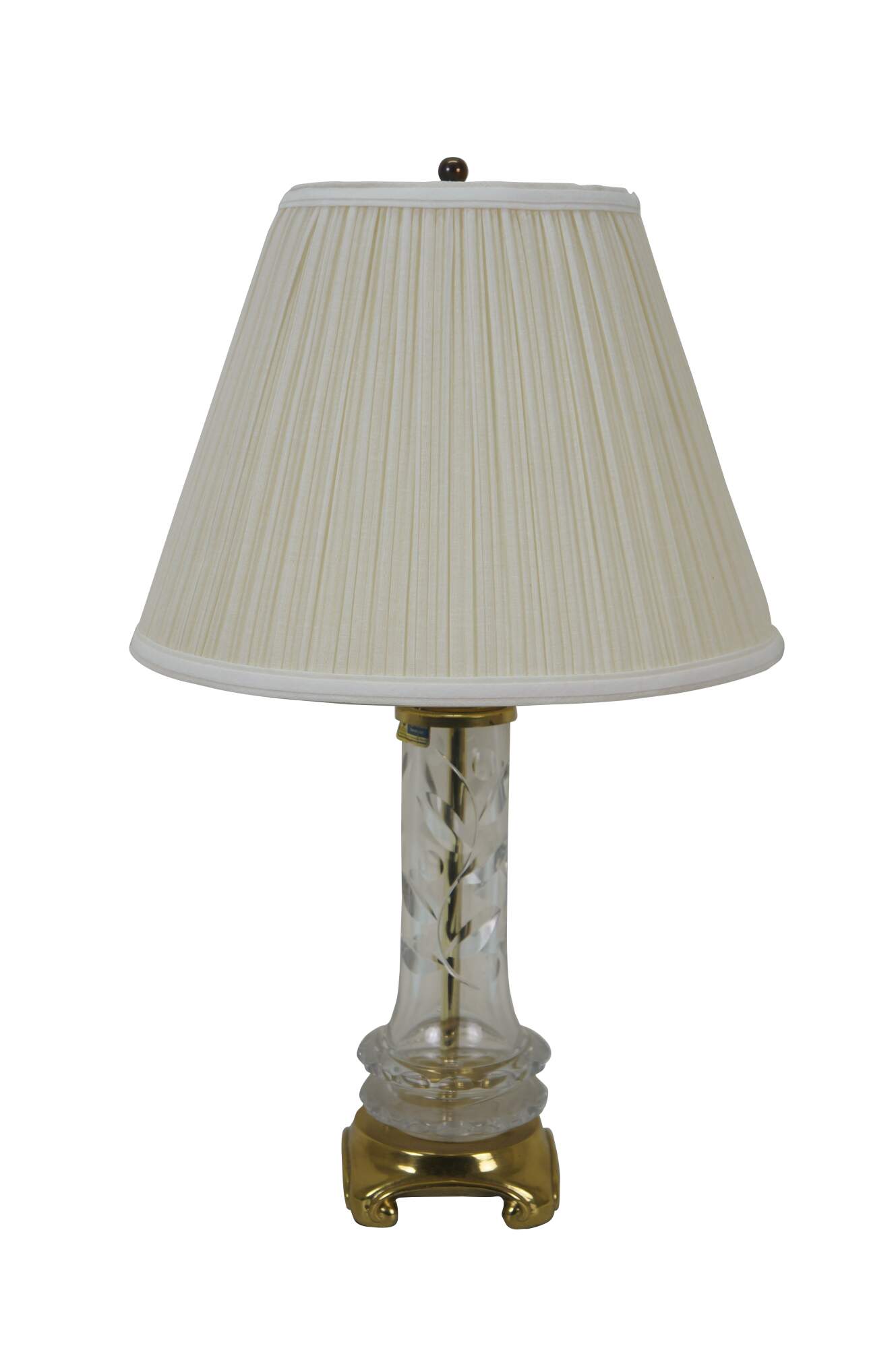 Mid to late 20th century Lausitzer Glas hand cut crystal table lamp. Hollywood Regency styled column cut with a leafy acanthus foliate vine on a square brass base. Includes harp, brass finial, and white fabric shade. Made in the German Democratic Republic.