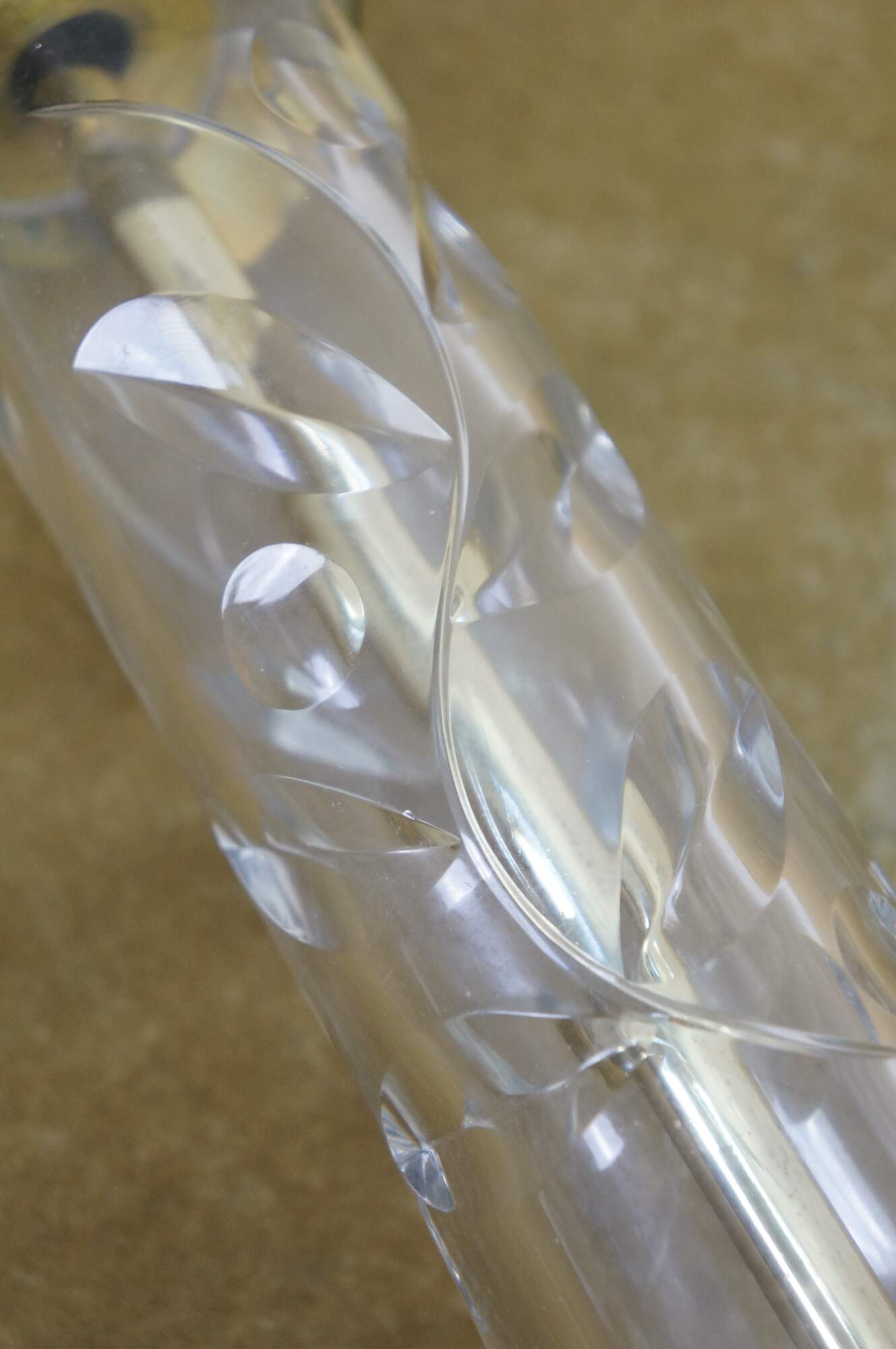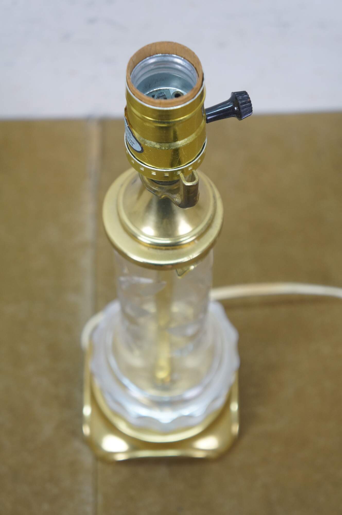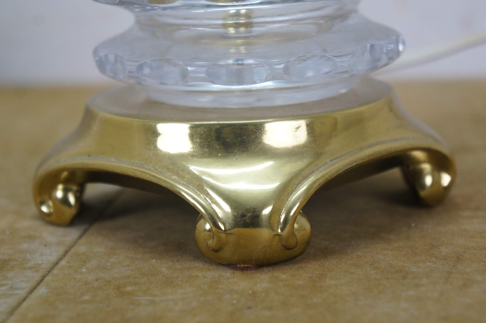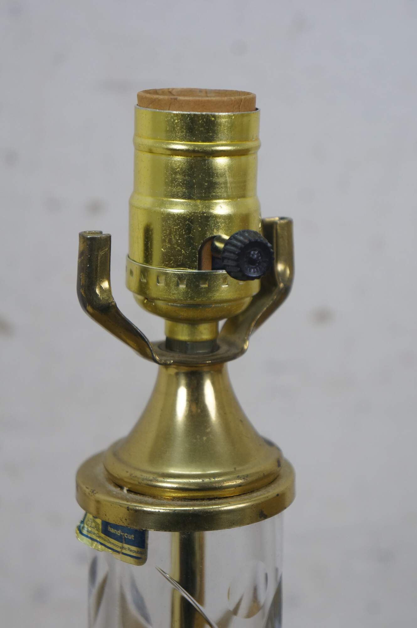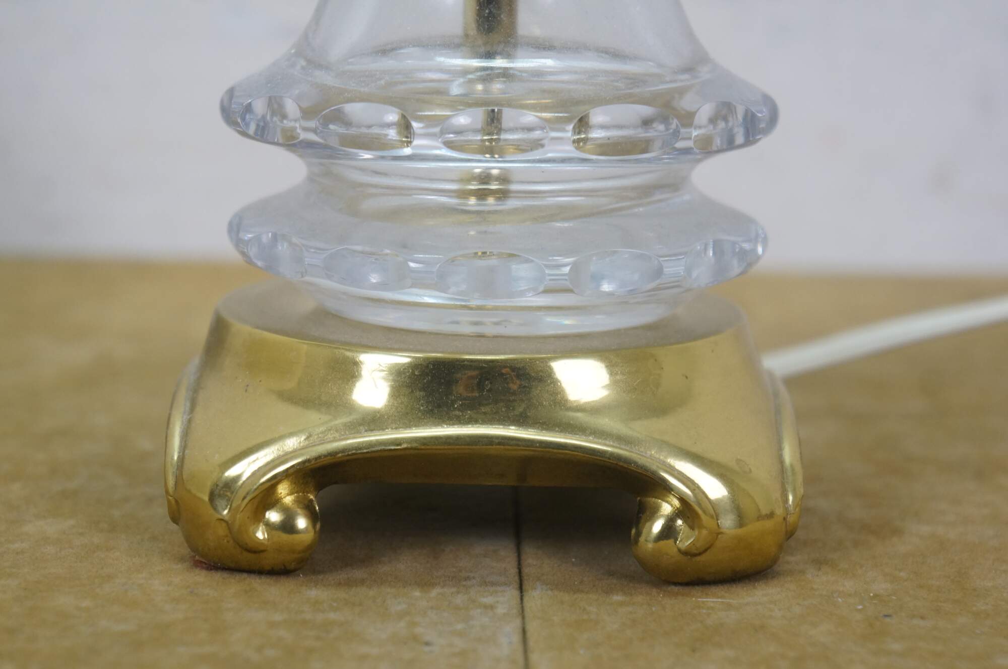 Mid to late 20th century Lausitzer Glas hand cut crystal table lamp. Hollywood Regency styled column cut with a leafy acanthus foliate vine on a square brass base. Includes harp, brass finial, and white fabric shade. Made in the German Democratic Republic.