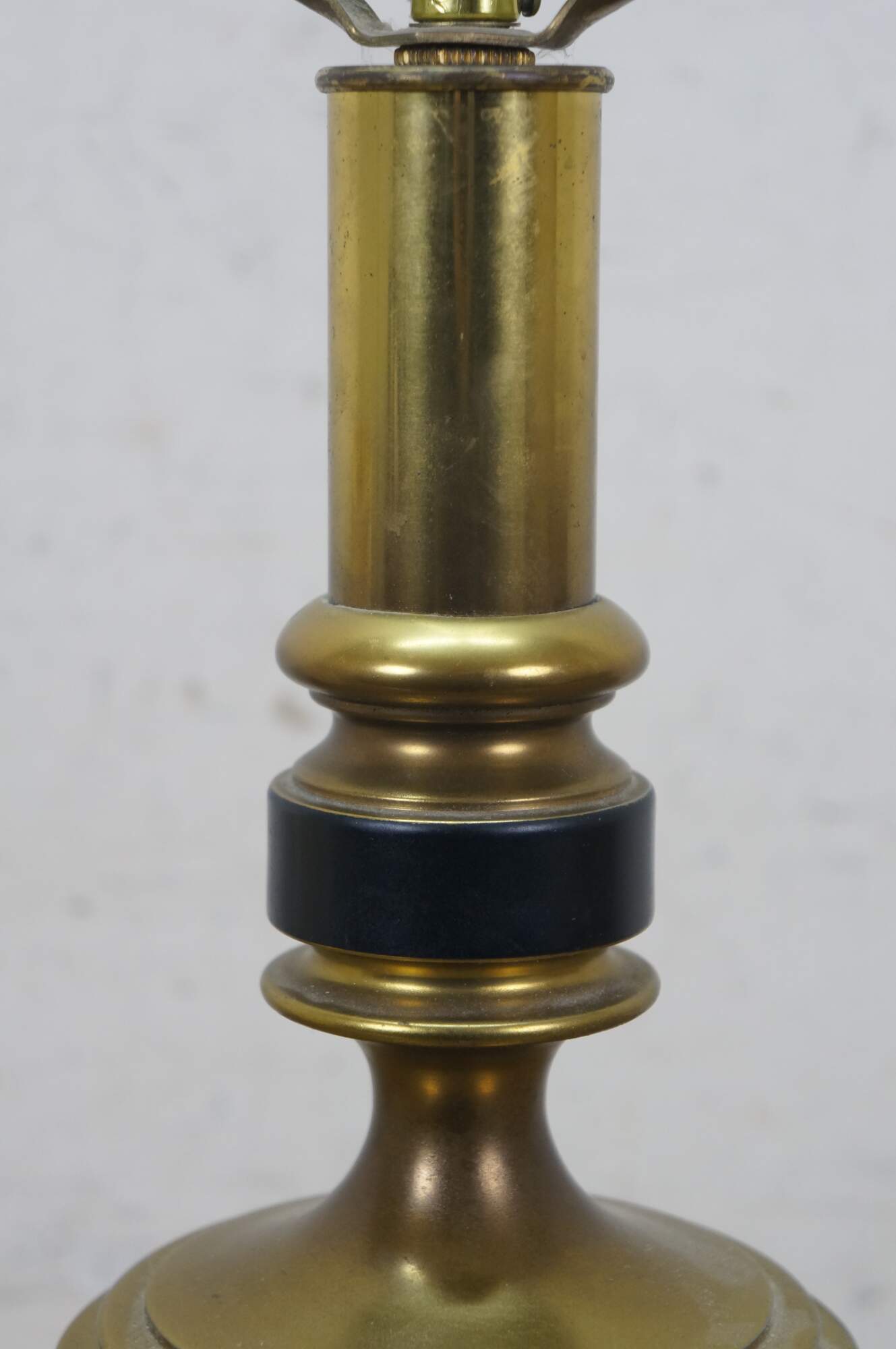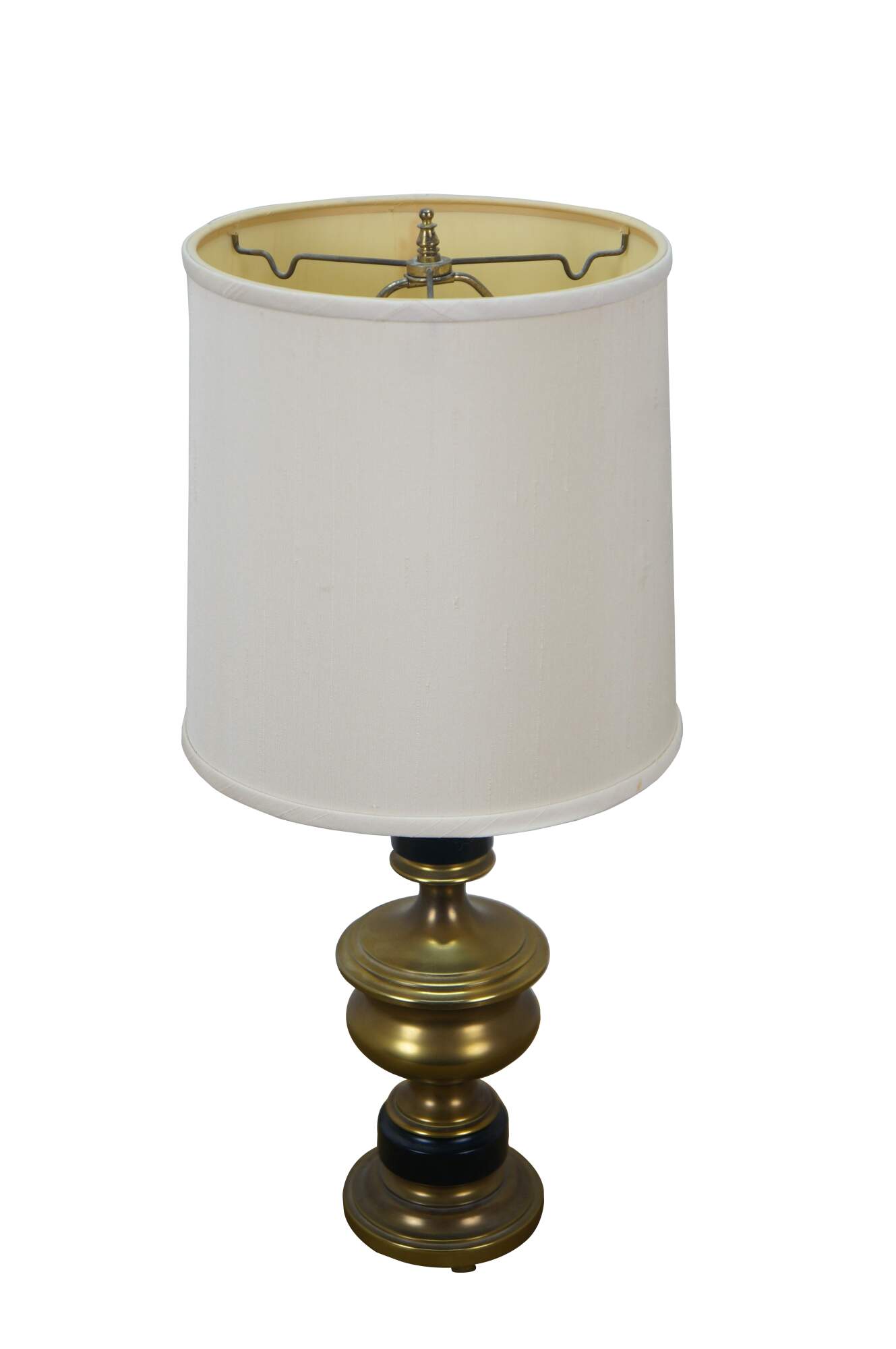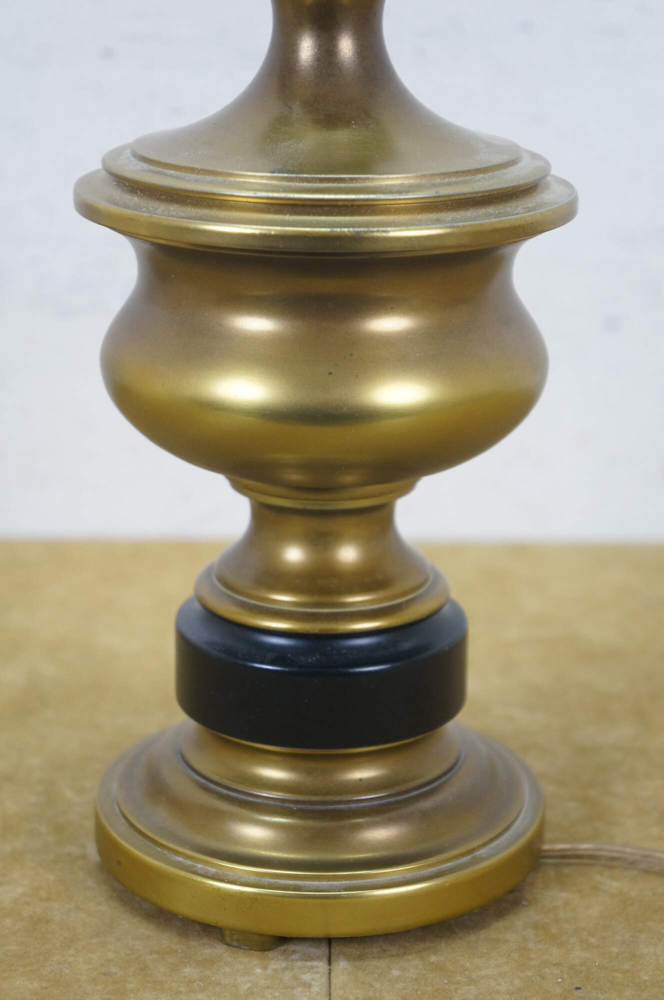 Mid to late 20th century mantel vase / trophy urn shaped brass table lamp with accents of black enameled bands. Includes harp, brass finial, and white fabric shade.