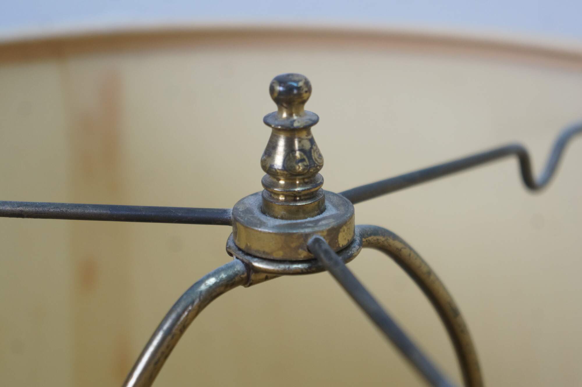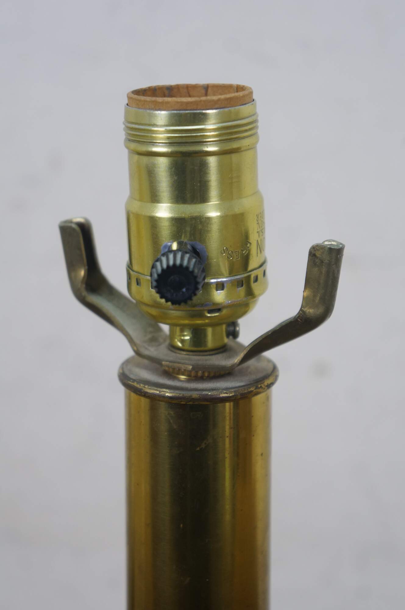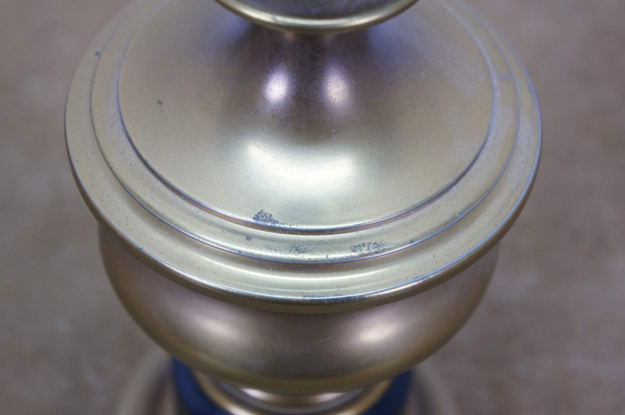 Mid to late 20th century mantel vase / trophy urn shaped brass table lamp with accents of black enameled bands. Includes harp, brass finial, and white fabric shade.