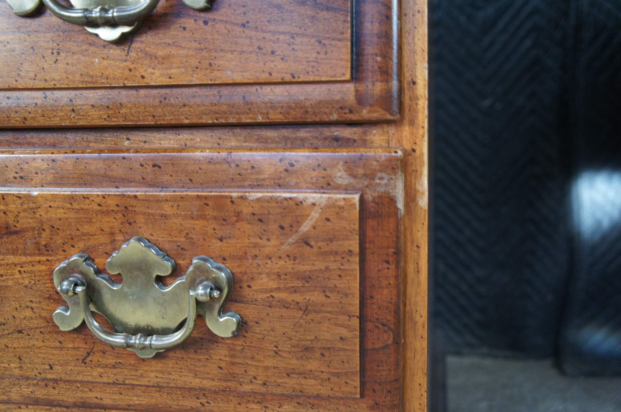 1970s Vintage kneehole writing desk. Made from cherry with colonial style brass hardware. Features seven dovetailed drawers and bracket style feet.