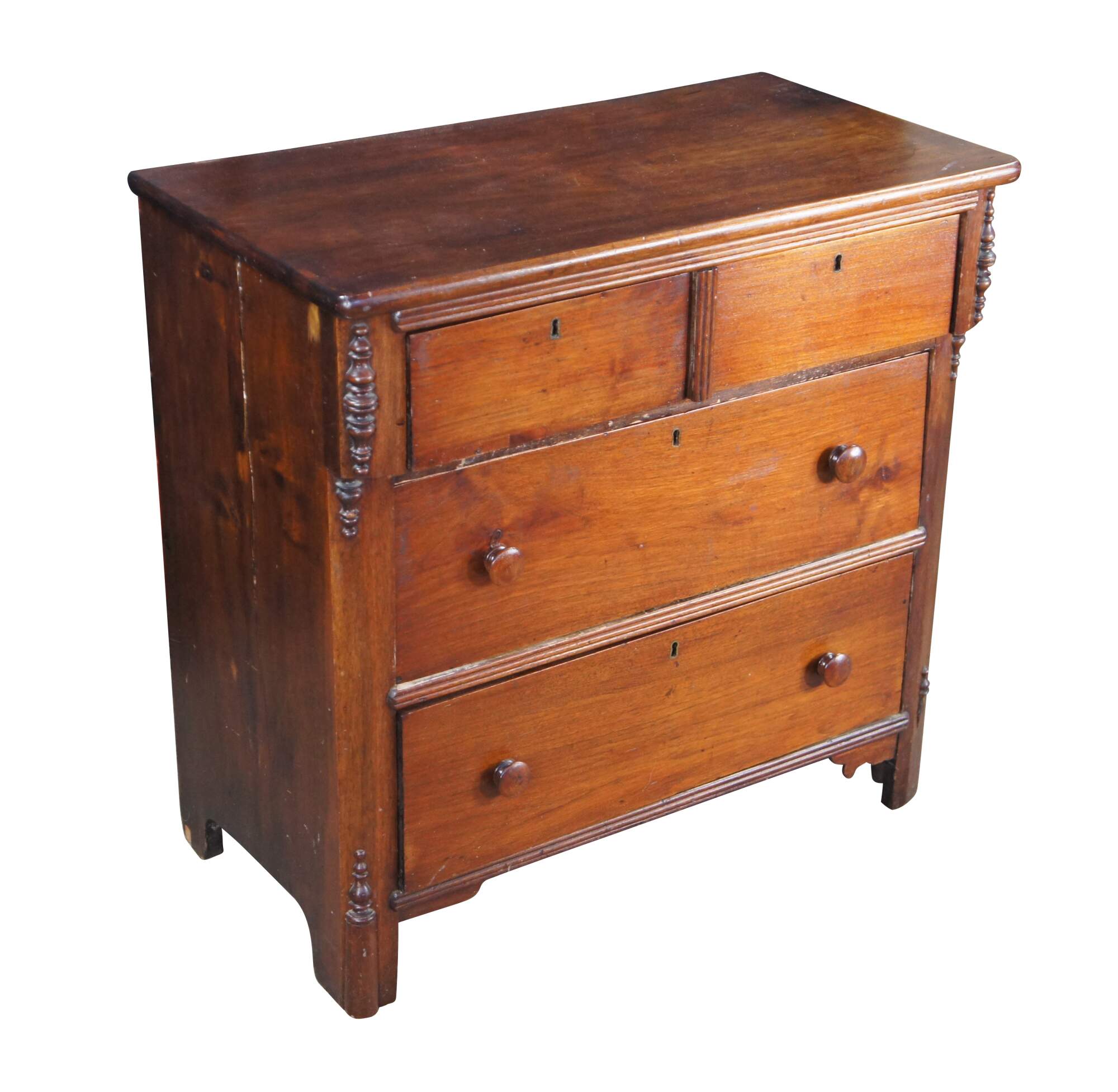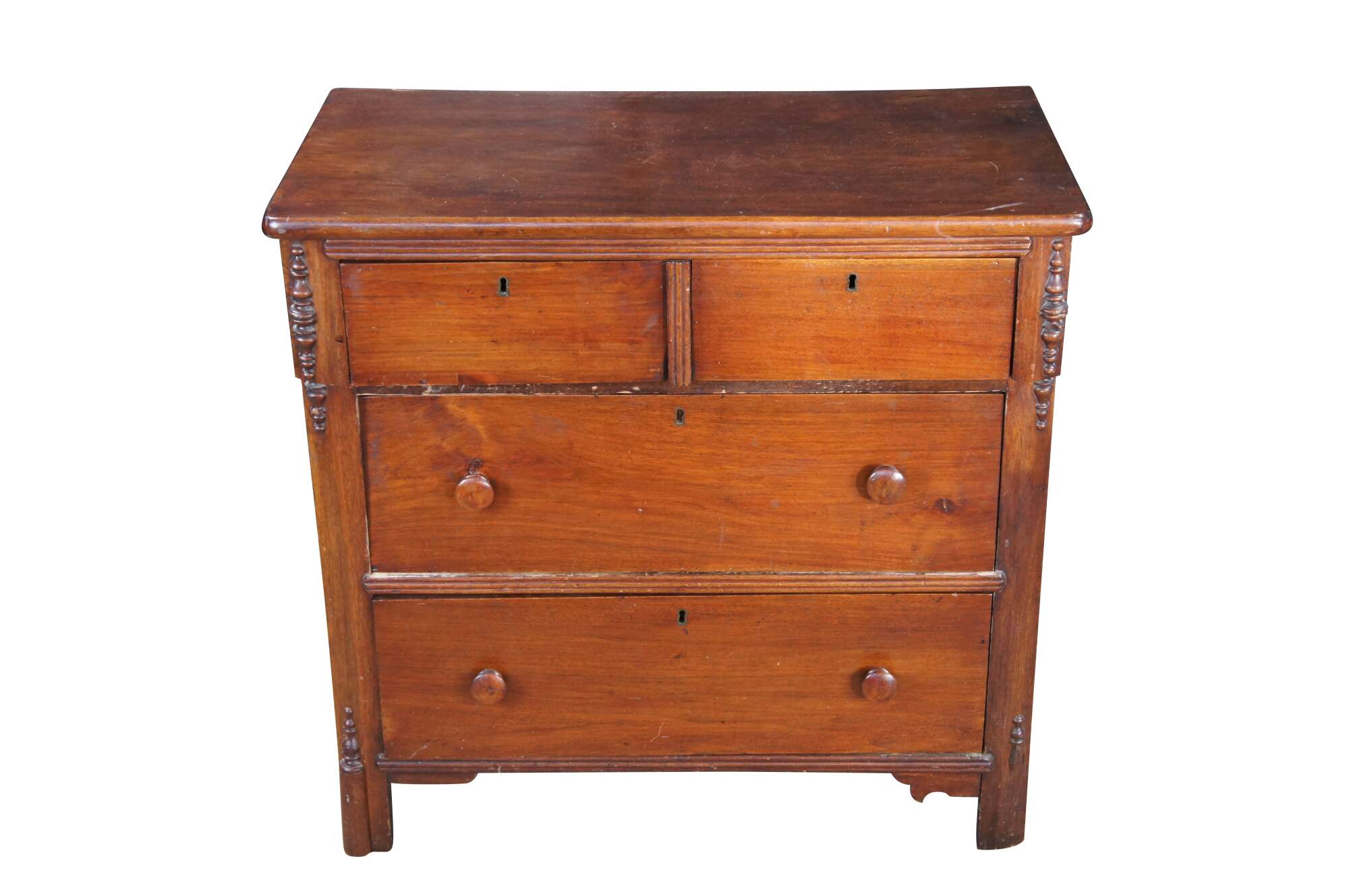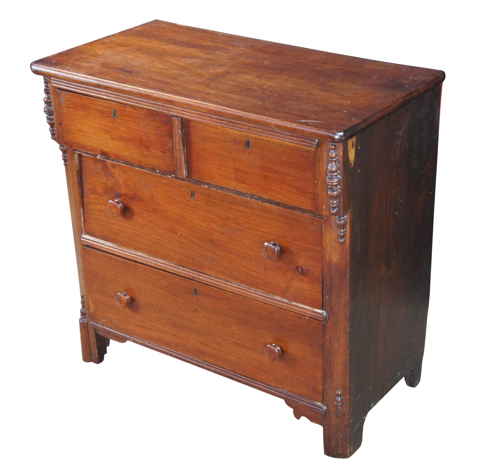 Antique 19th Century American Victorian chest of drawers, dresser or Washtand. Features a rectangular for made from walnut and other select solids with a two over two configuration. Drawers are hand dovetailed with wooden turned handles and inset escutcheon plates. Dresser stiles features applied and cut spindles.