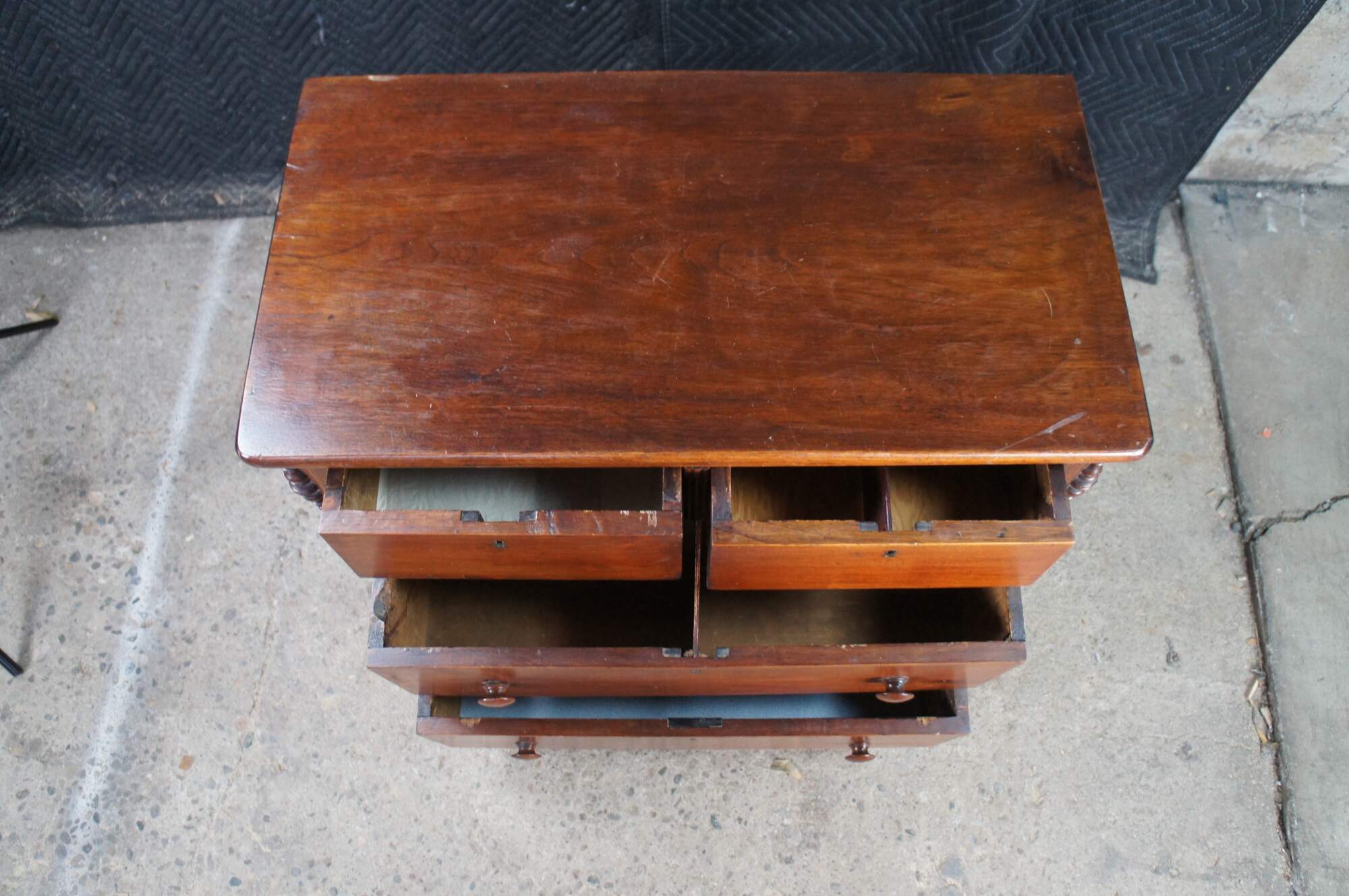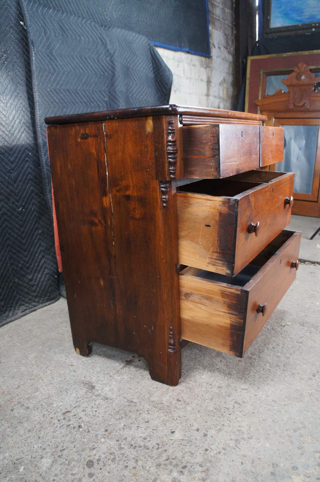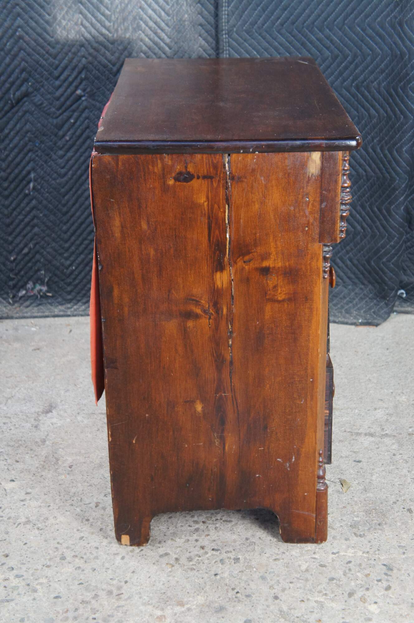 Wear and distressing from age and use, marking, fading, multiple trim pieces missing, splitting / cracking, damage mark right side, All drawers except bottom are missing locks.