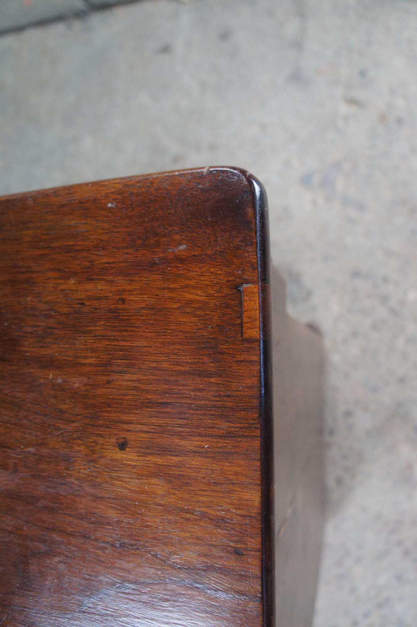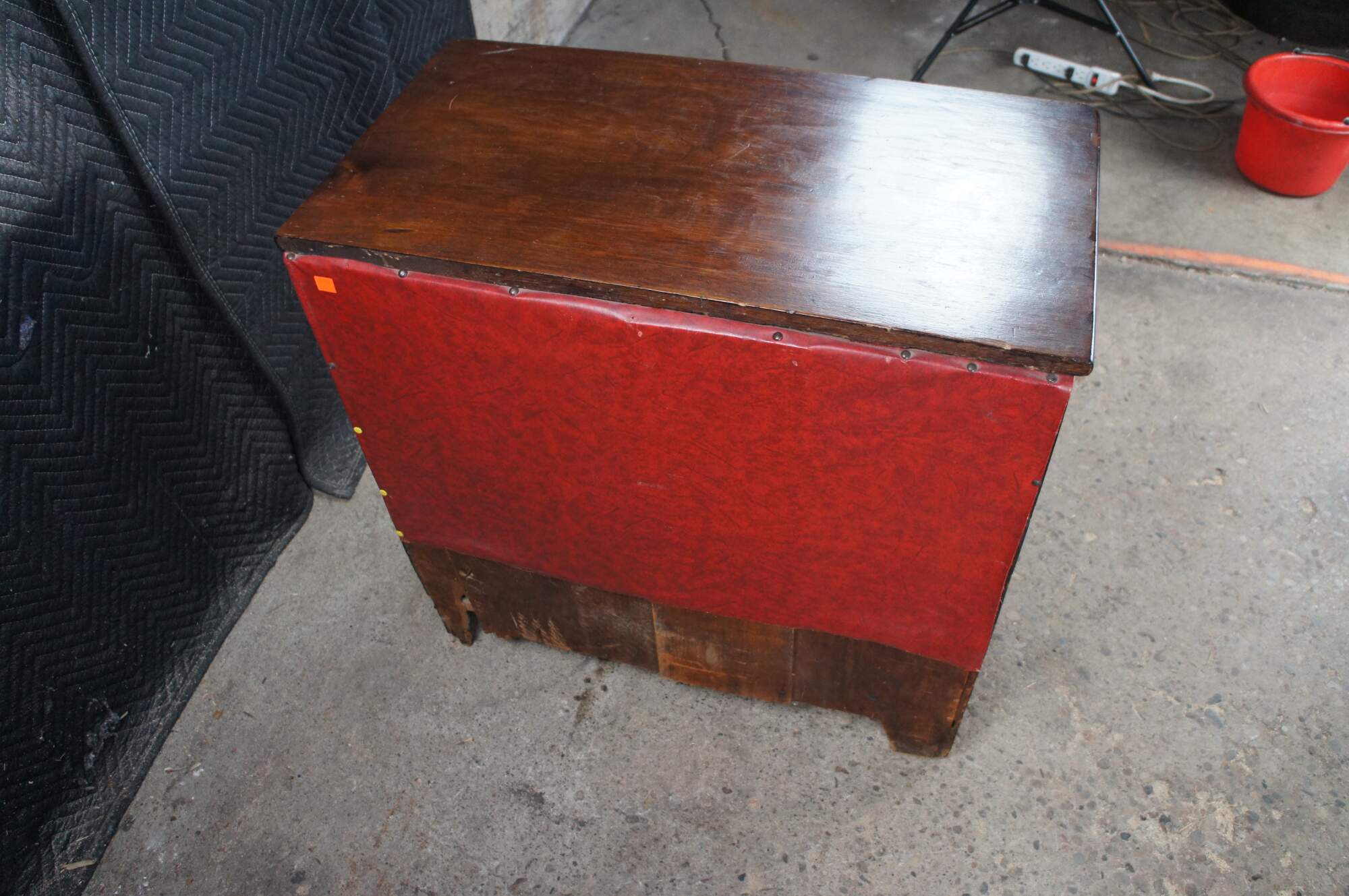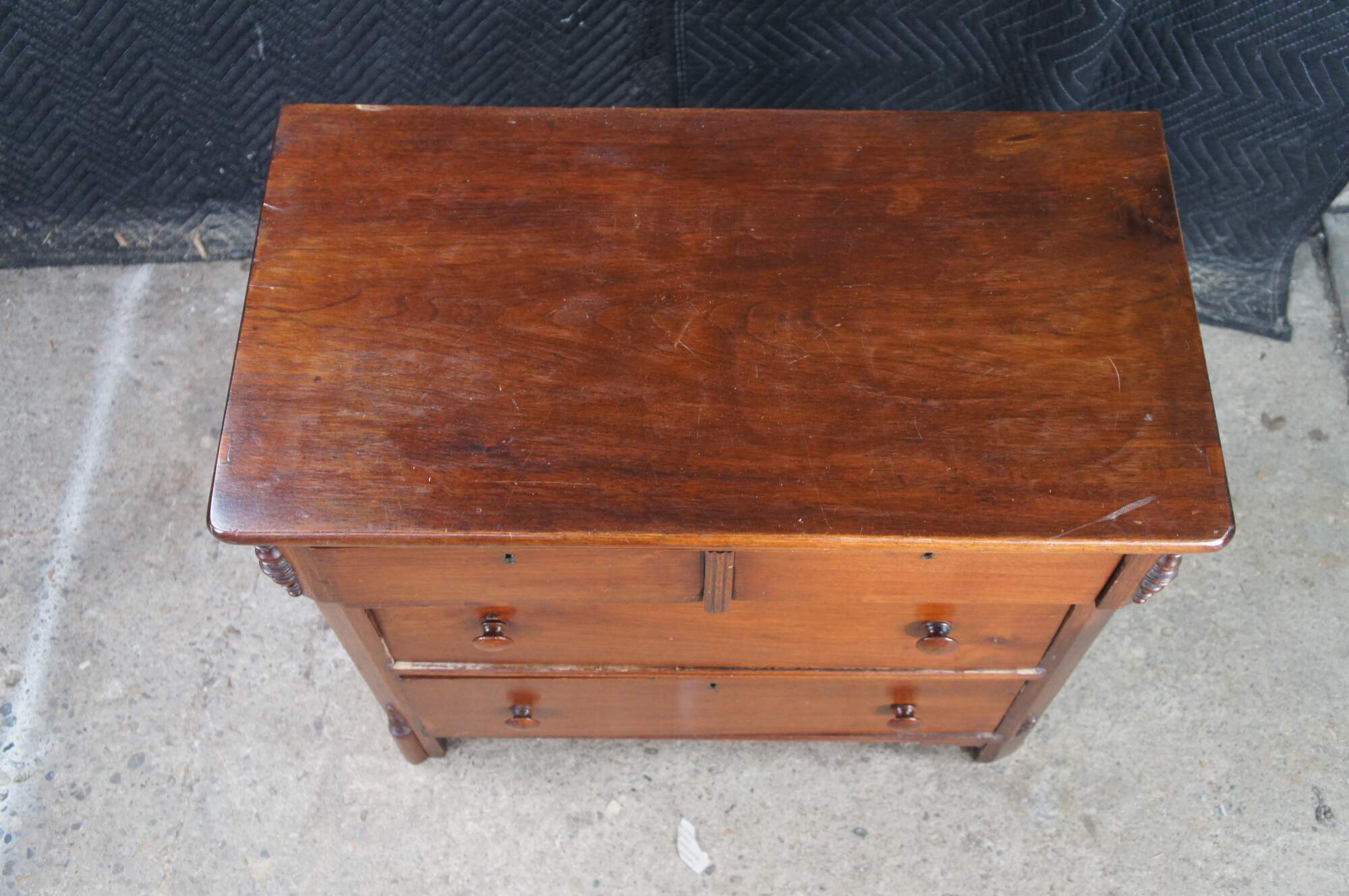Wear and distressing from age and use, marking, fading, multiple trim pieces missing, splitting / cracking, damage mark right side, All drawers except bottom are missing locks.