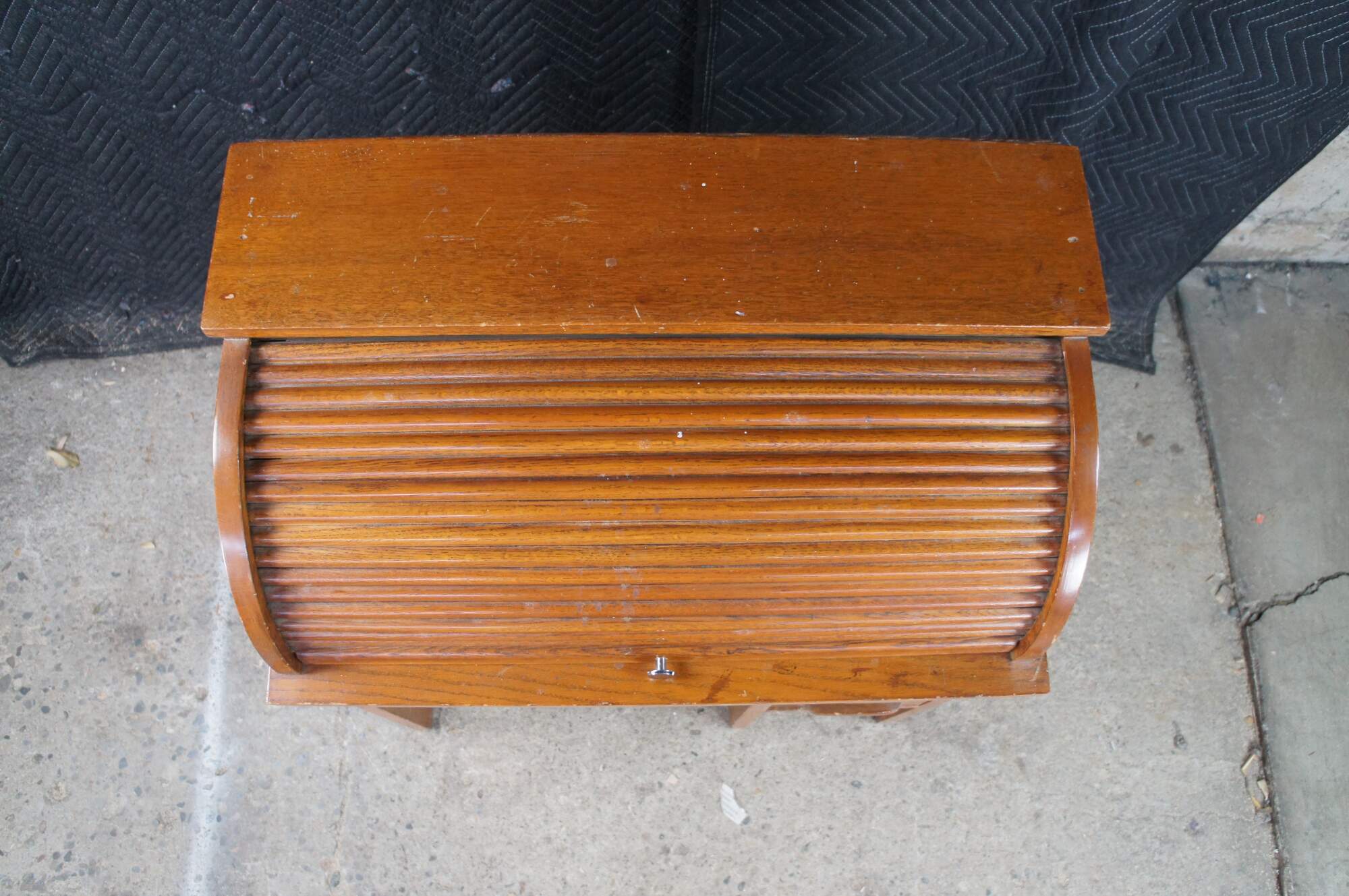 Victorian childs roll top writing desk featuring two drawers, a writing slide, a half cylinder roll top and interior cubbies.