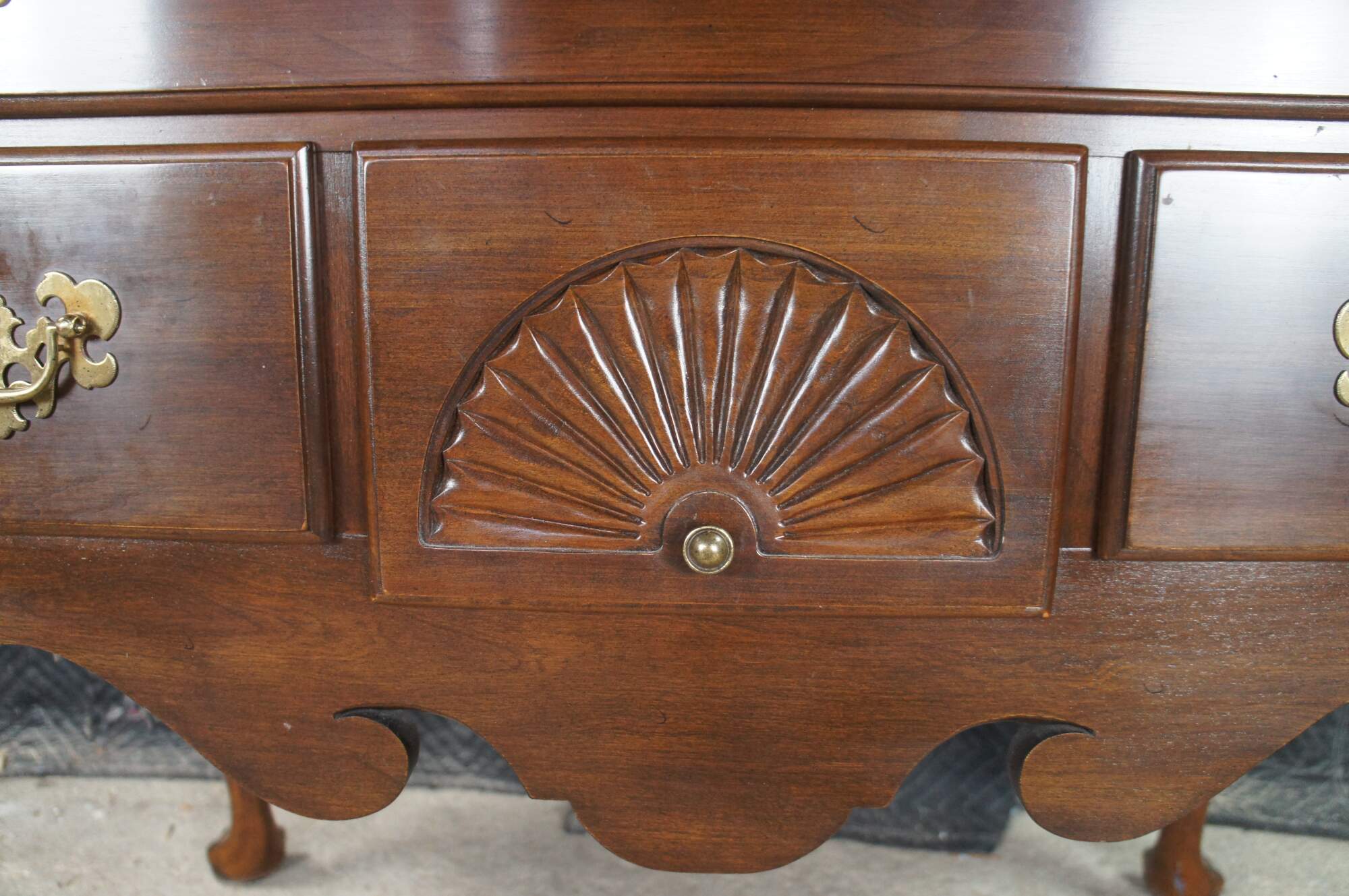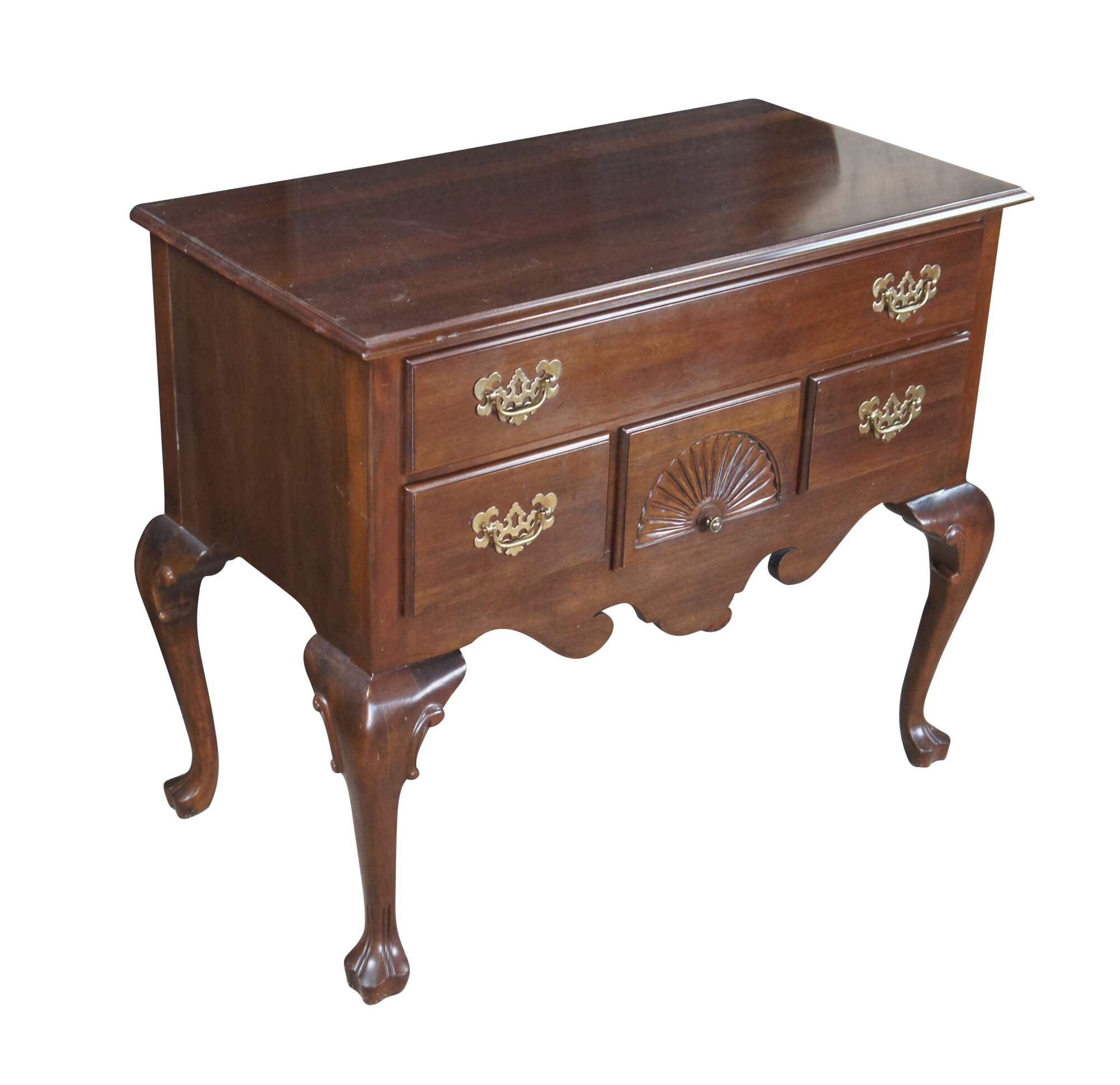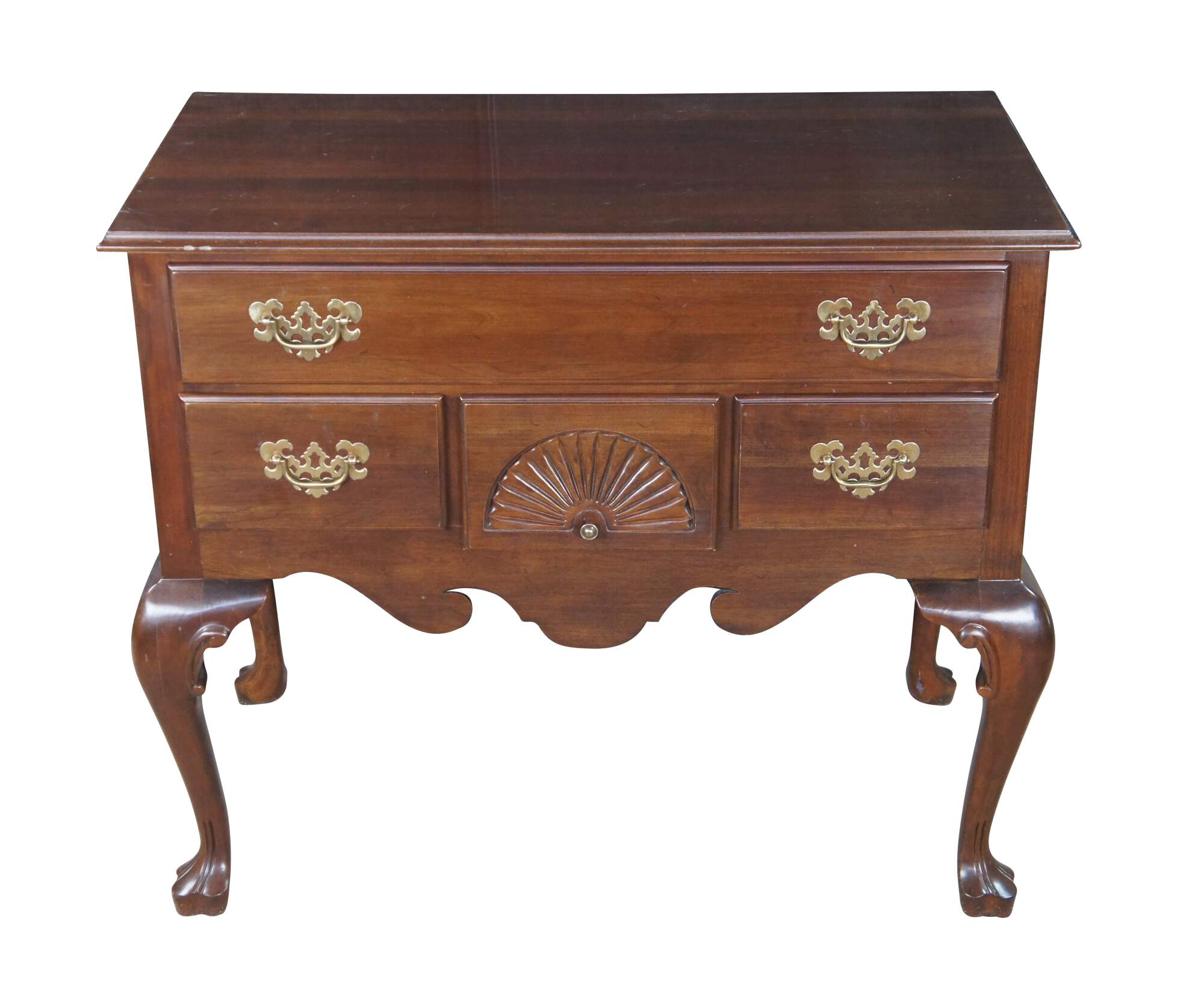 Vintage Ethan Allen Georgian Court Collection Lowboy, #11-9205, Circa 03-04-1980. Features a rectangular form designed in English Georgian Styling. Made from cherry with four dovetailed drawers with colonial brass style hardware. Central drawer has a fan carved at the center. The chest has a serpentine cut lower apron flanked by cabriole legs leading to trifid feet.