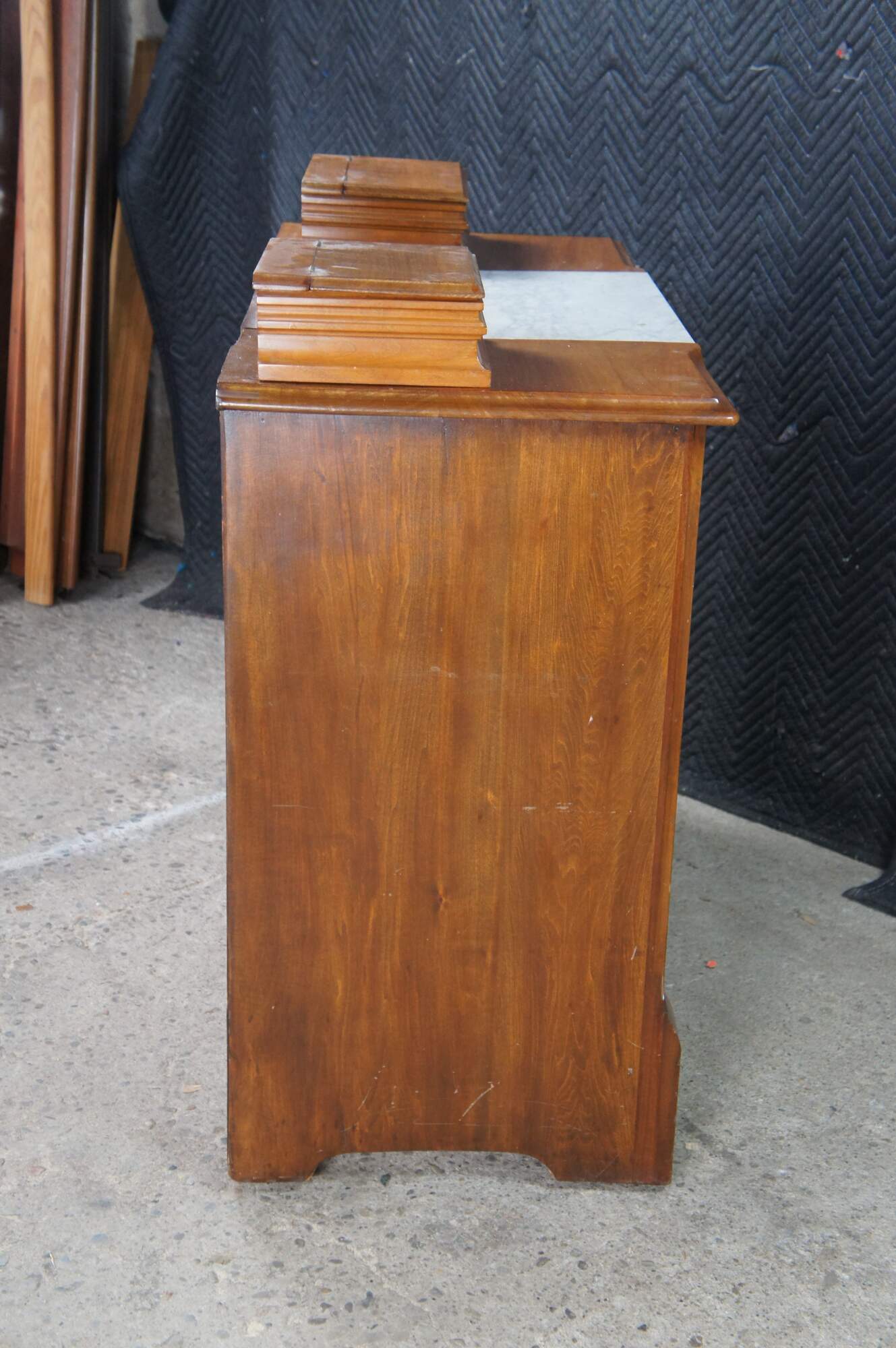 A beautiful Late Victorian Eastlake Dresser and Mirror, circa 1880. The case is made from walnut with three lower drawers featuring burled front molding, brass hardware and Charles Knapp Joinery. The mirror portion showcases beautiful Eastlake carved molding, an adjustable mirror flanked by corbel shelves and glove boxes set around a marble insert at the bases.