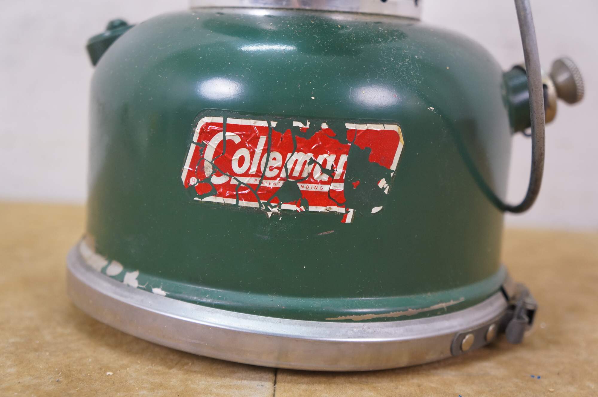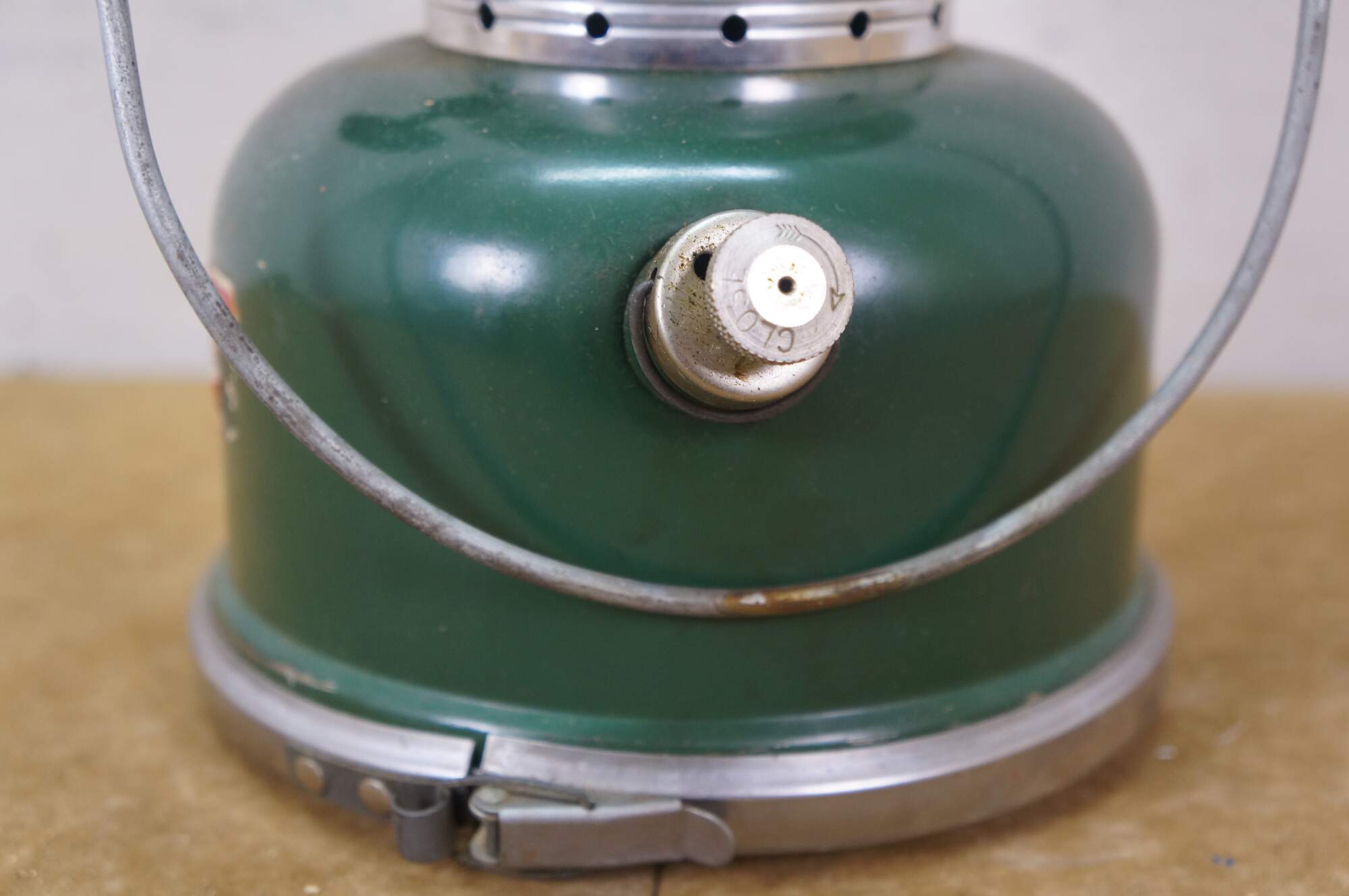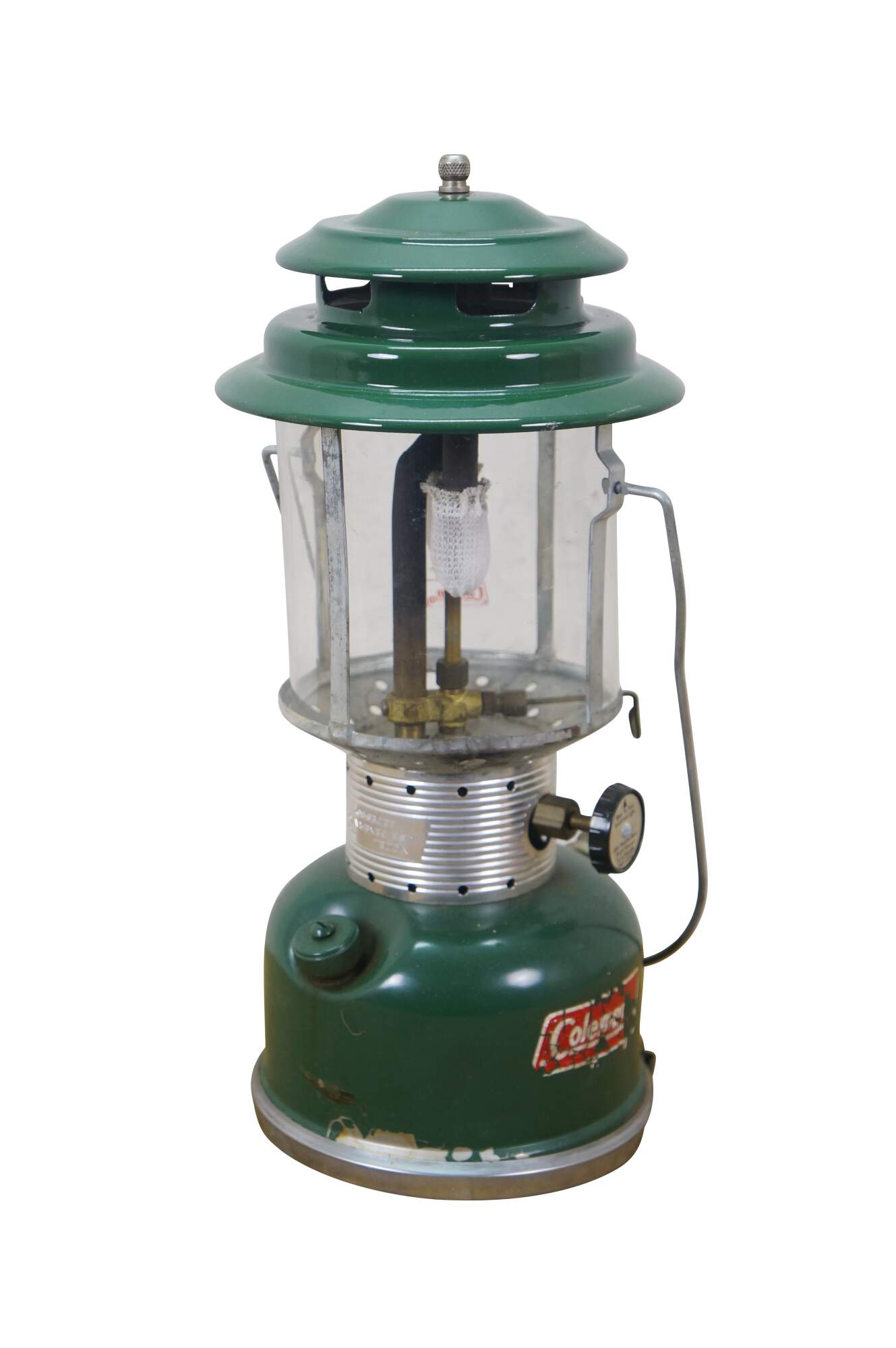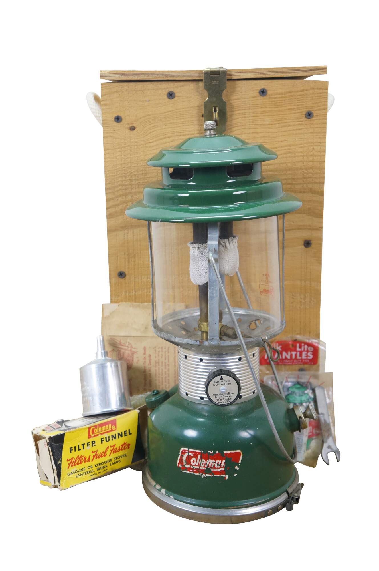 1960s Coleman model 220F green metal pyrex dual camping lantern & wood storage crate. Includes some extra accessories.
