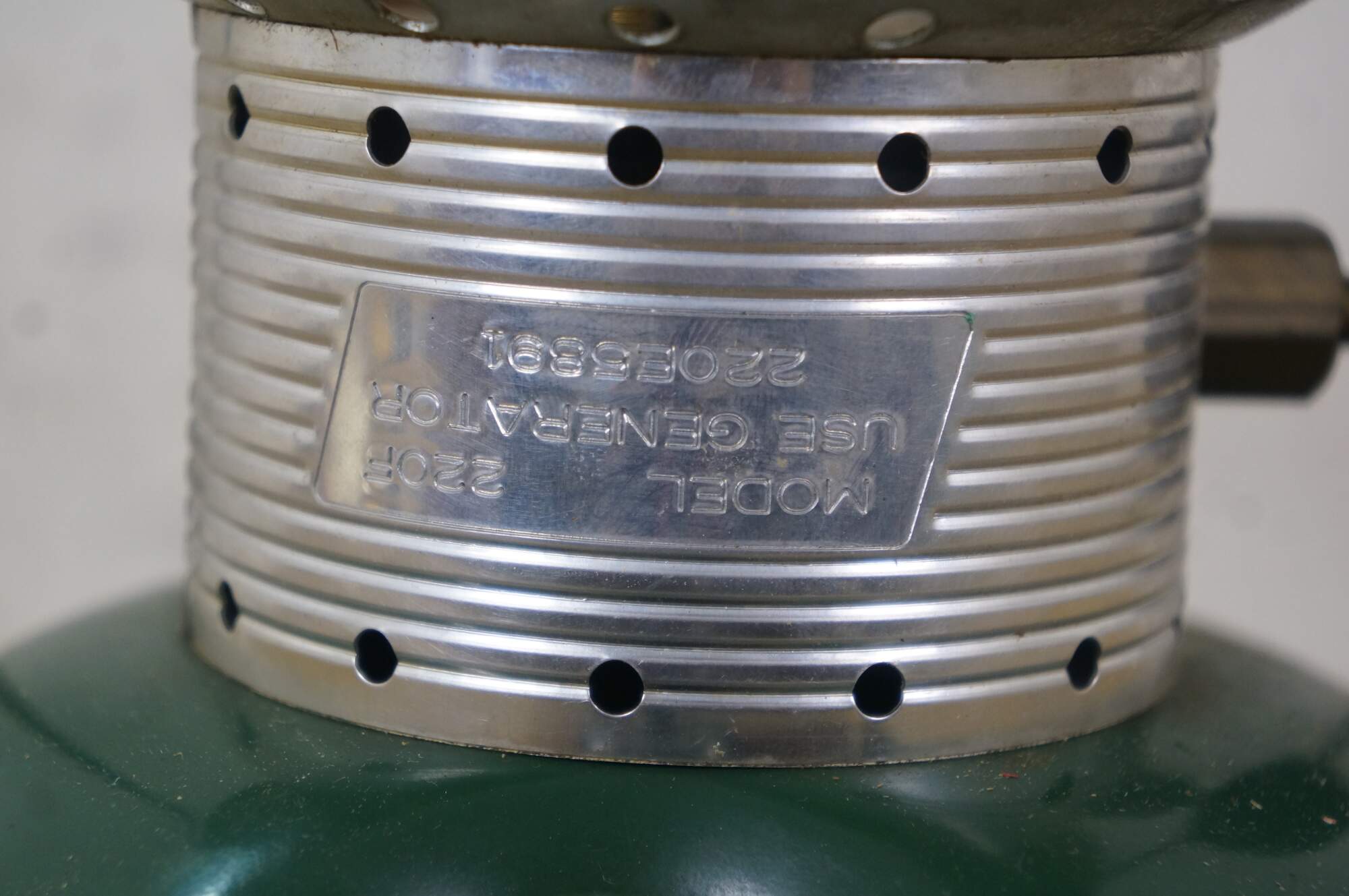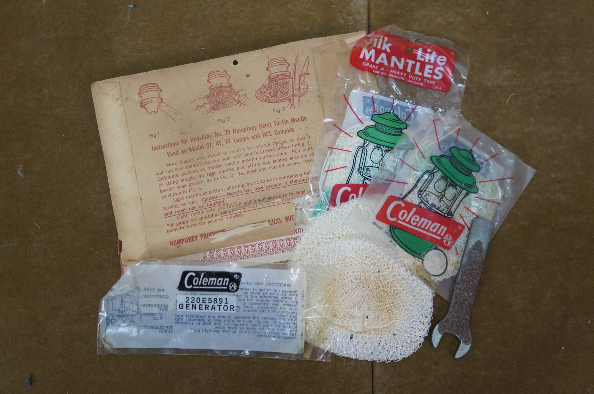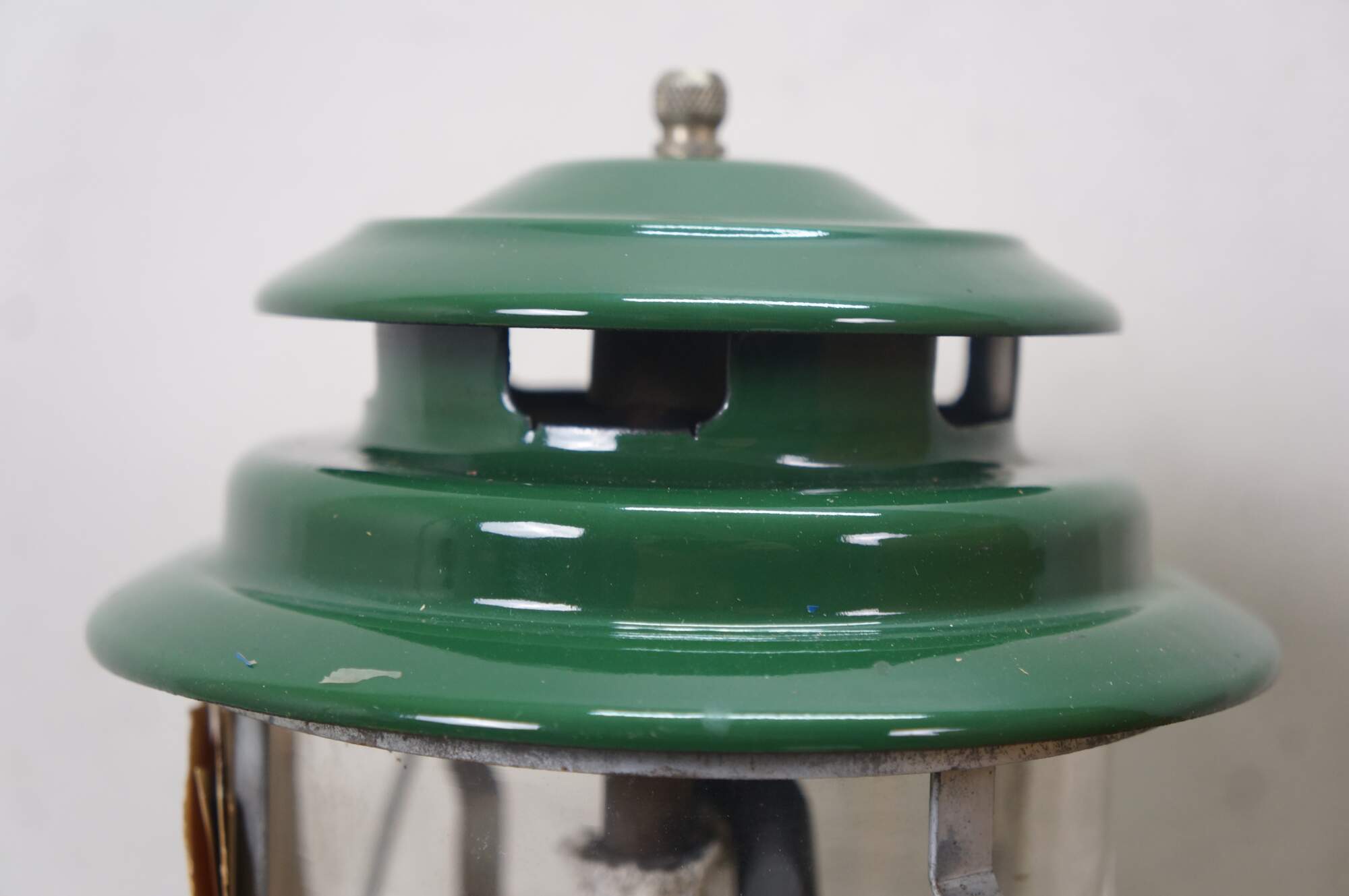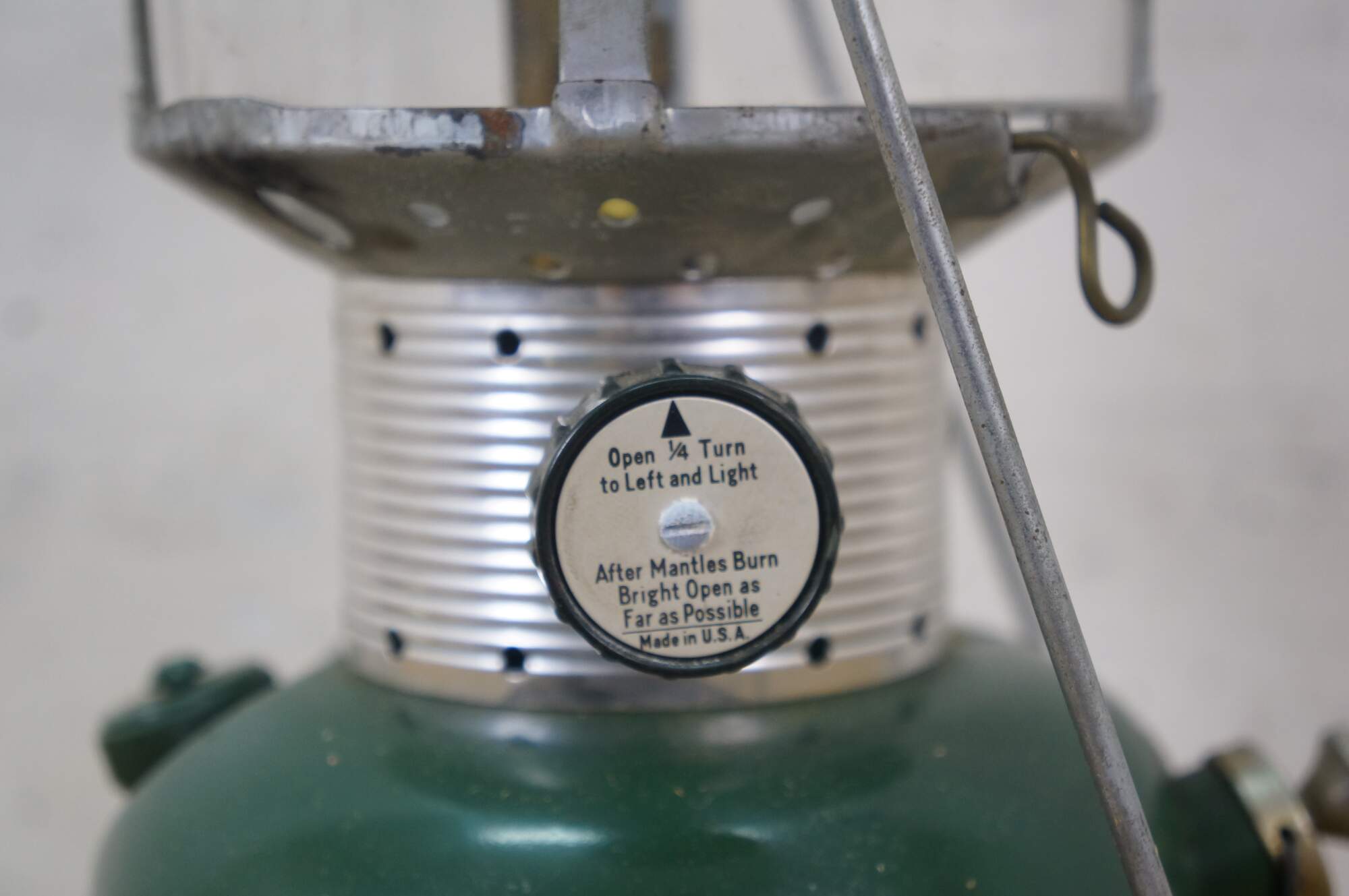 1960s Coleman model 220F green metal pyrex dual camping lantern & wood storage crate. Includes some extra accessories.