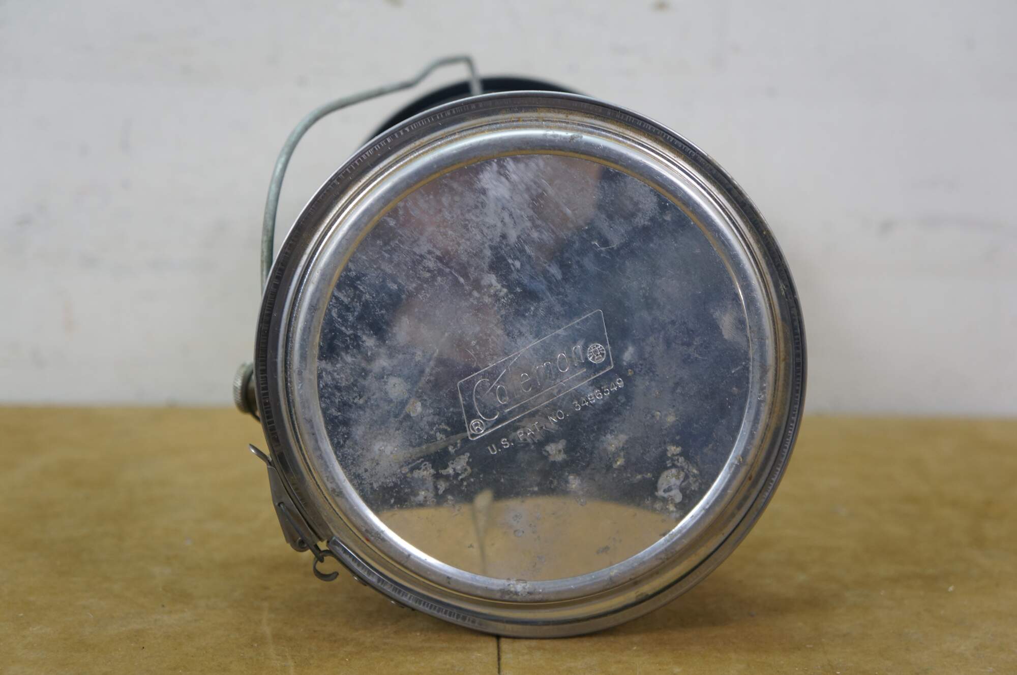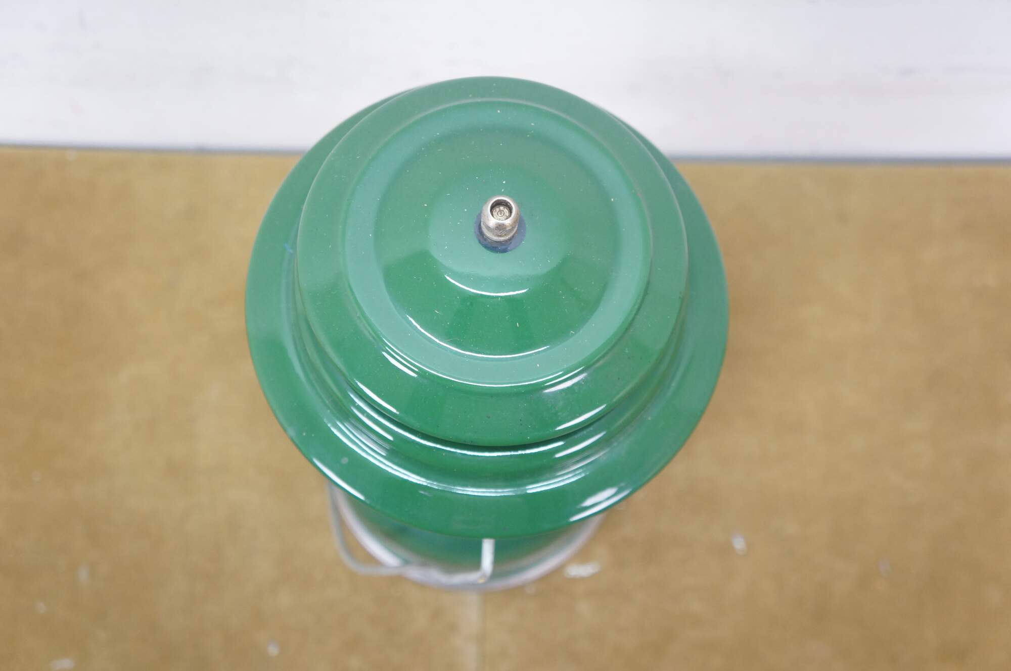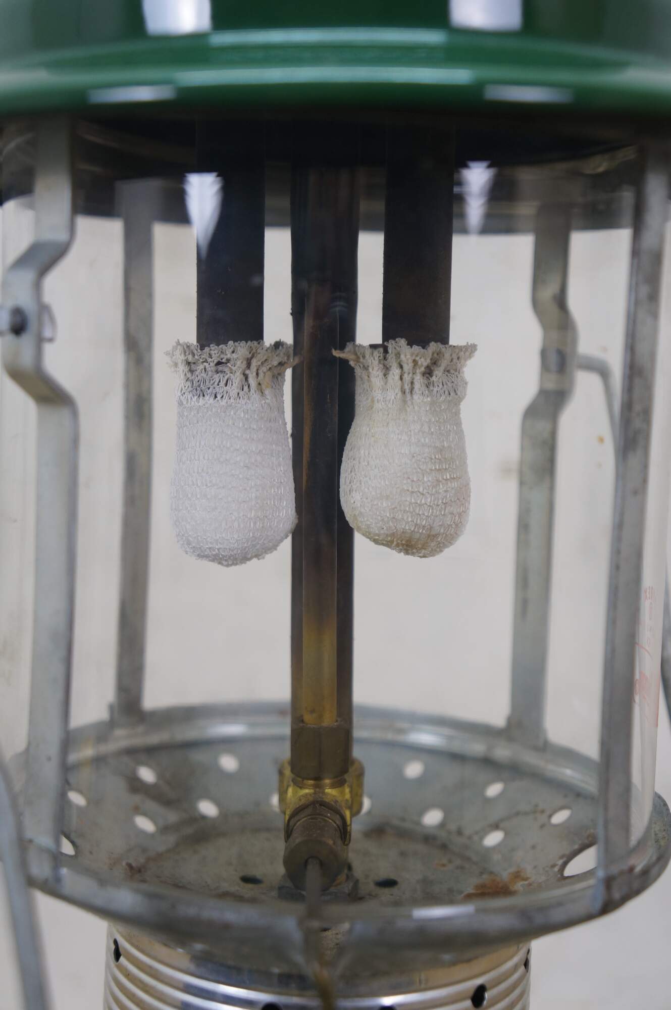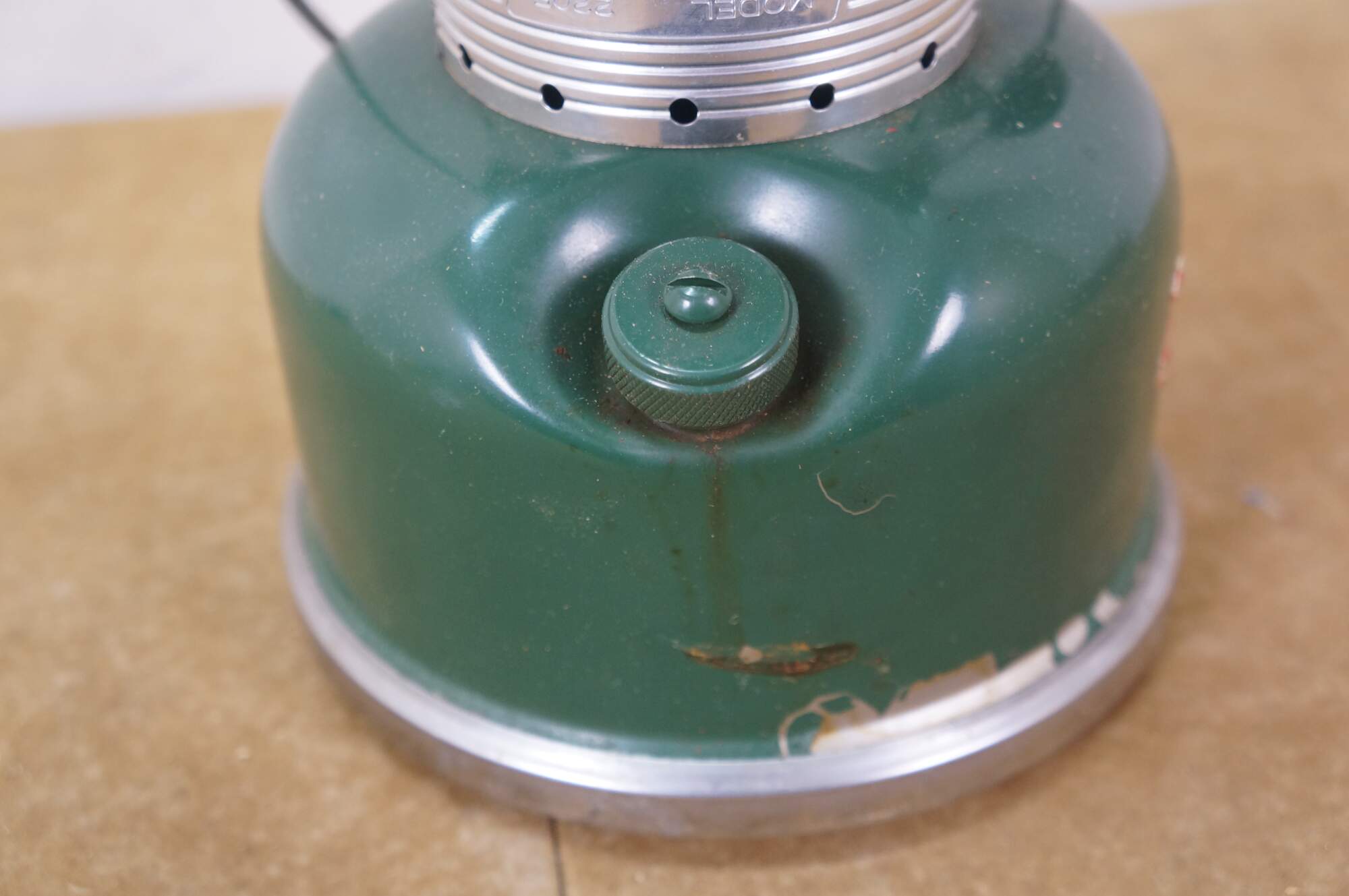 1960s Coleman model 220F green metal pyrex dual camping lantern & wood storage crate. Includes some extra accessories.