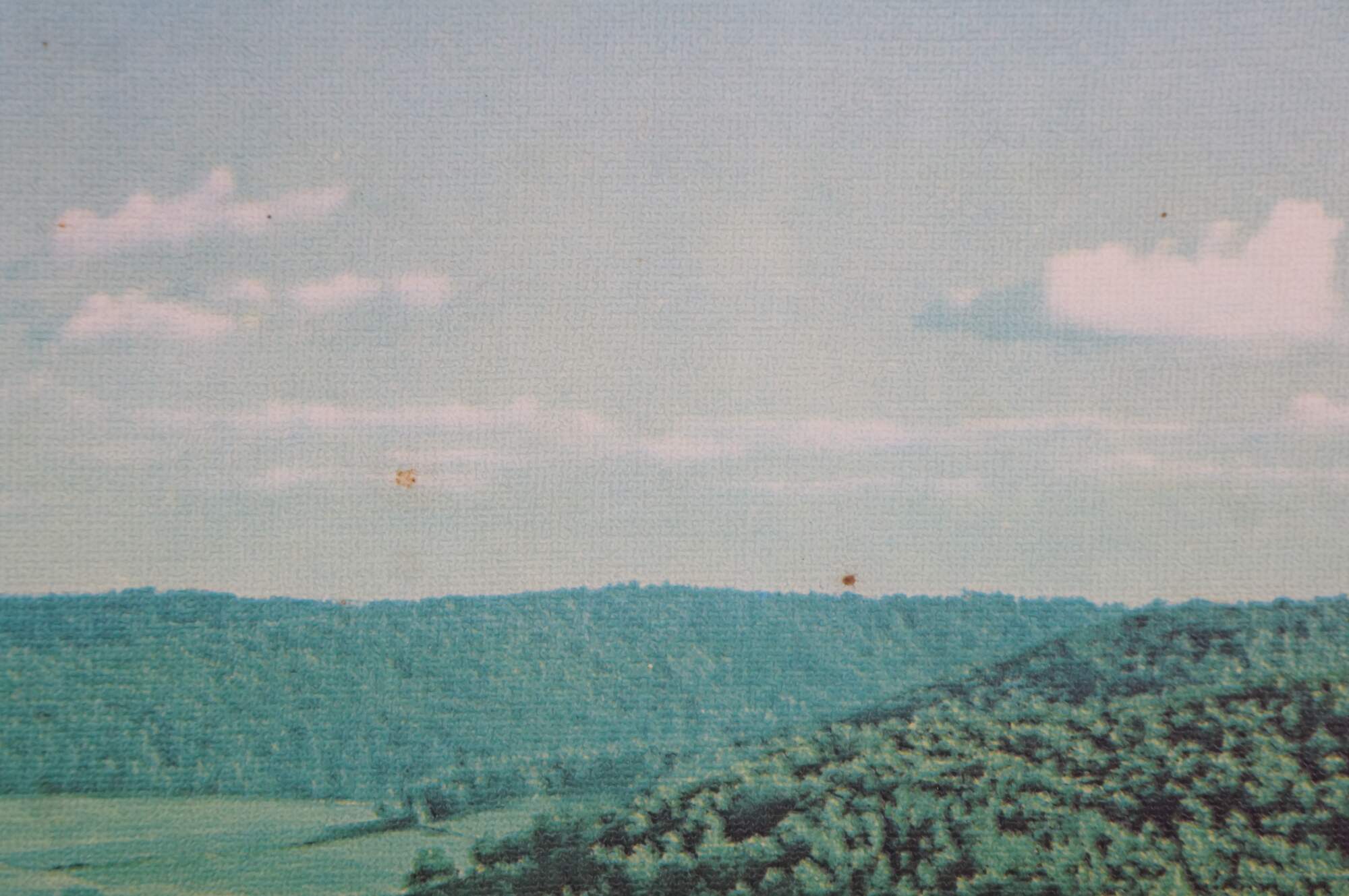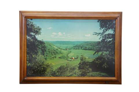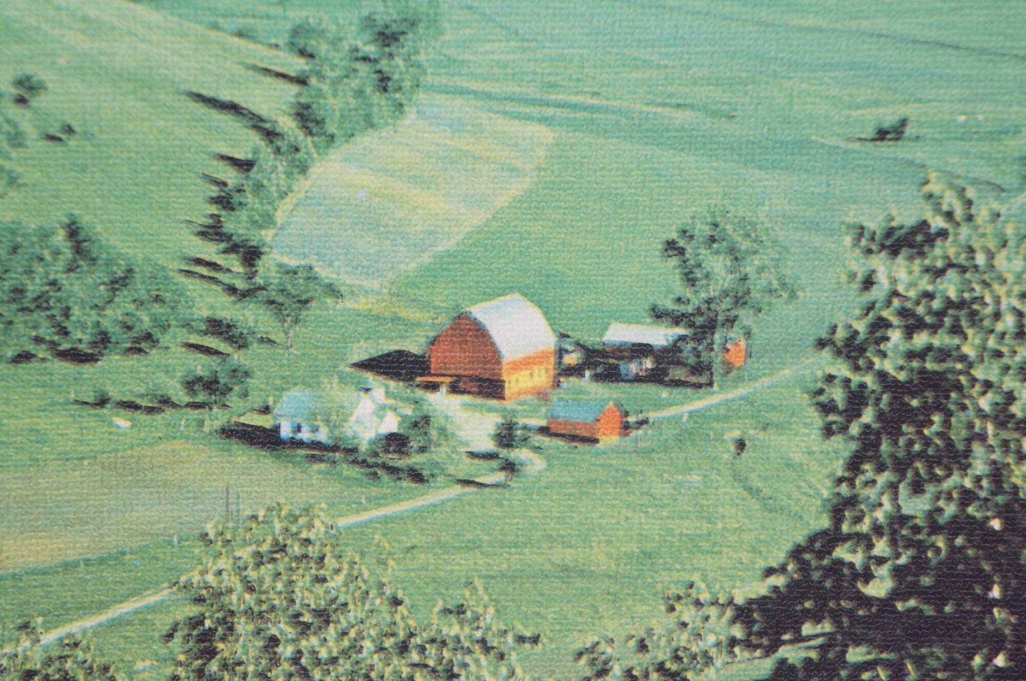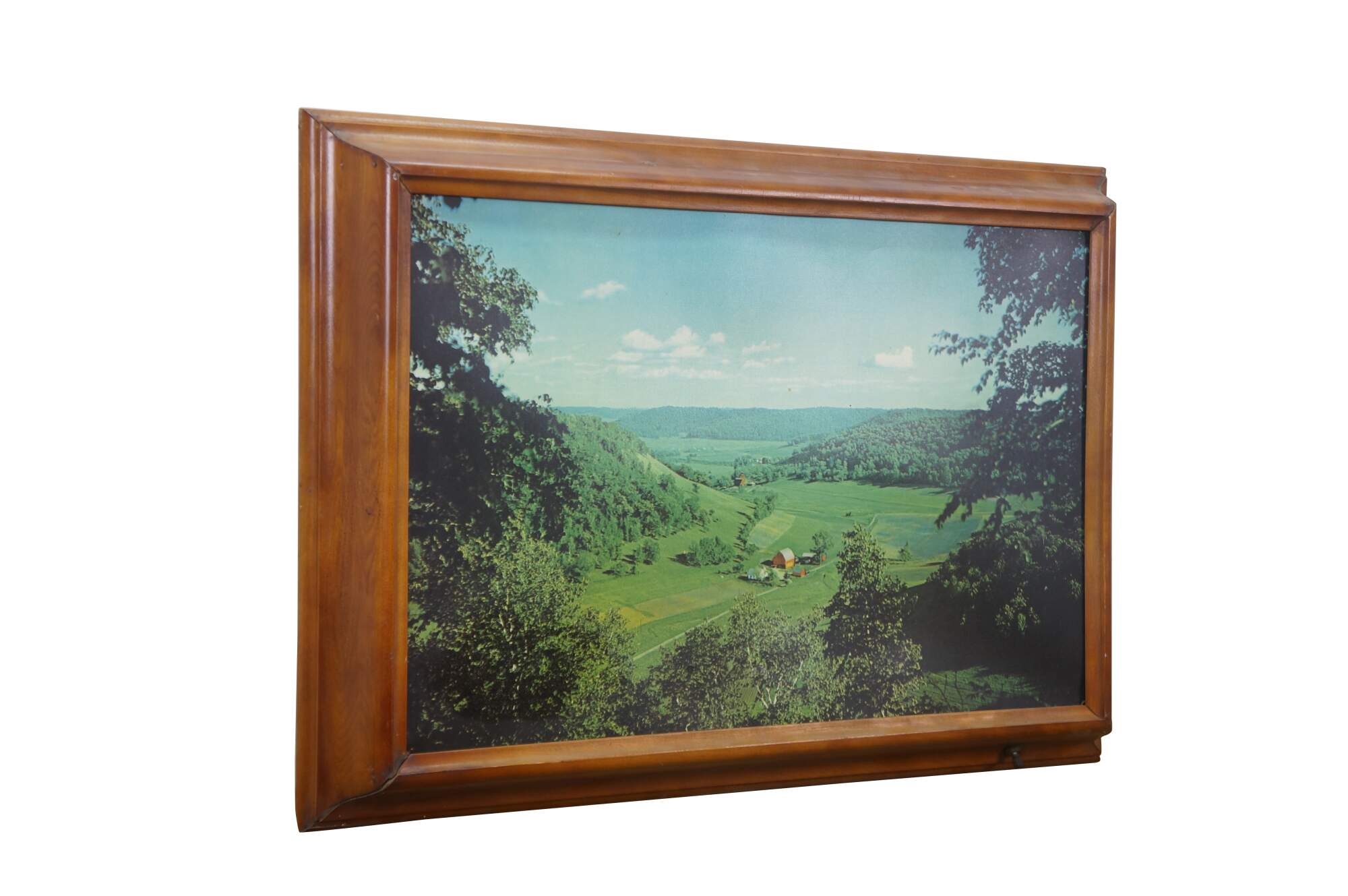 Mid century Helmscene illuminated / light up / backlit country landscape scene with barns and farmhouses in the valley. Made by Helmscene in Grand Rapids Michigan.