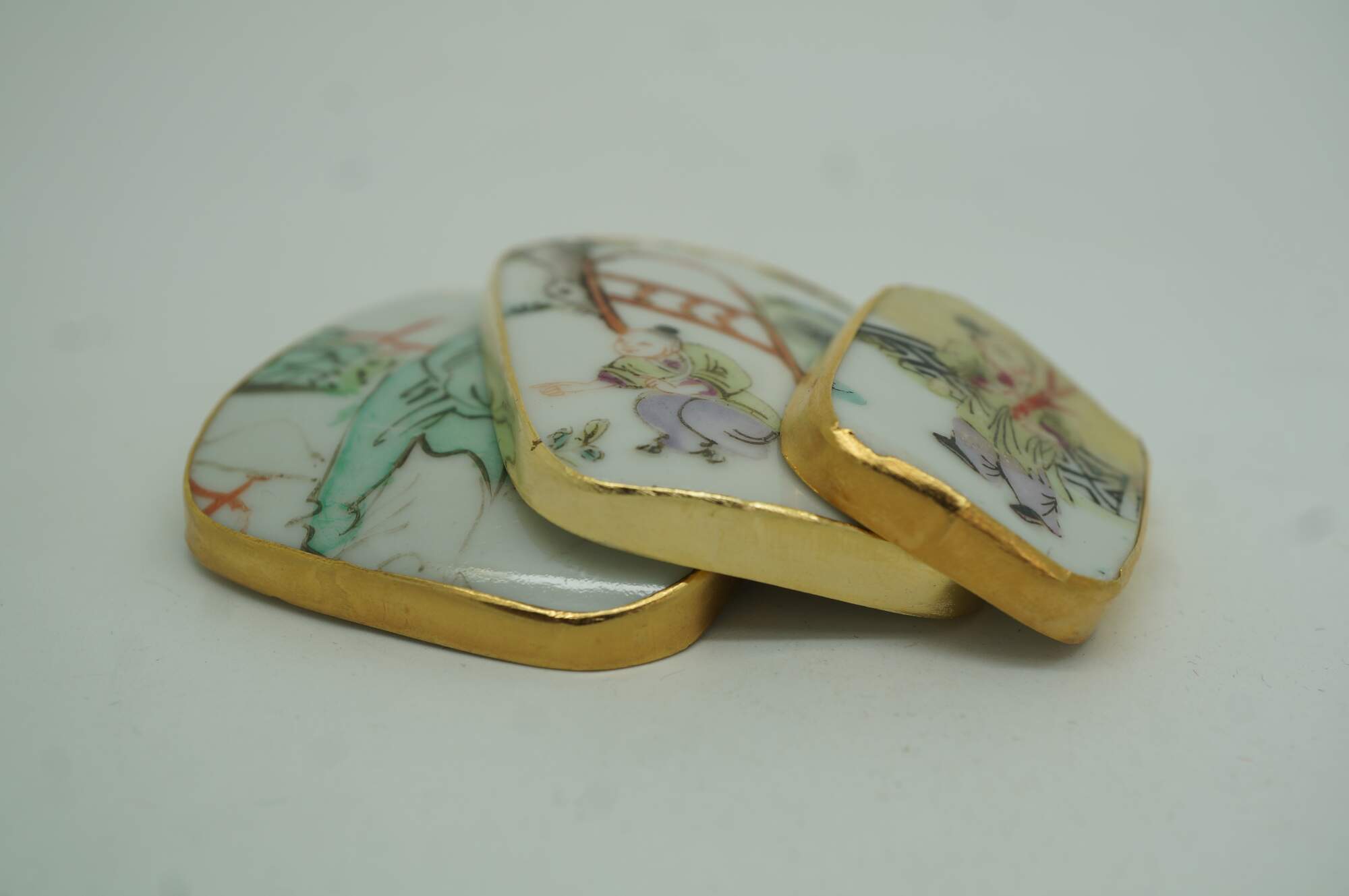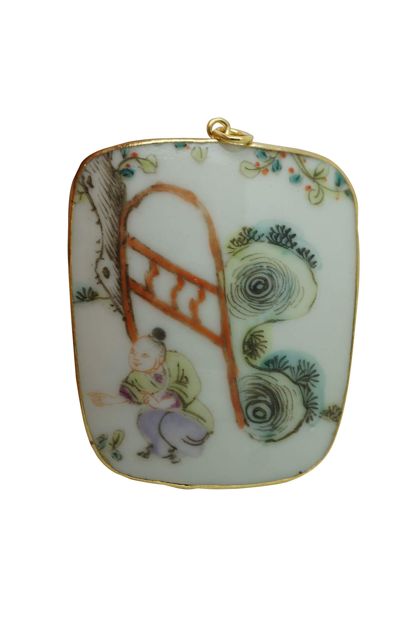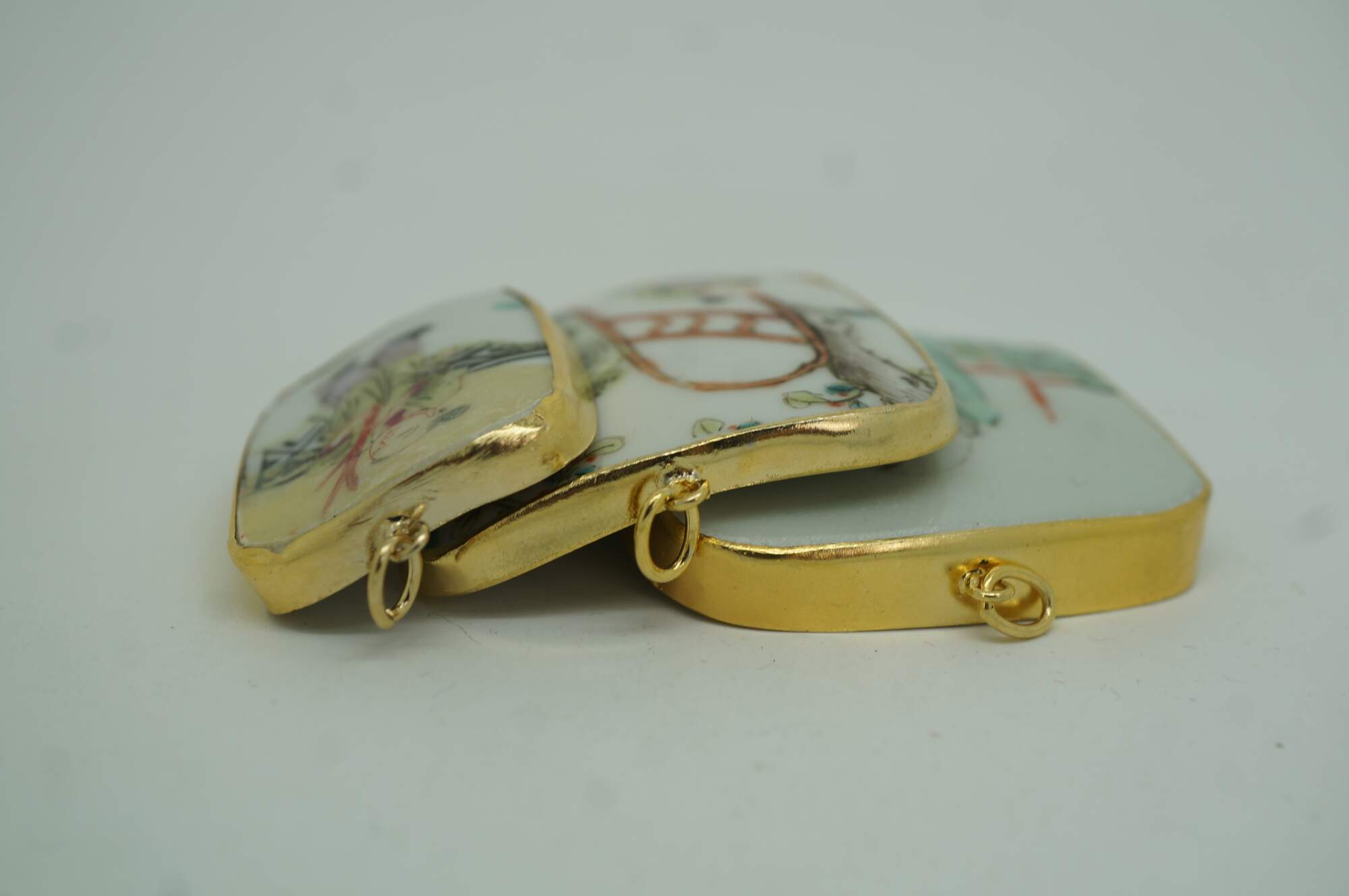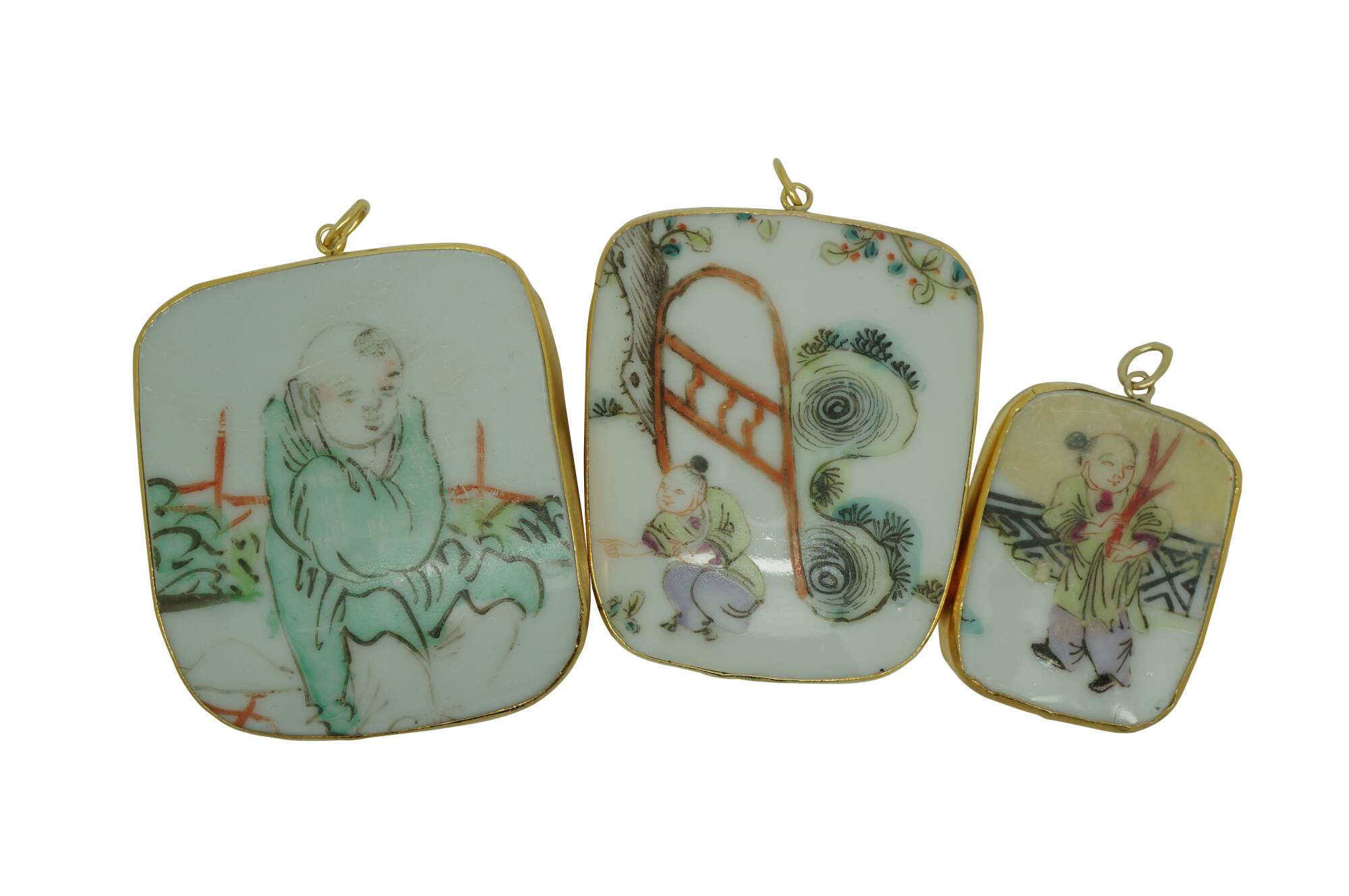 Antique 19th century Chinese porcelain shard amulet pendants, dating from the Qing Dynasty, set in 8k gold setting. The pendants are created from fragments (shards) of antique Chinese Famille Rose porcelain, which were highly valued and often repurposed into jewelry or decorative items. The hand-painted scenes depict figures in various garden / courtyard settings.
