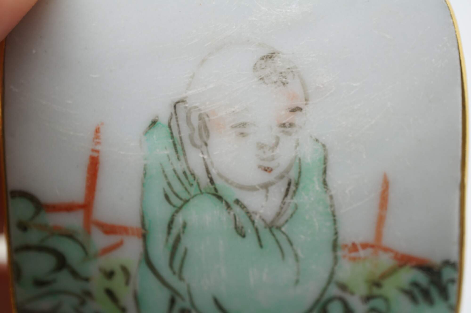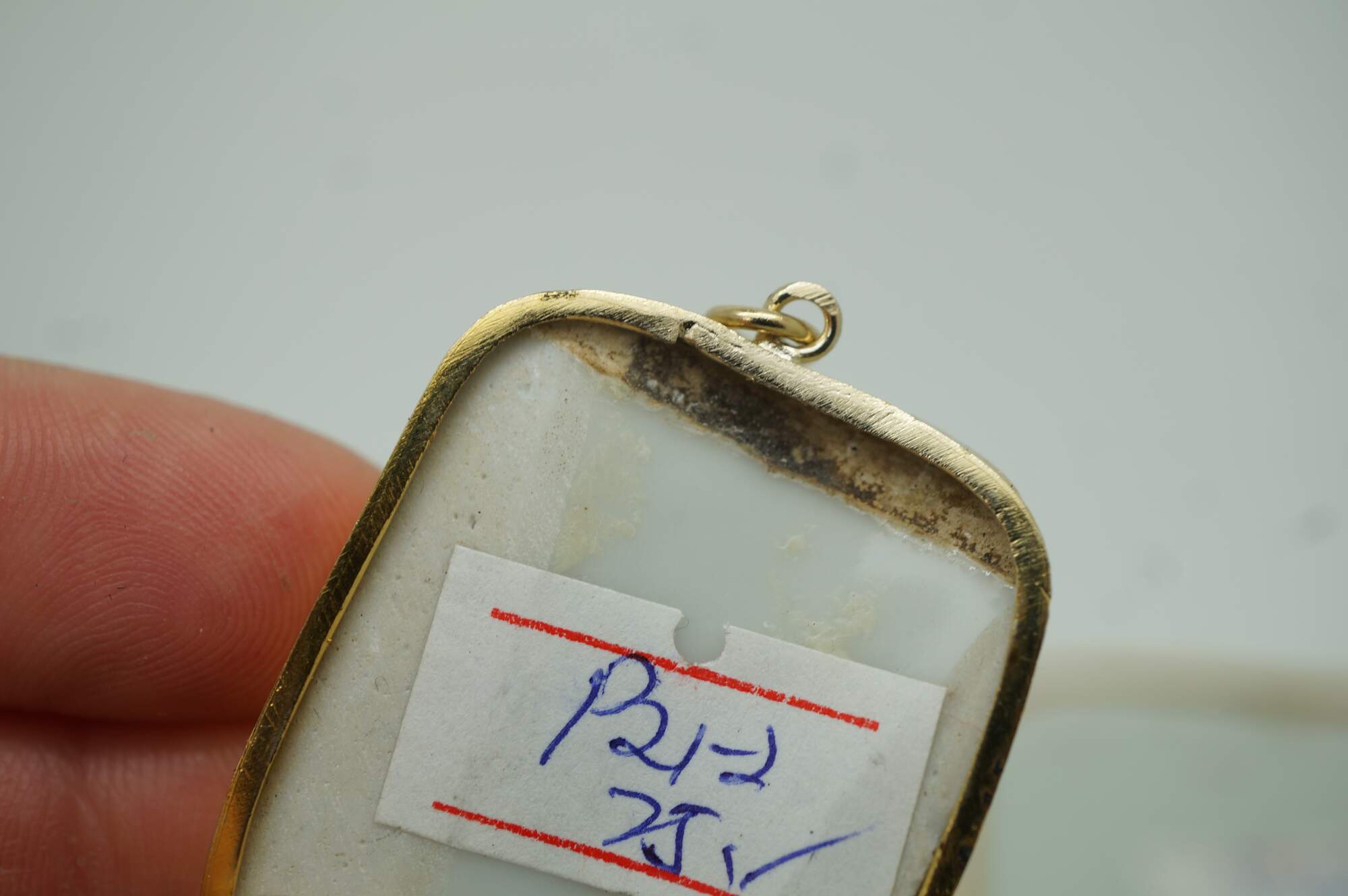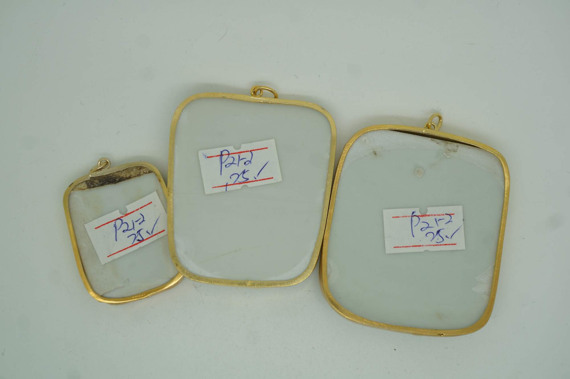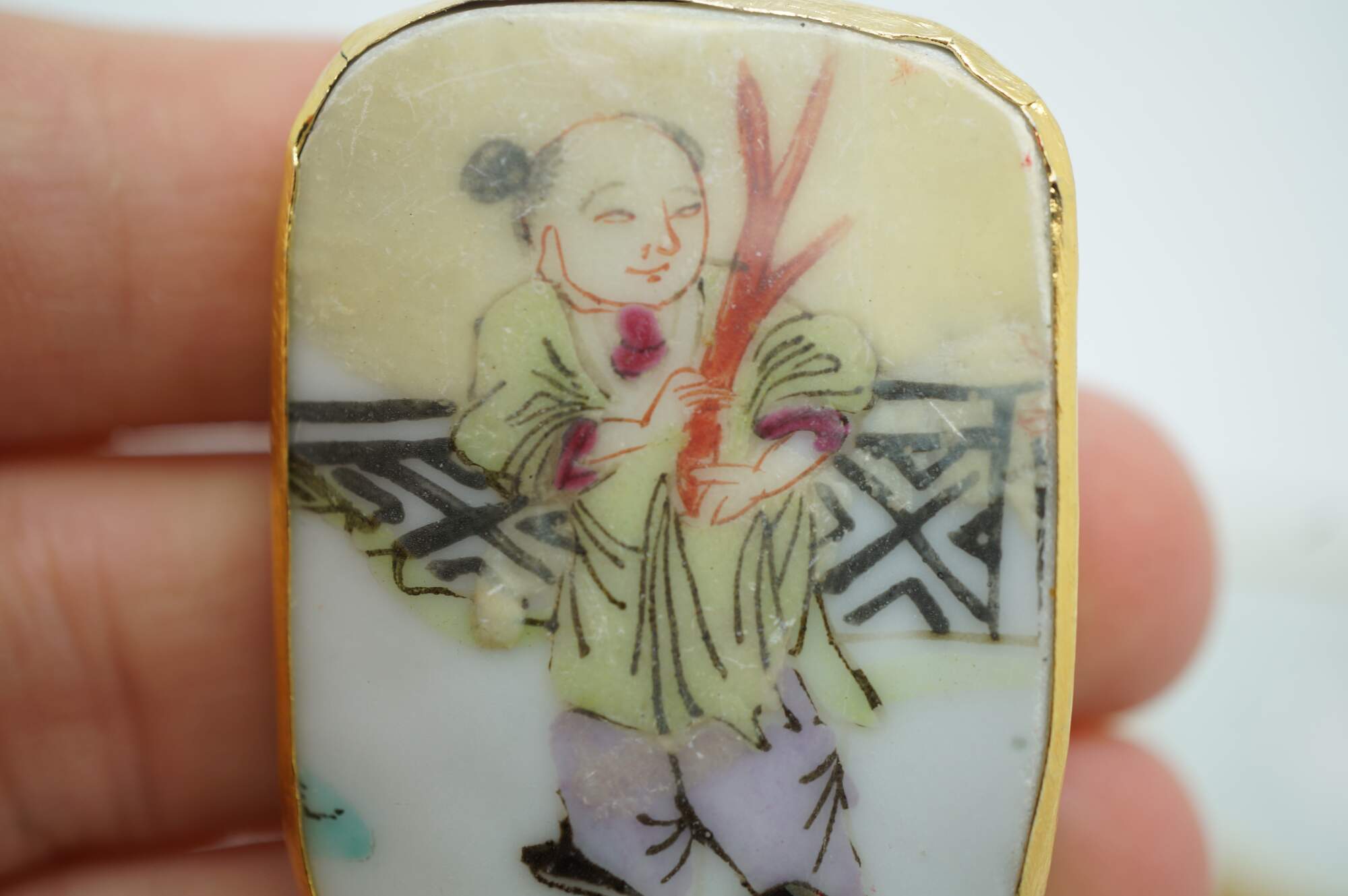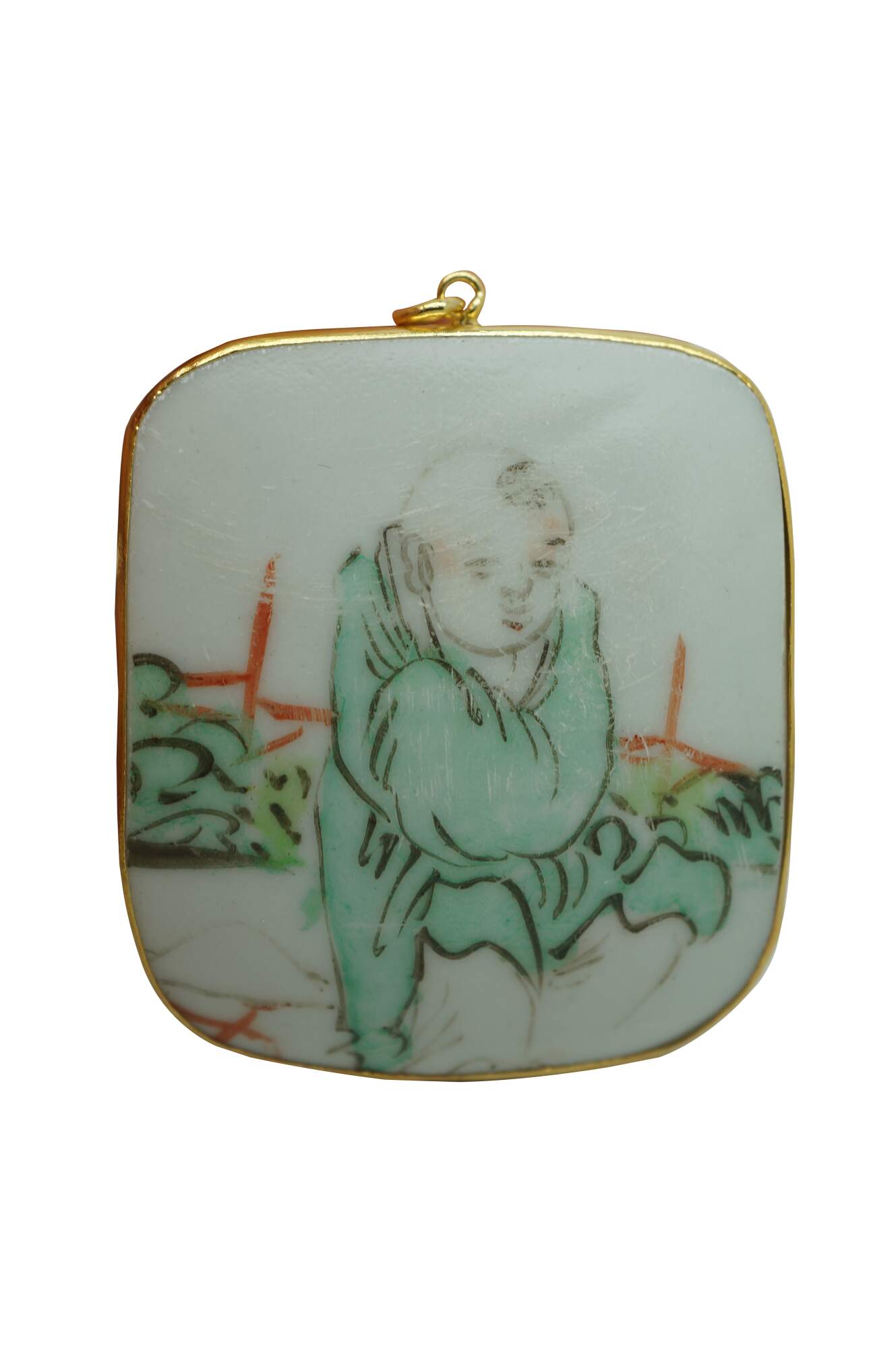 Antique 19th century Chinese porcelain shard amulet pendants, dating from the Qing Dynasty, set in 8k gold setting. The pendants are created from fragments (shards) of antique Chinese Famille Rose porcelain, which were highly valued and often repurposed into jewelry or decorative items. The hand-painted scenes depict figures in various garden / courtyard settings.