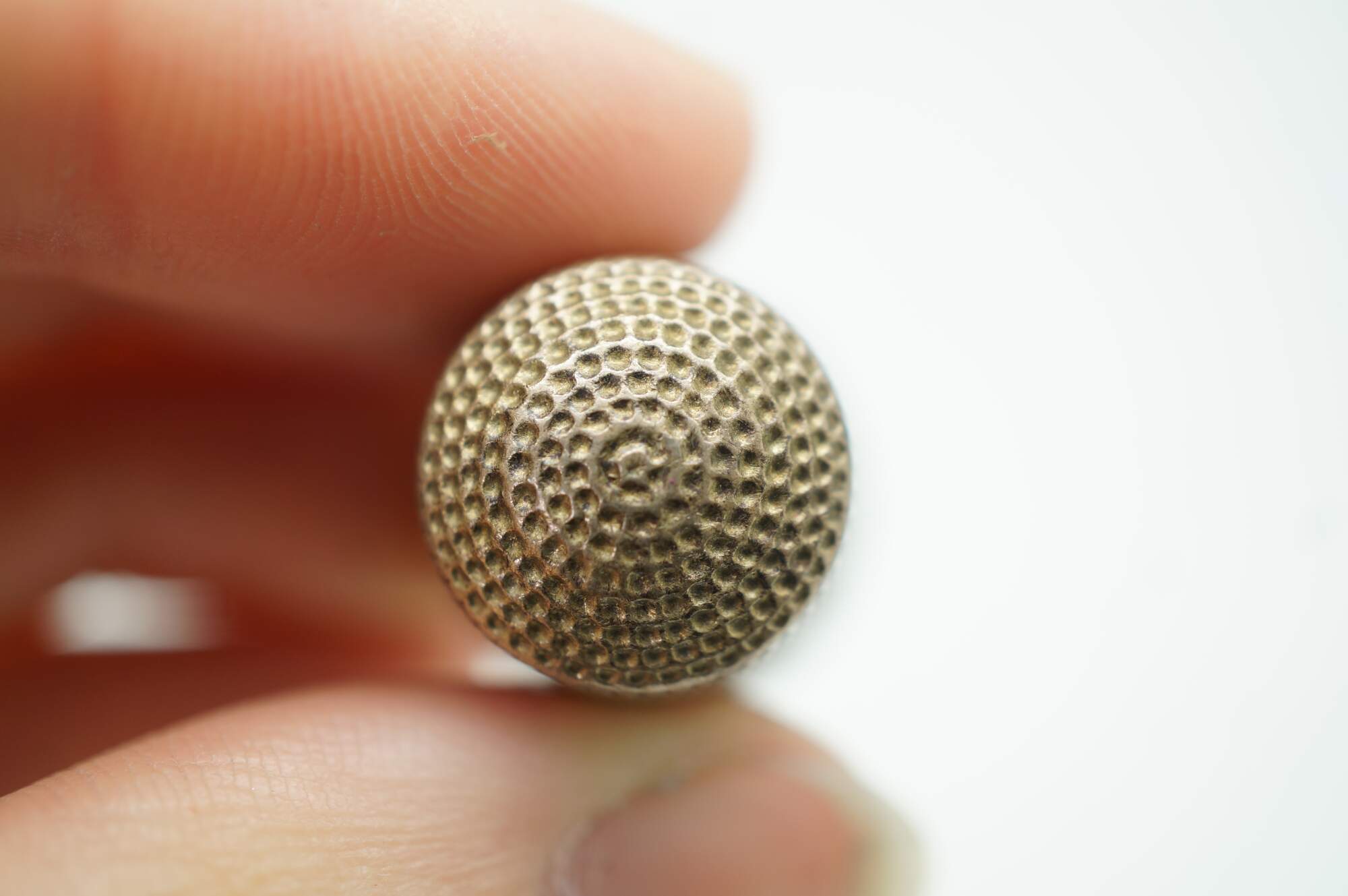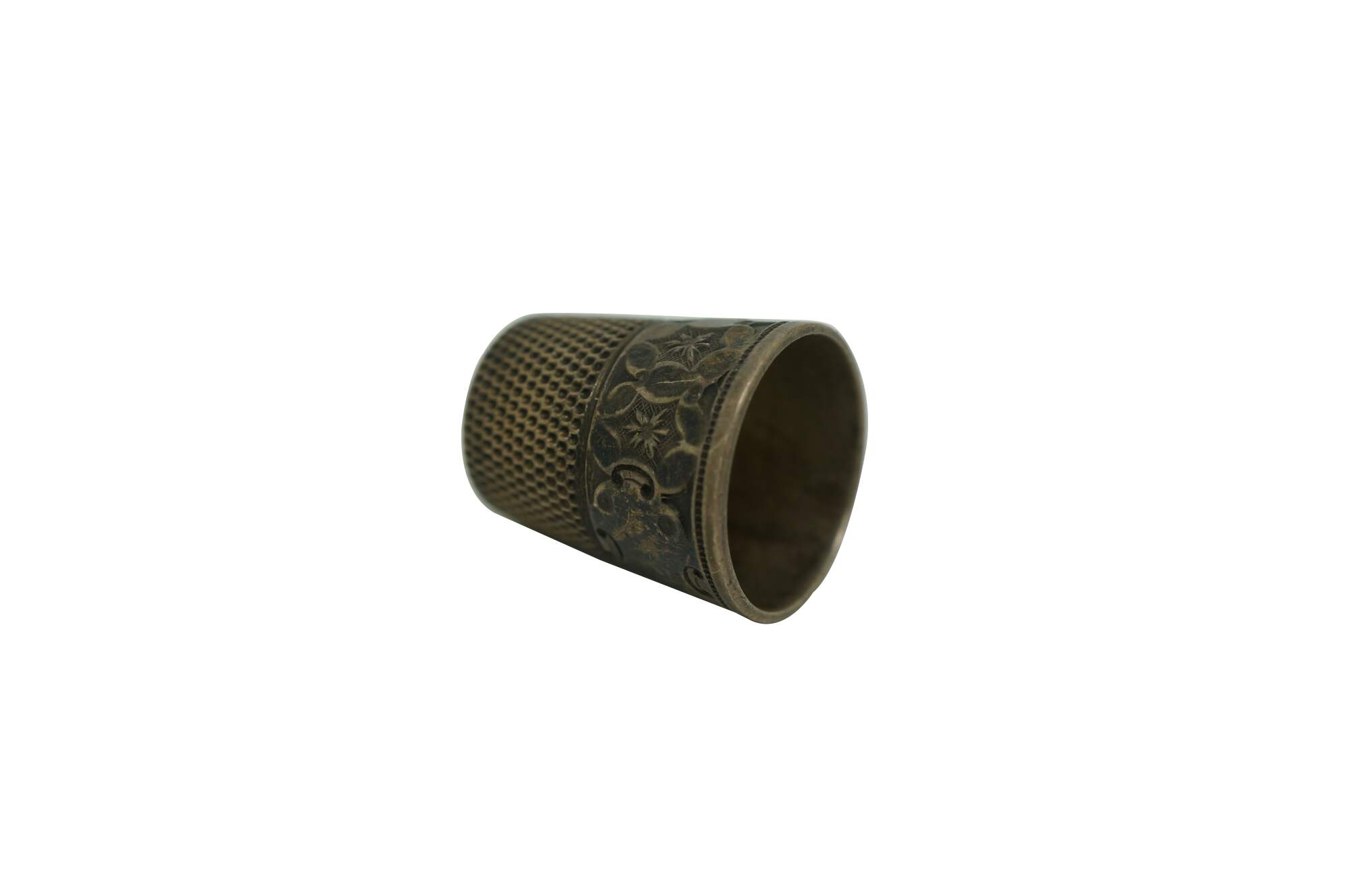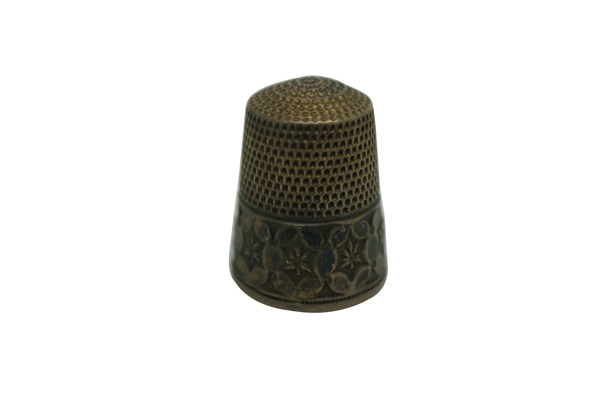 Antique Victorian Simons Brothers sterling silver .925 size 12 sewing thimble. The top features a textured, dimpled pattern, and the base has an intricately detailed band with an Art Nouveau floral star motif.