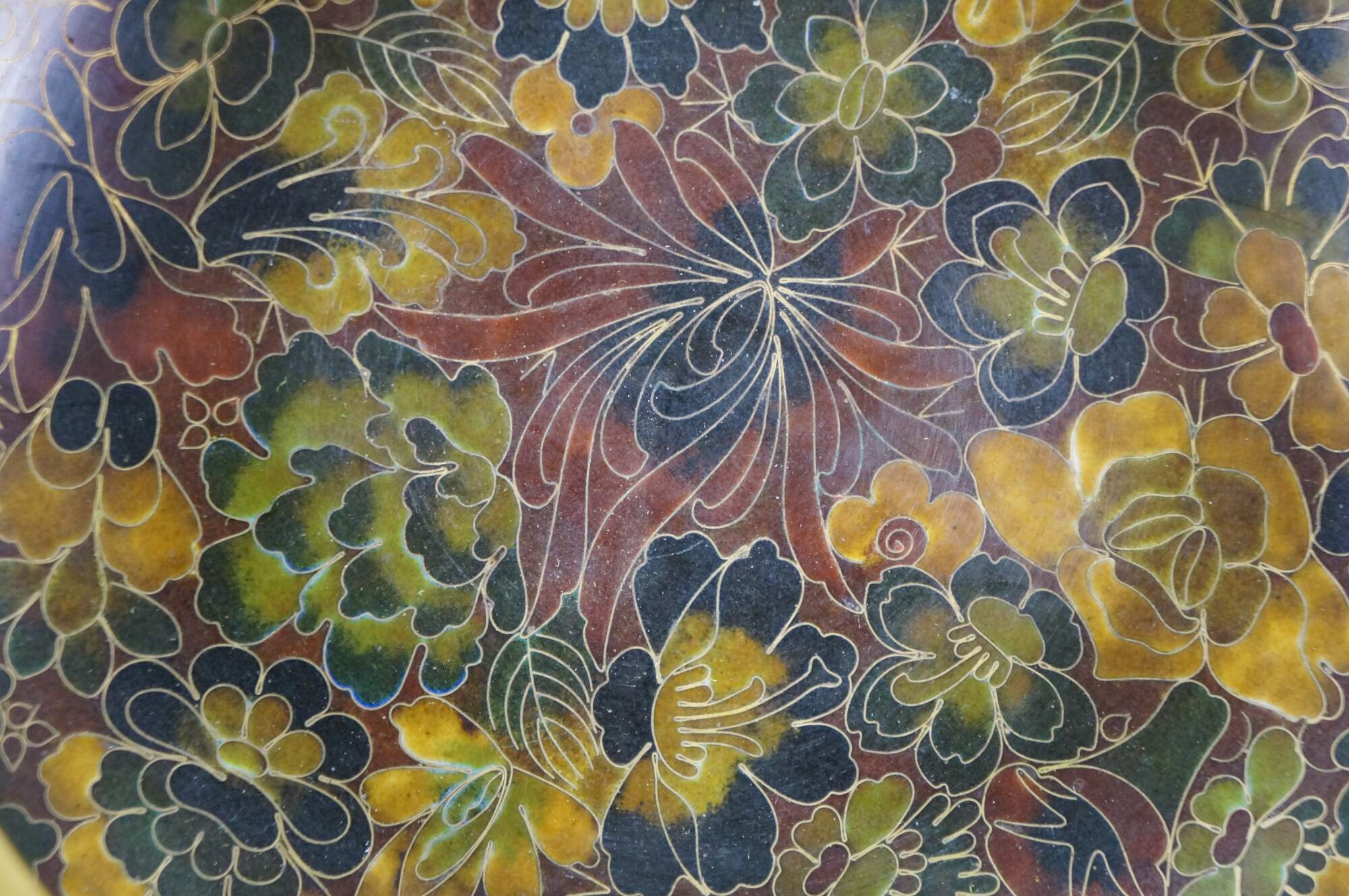 Vintage Chinese enameled brass brush bowl featuring a thousand flowers floral theme paired with a carved elm wood stand.
