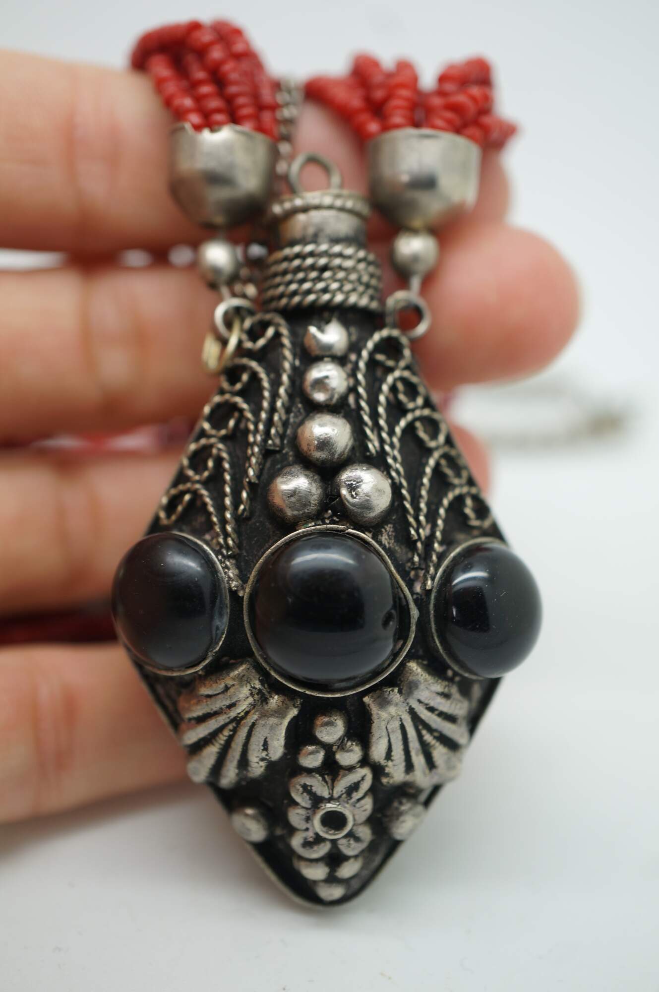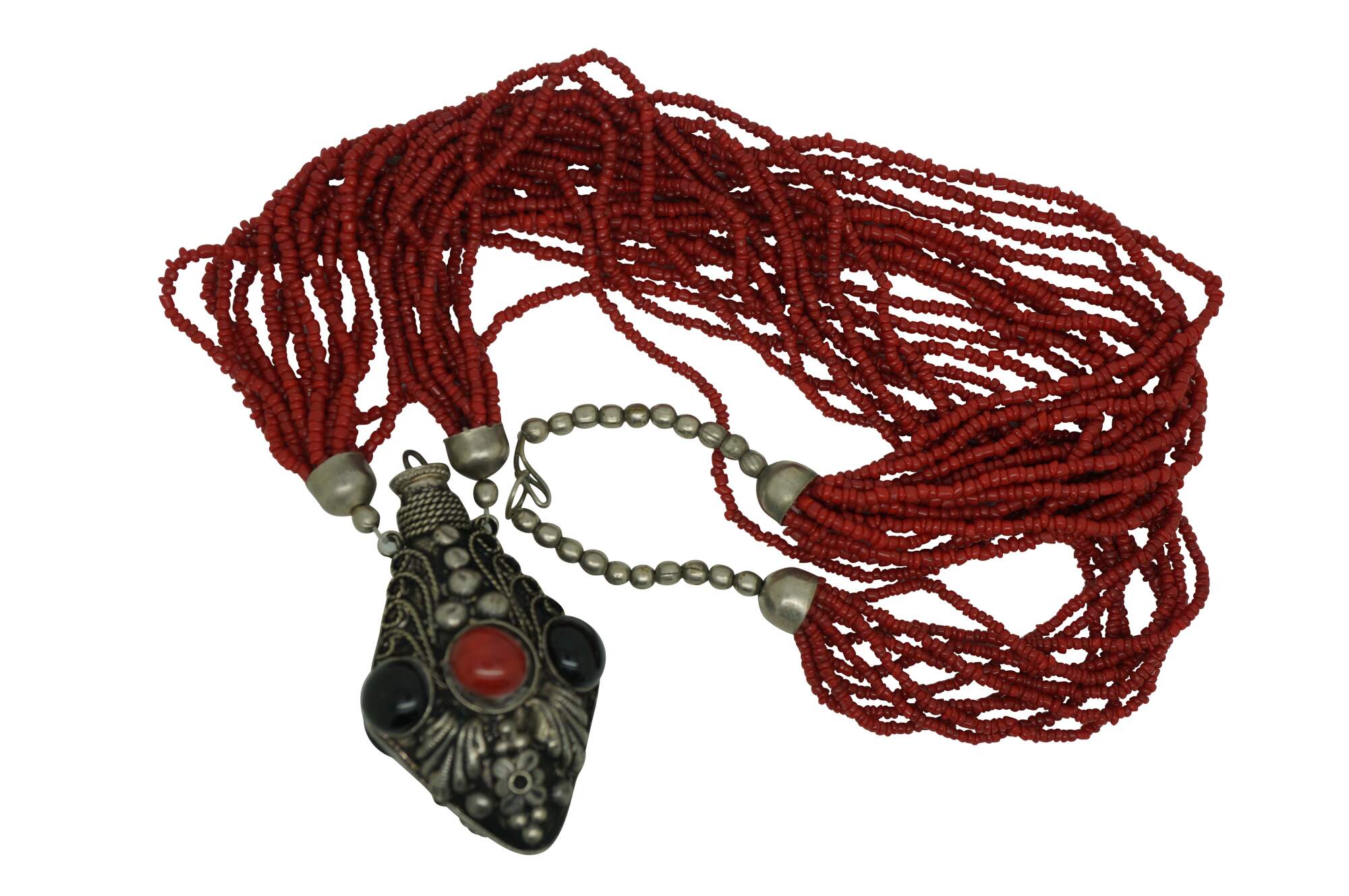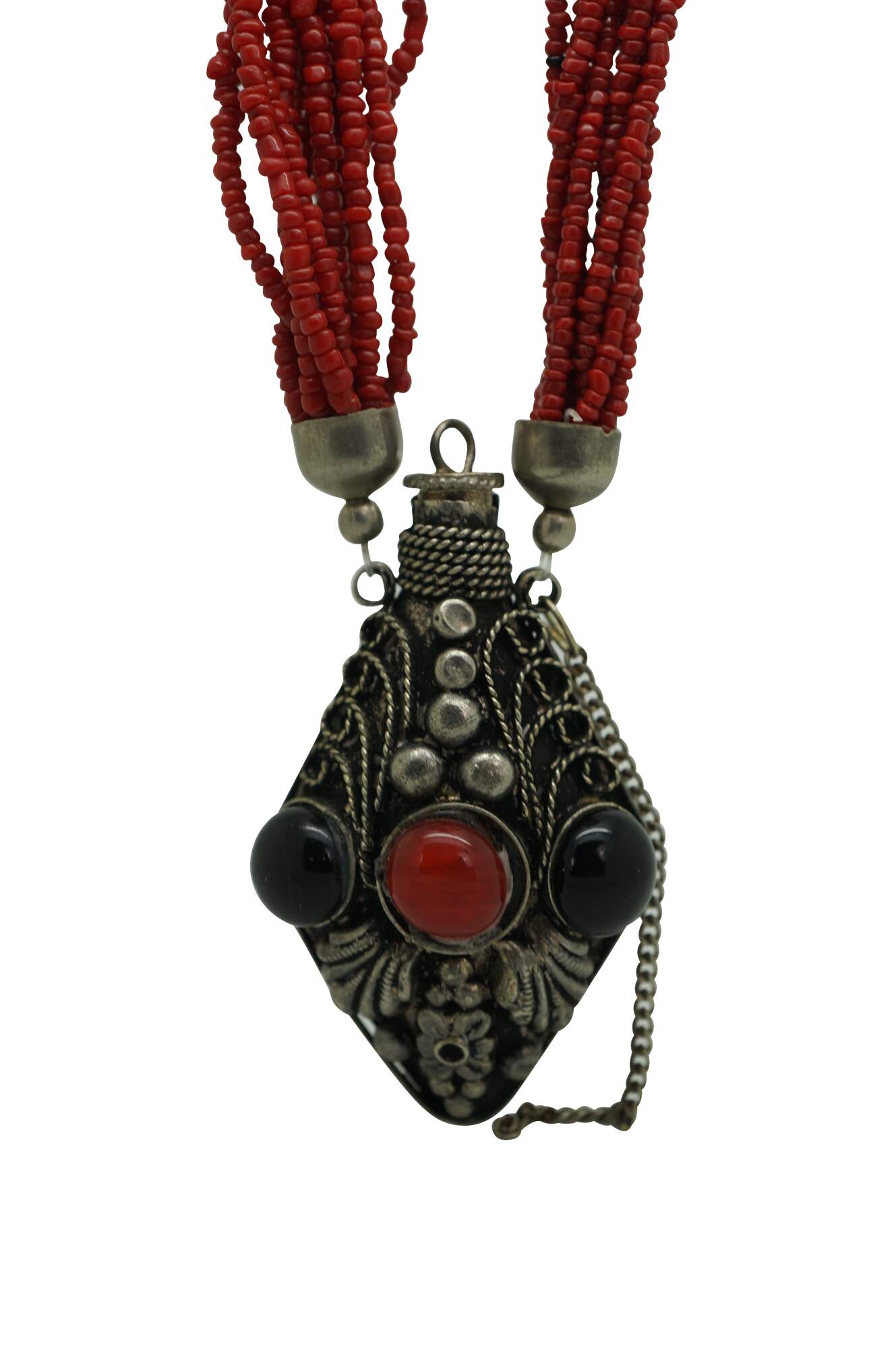 Antique Moroccan / Tibetan / Nepal style multi strand perfume / snuff bottle pendant necklace featuring faux black onyx and red coral colored seed beads / stones.