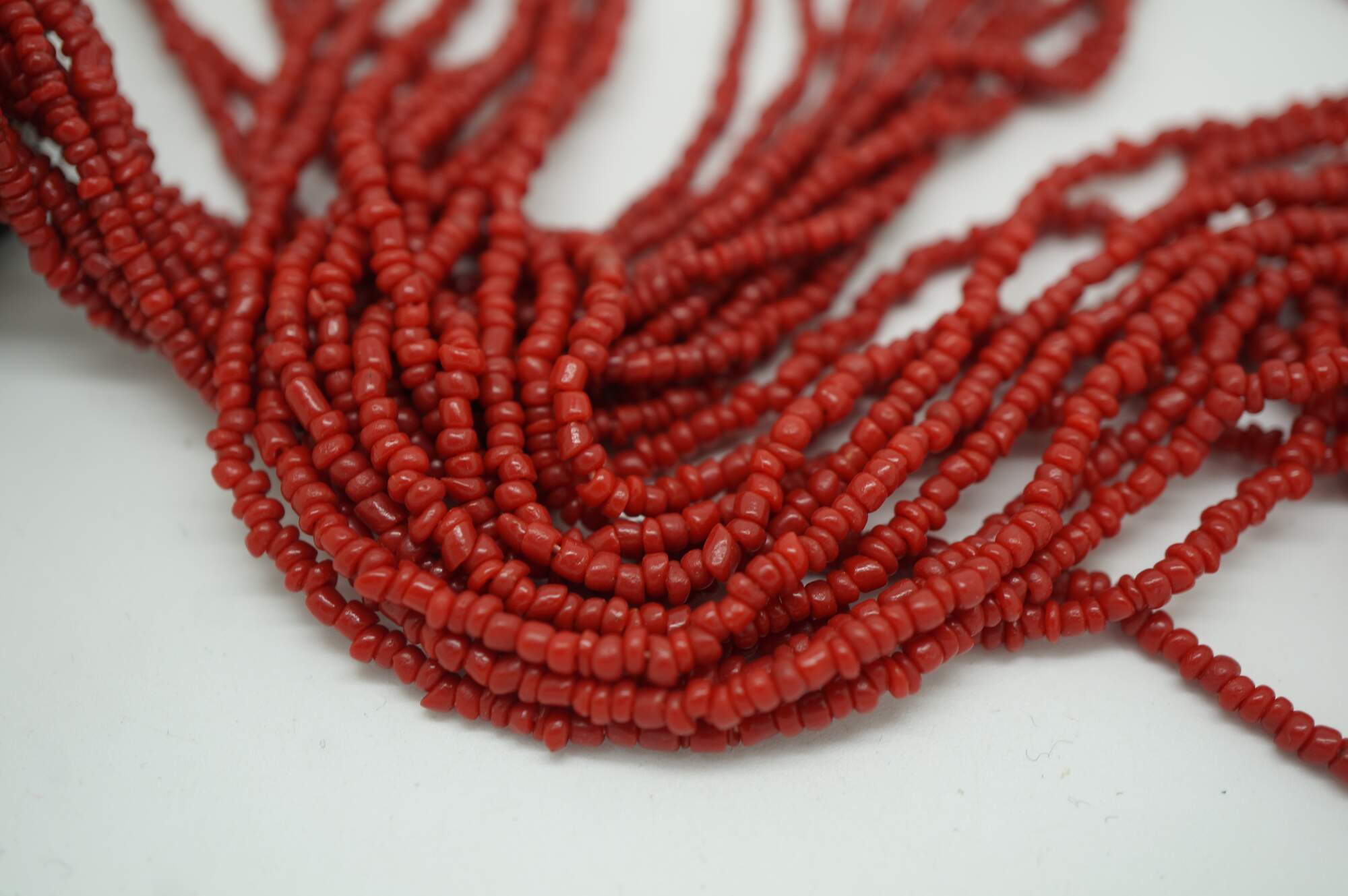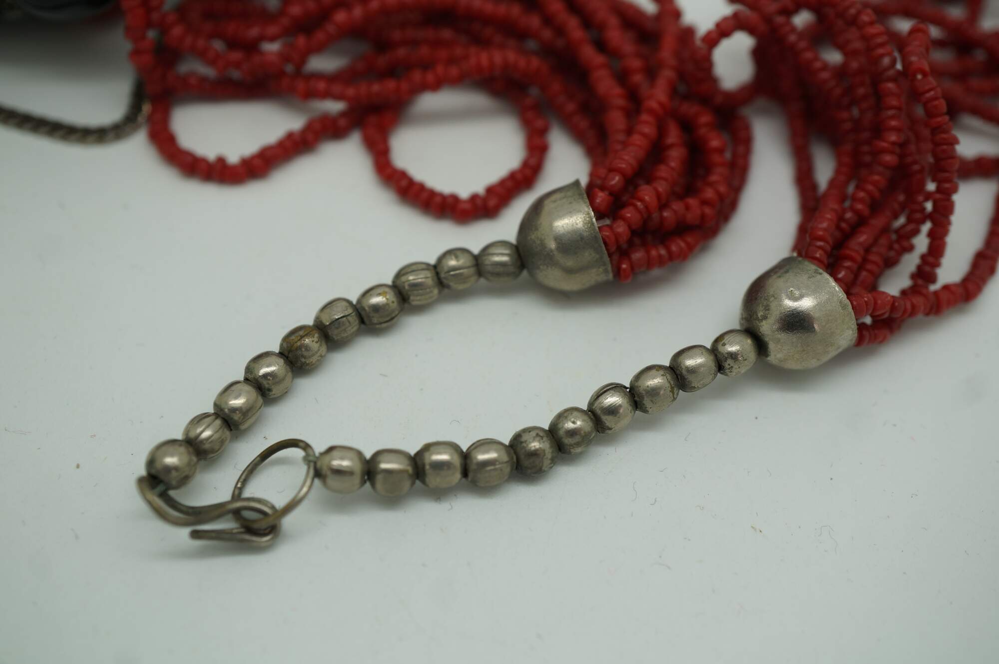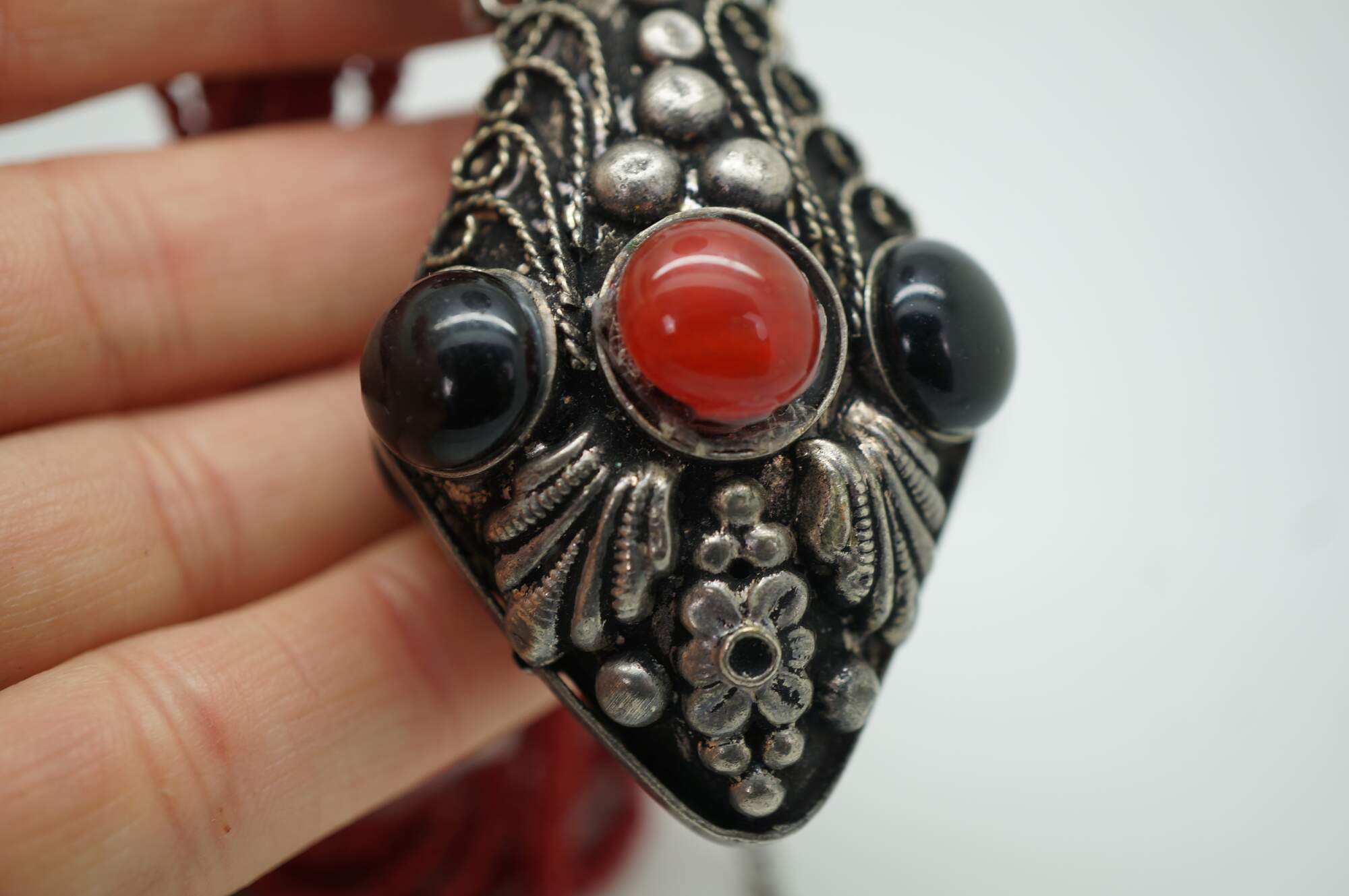 Antique Moroccan / Tibetan / Nepal style multi strand perfume / snuff bottle pendant necklace featuring faux black onyx and red coral colored seed beads / stones.