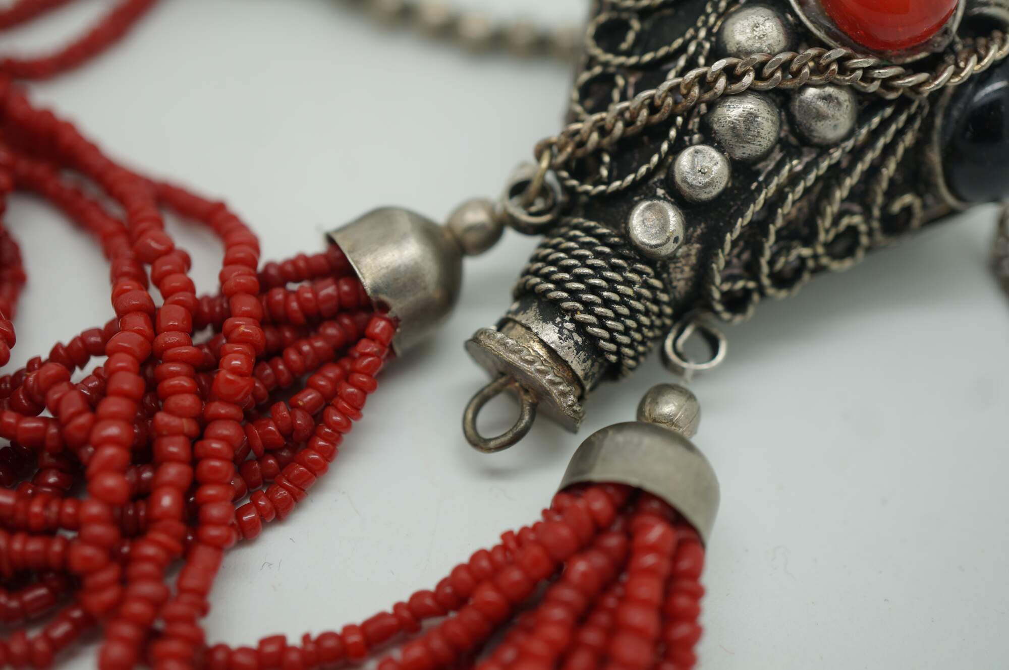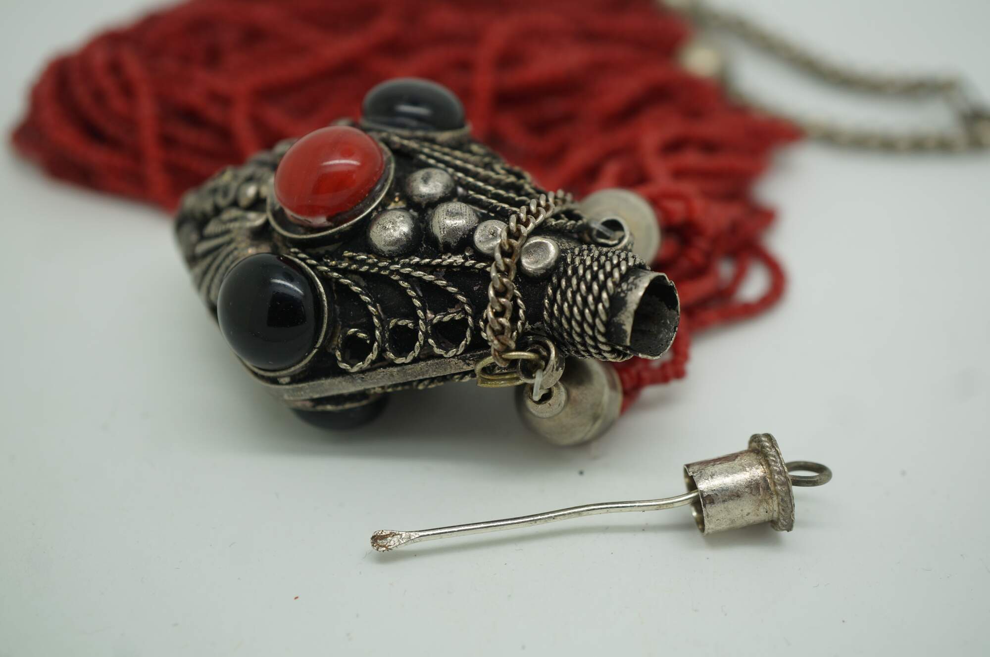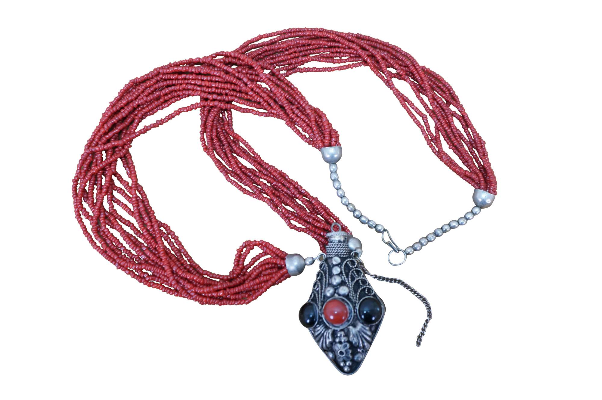 Antique Moroccan Tibetan Multi Strand Coral Onyx Snuff Bottle Pendant Necklace