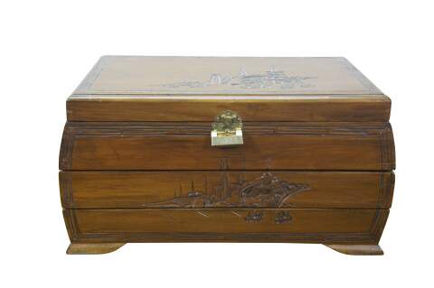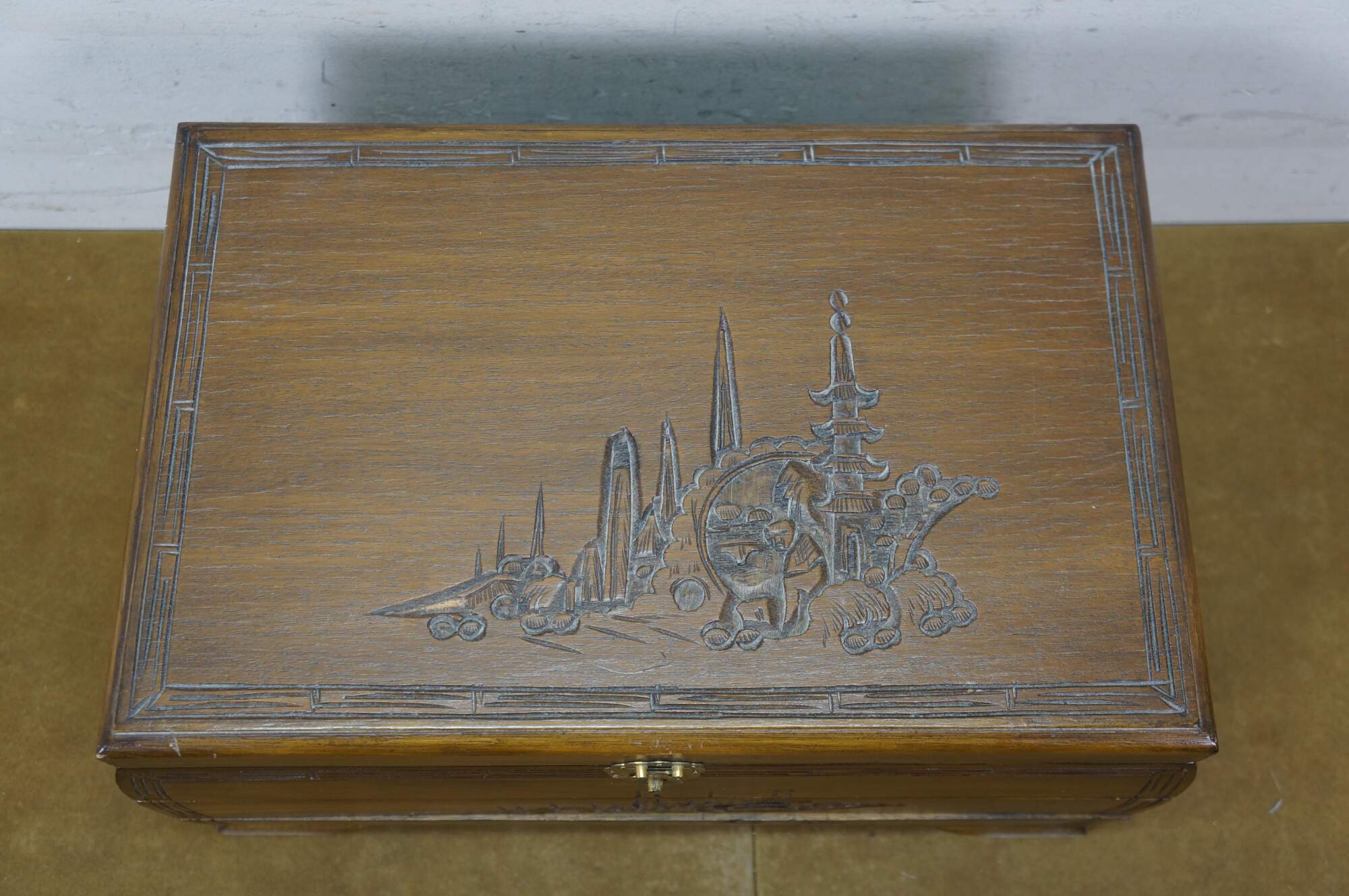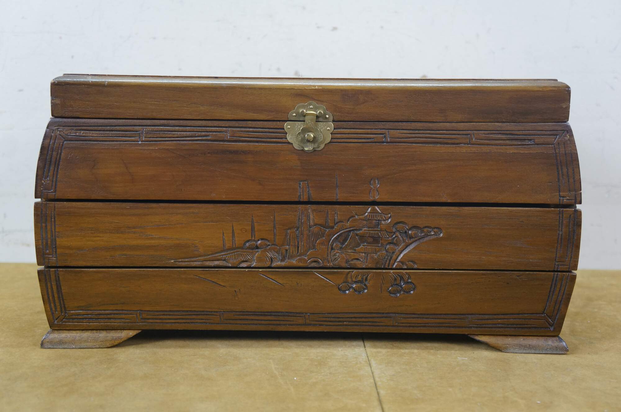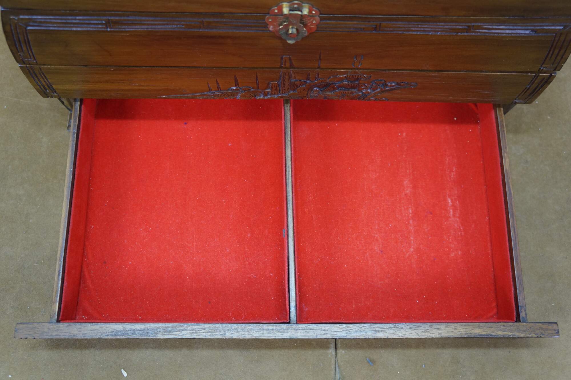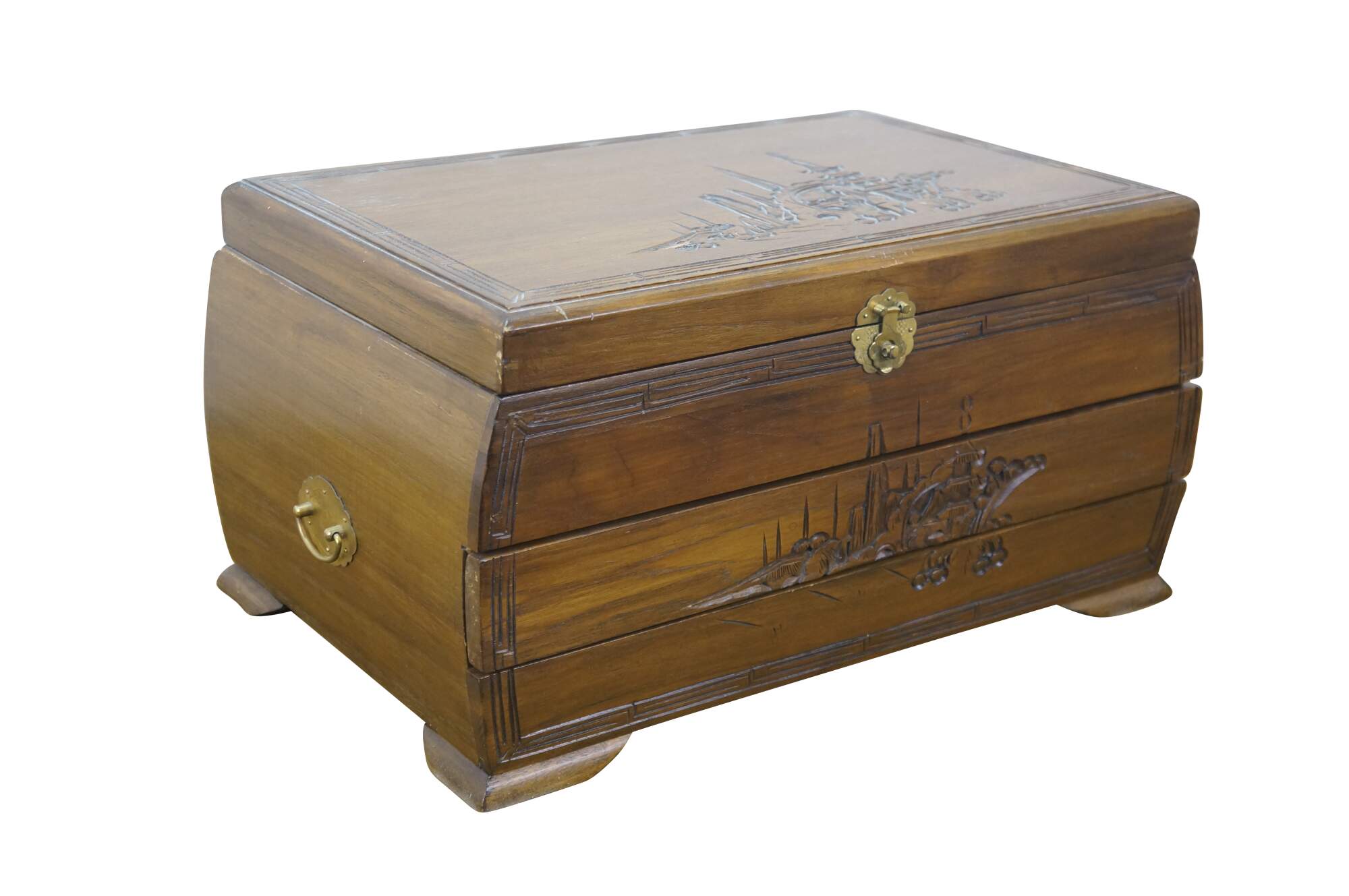 Vintage Japanese chinoiserie jewelry treasure chest. Made of Camphor Wood featuring a carved cityscape with Pagoda and etched brass hardware. The box interior features a mirror and red velvet lining, and includes fish style lock. Made in Okinawa Japan.