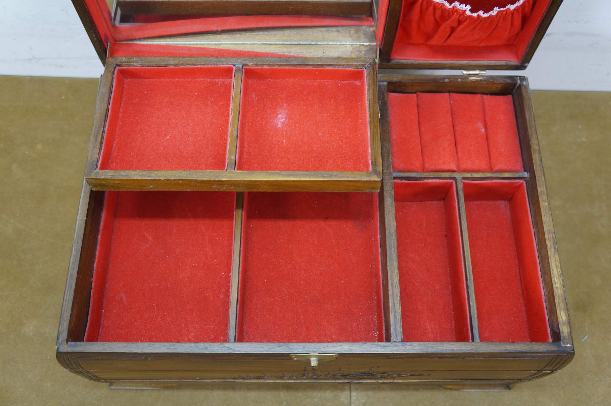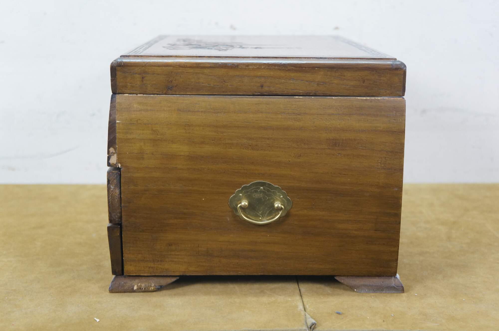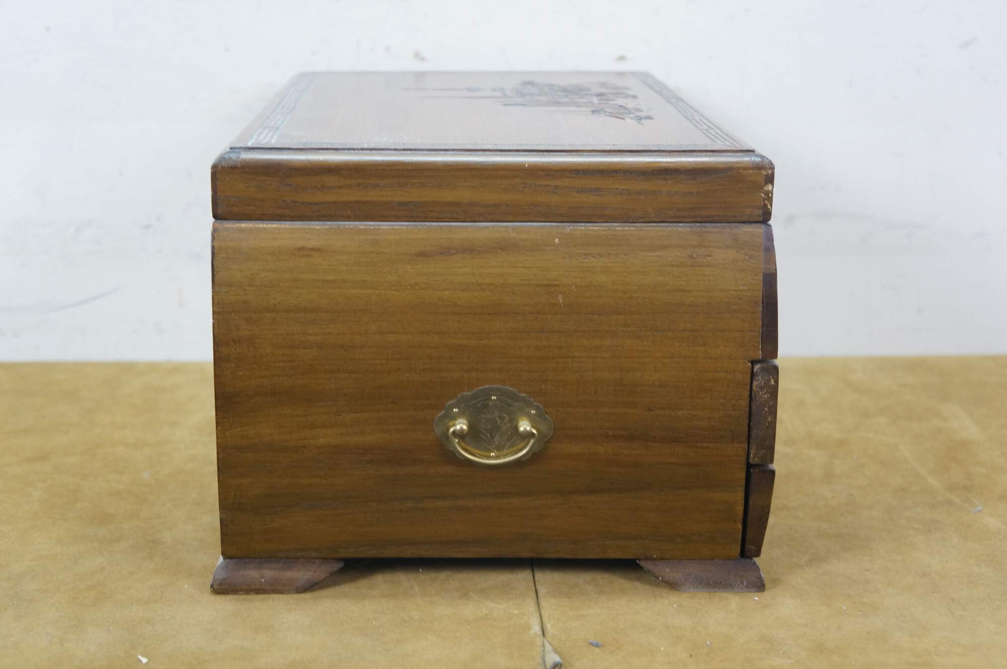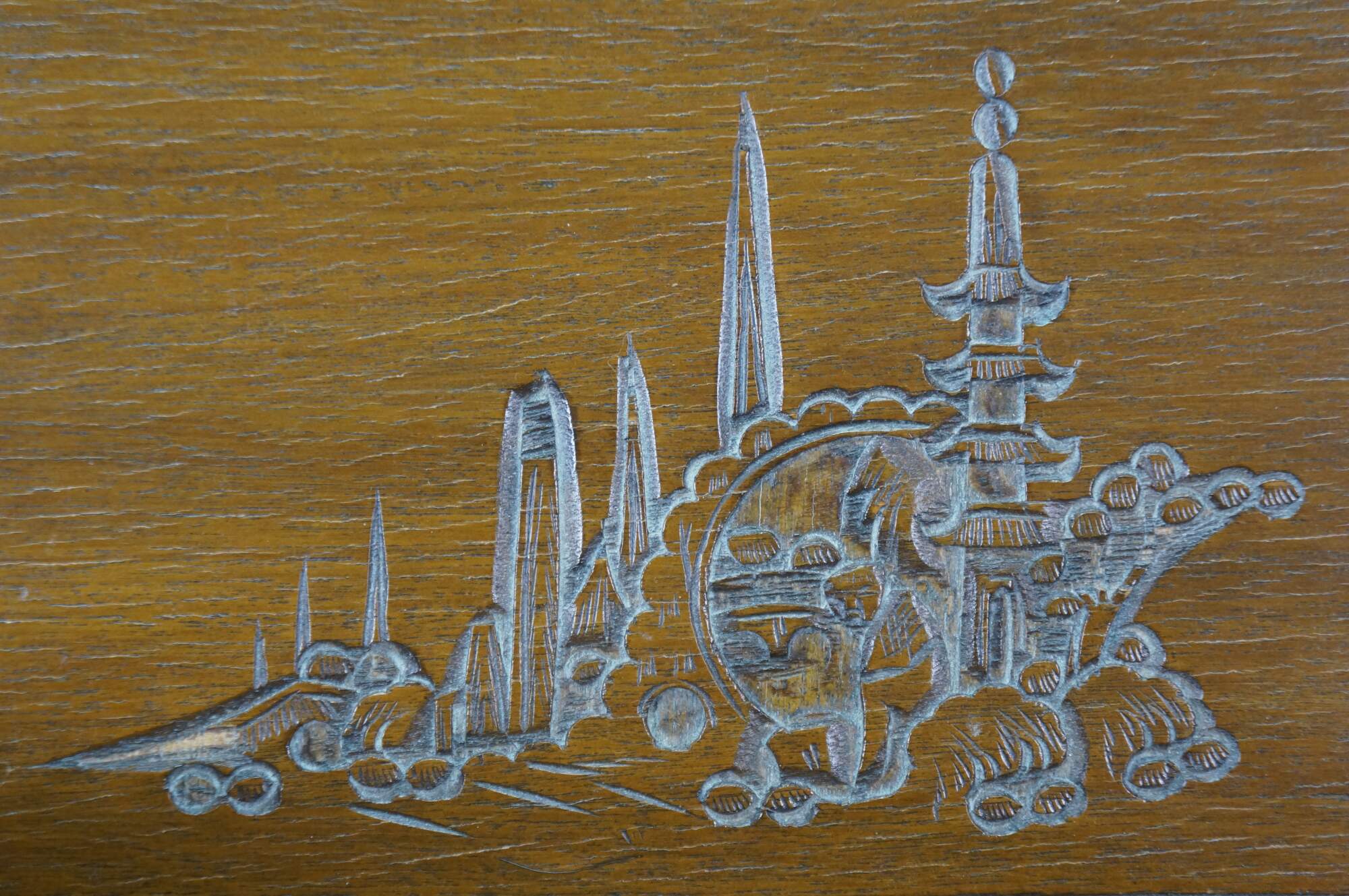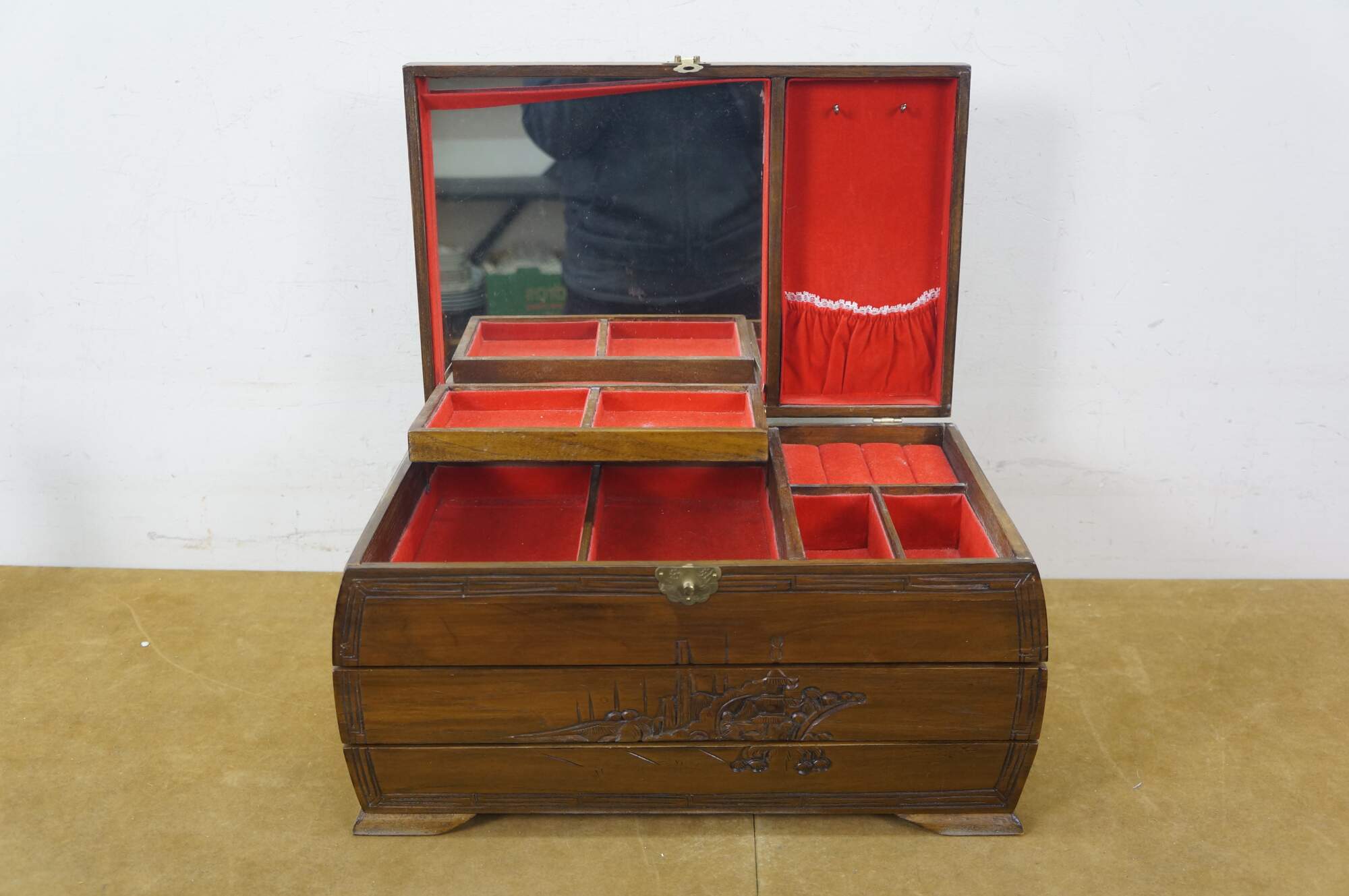 Vintage Japanese chinoiserie jewelry treasure chest. Made of Camphor Wood featuring a carved cityscape with Pagoda and etched brass hardware. The box interior features a mirror and red velvet lining, and includes fish style lock. Made in Okinawa Japan.
