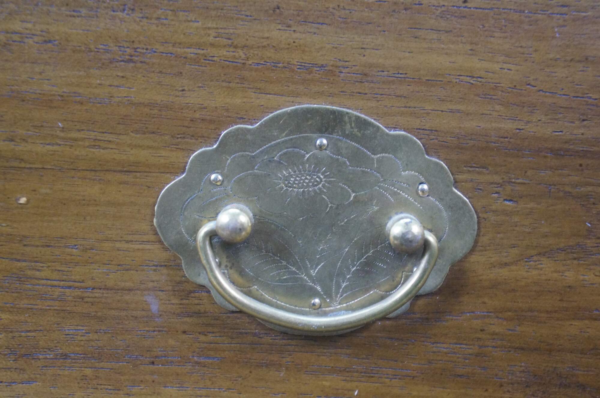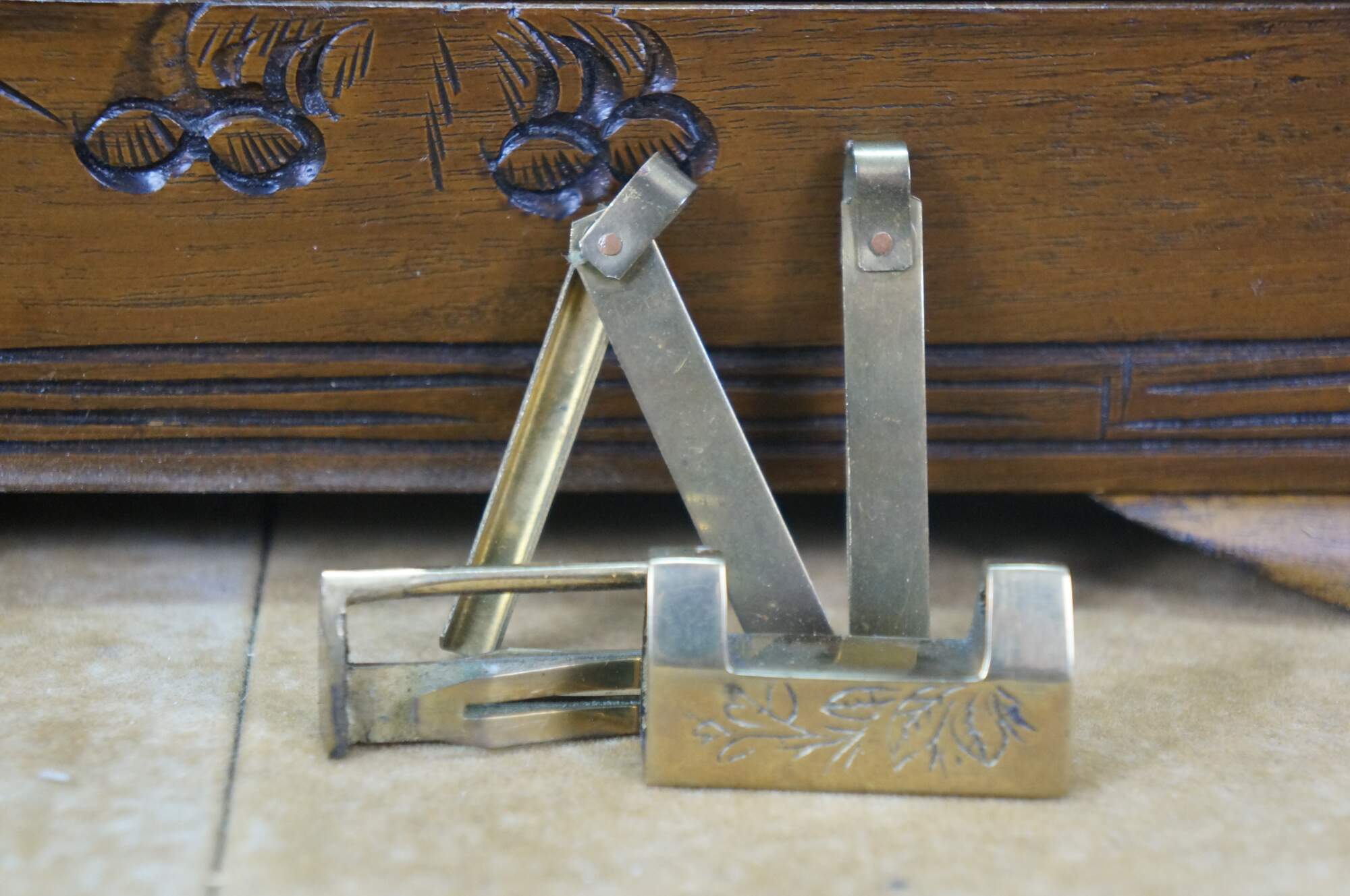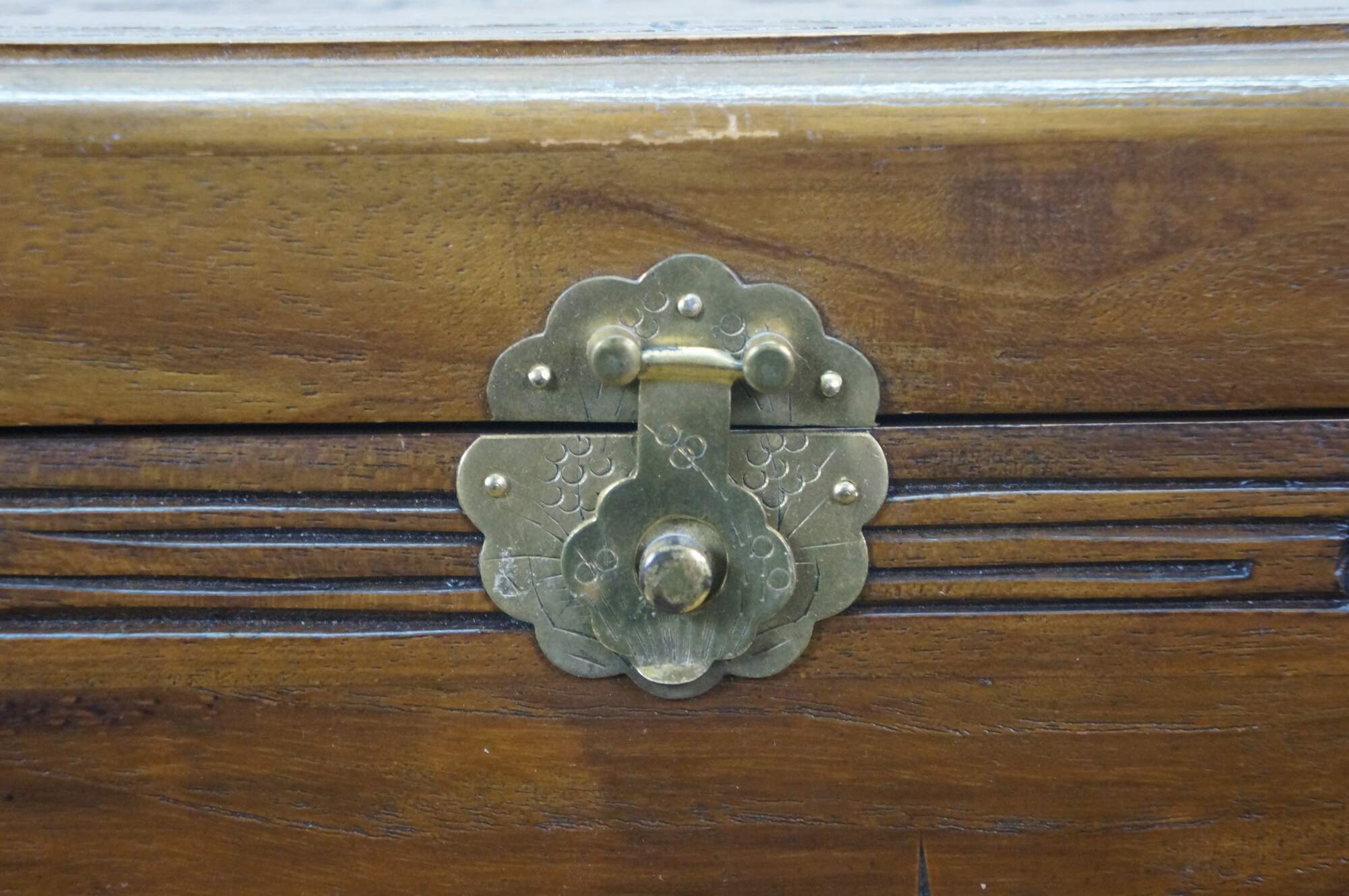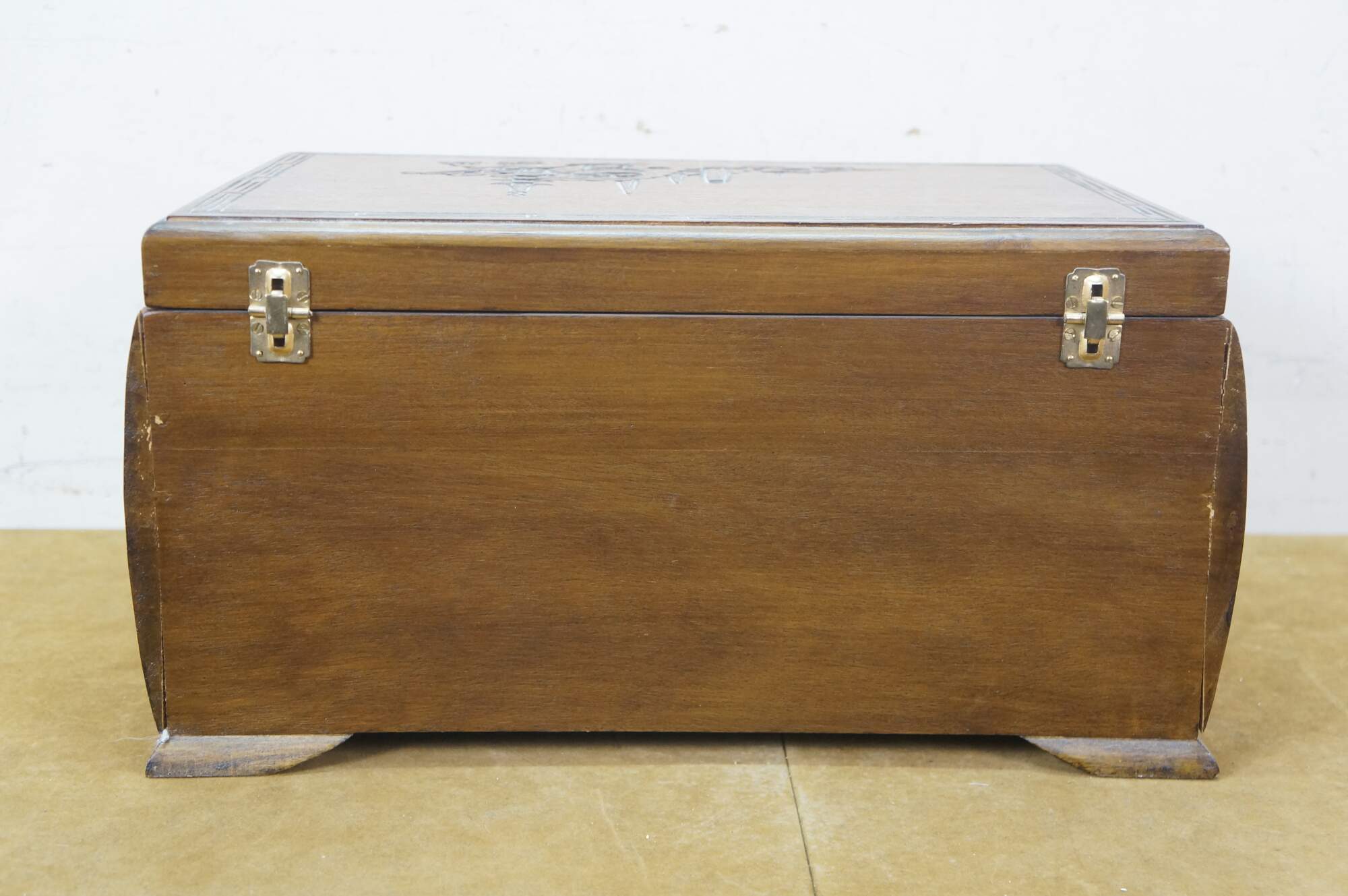 Vintage Japanese chinoiserie jewelry treasure chest. Made of Camphor Wood featuring a carved cityscape with Pagoda and etched brass hardware. The box interior features a mirror and red velvet lining, and includes fish style lock. Made in Okinawa Japan.