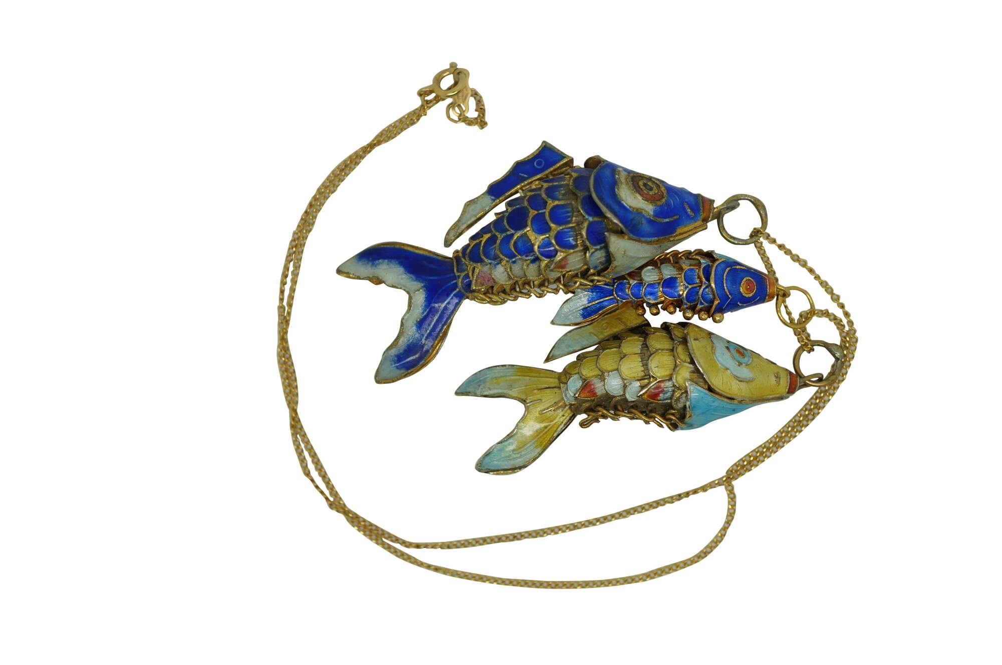 Vintage Chinese cloisonne enameled articulated string of Koi fish pendant / charm / ornament necklace. 1/20th 12k gold filled.