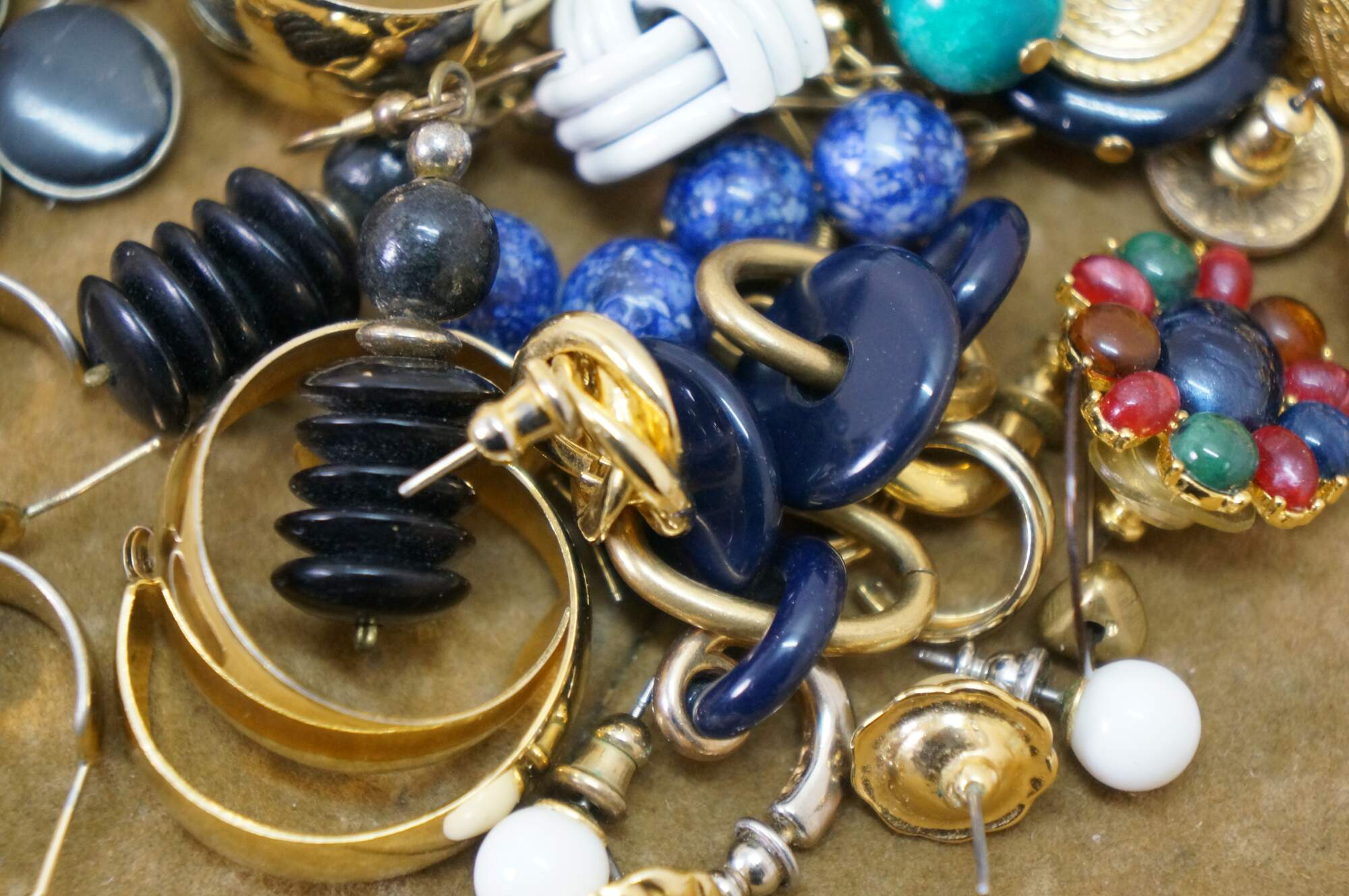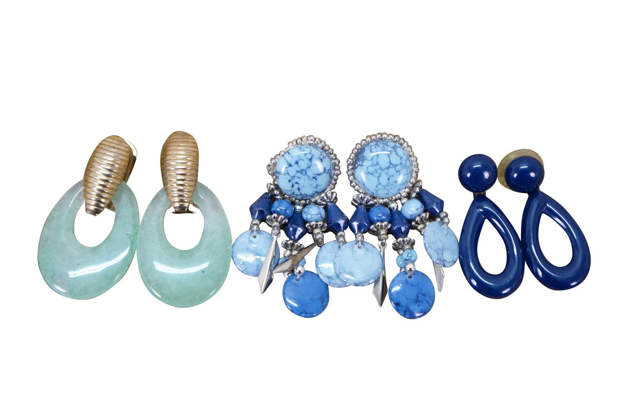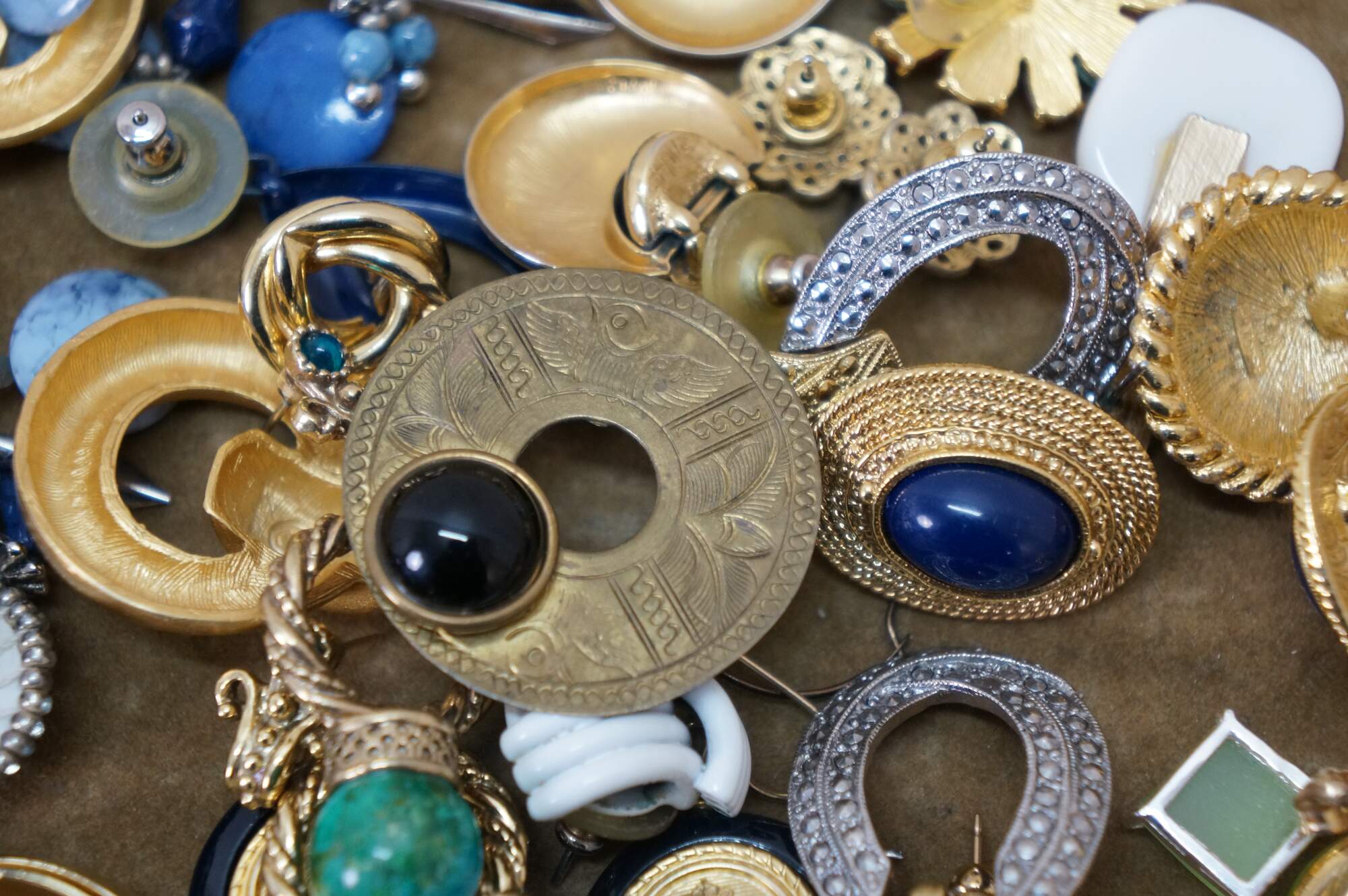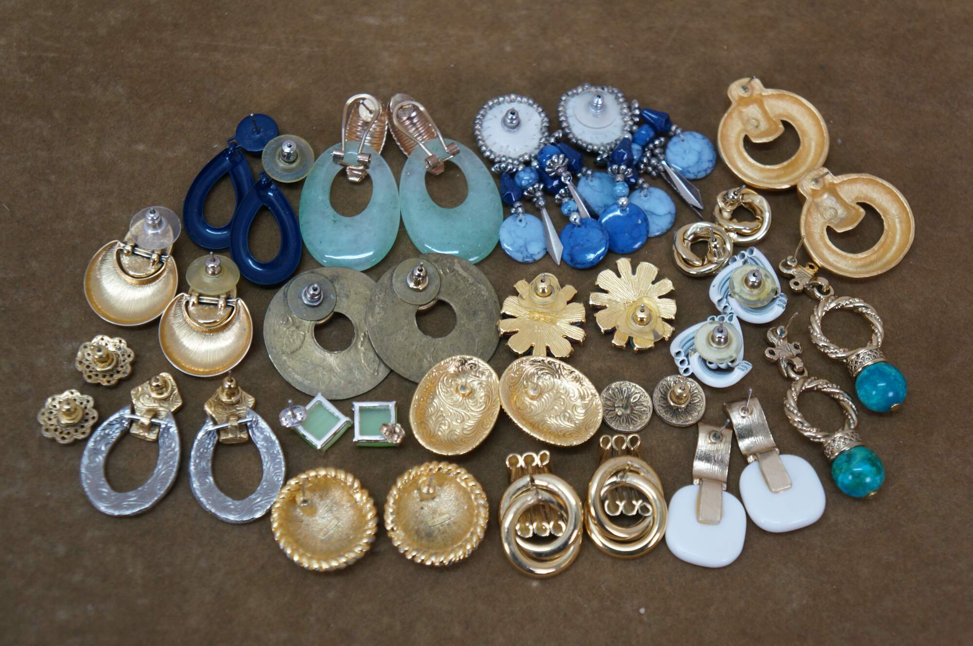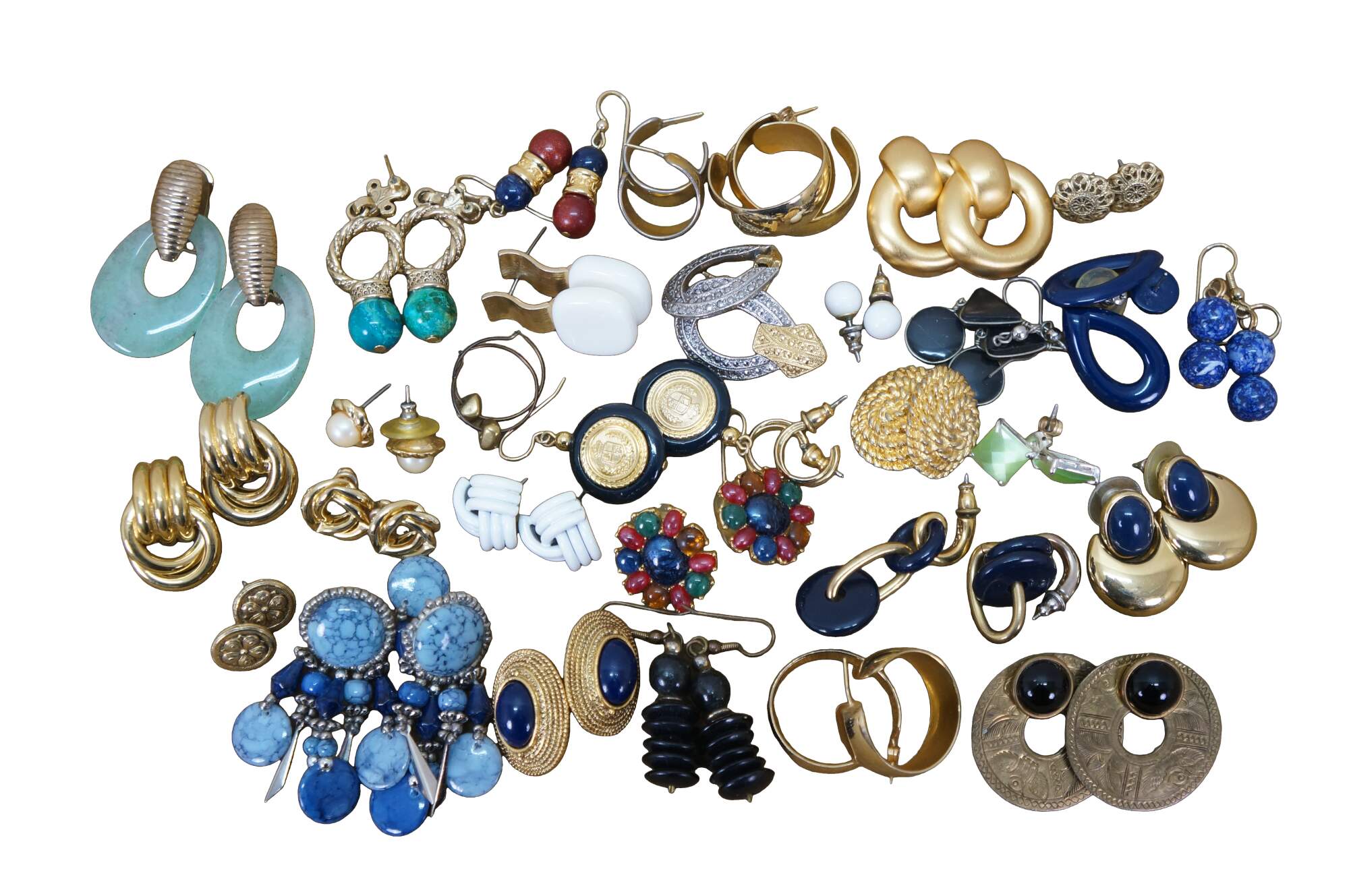 Vintage lot of 31 pierced earrings in a variety of styles. Materials include green jade, lucite, marcasite, resin, gold and silver tone, etched brass, black onyx, beaded and polished stone, etc.