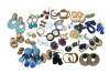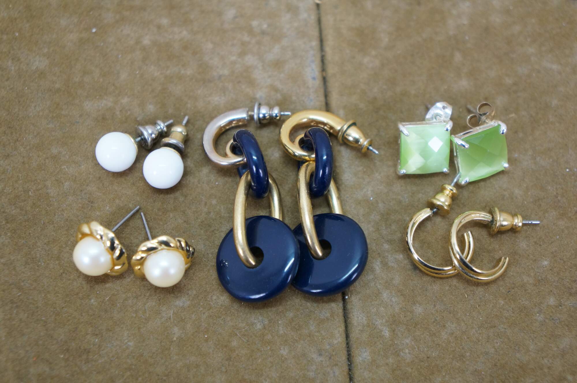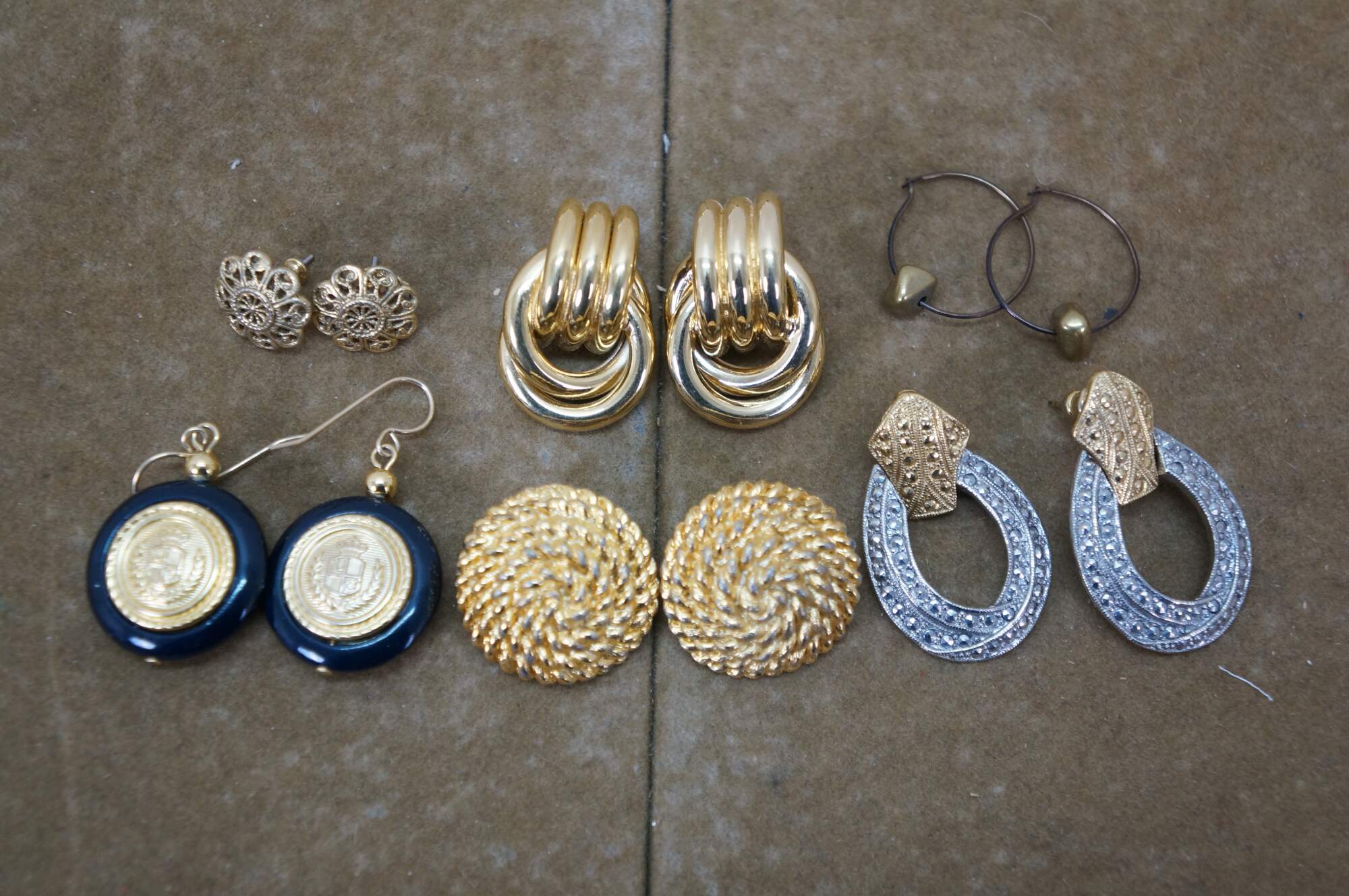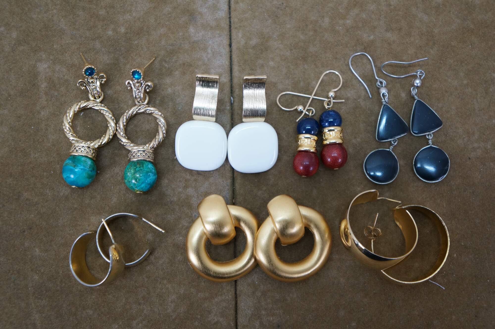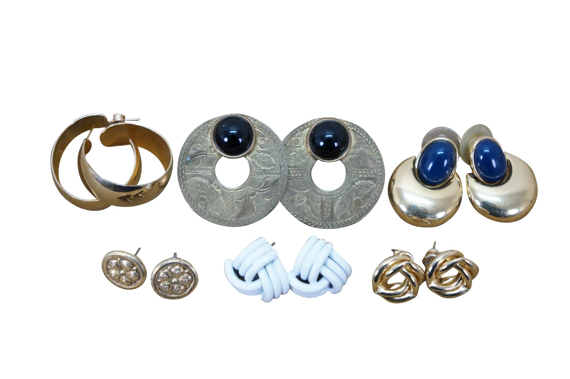 Vintage lot of 31 pierced earrings in a variety of styles. Materials include green jade, lucite, marcasite, resin, gold and silver tone, etched brass, black onyx, beaded and polished stone, etc.