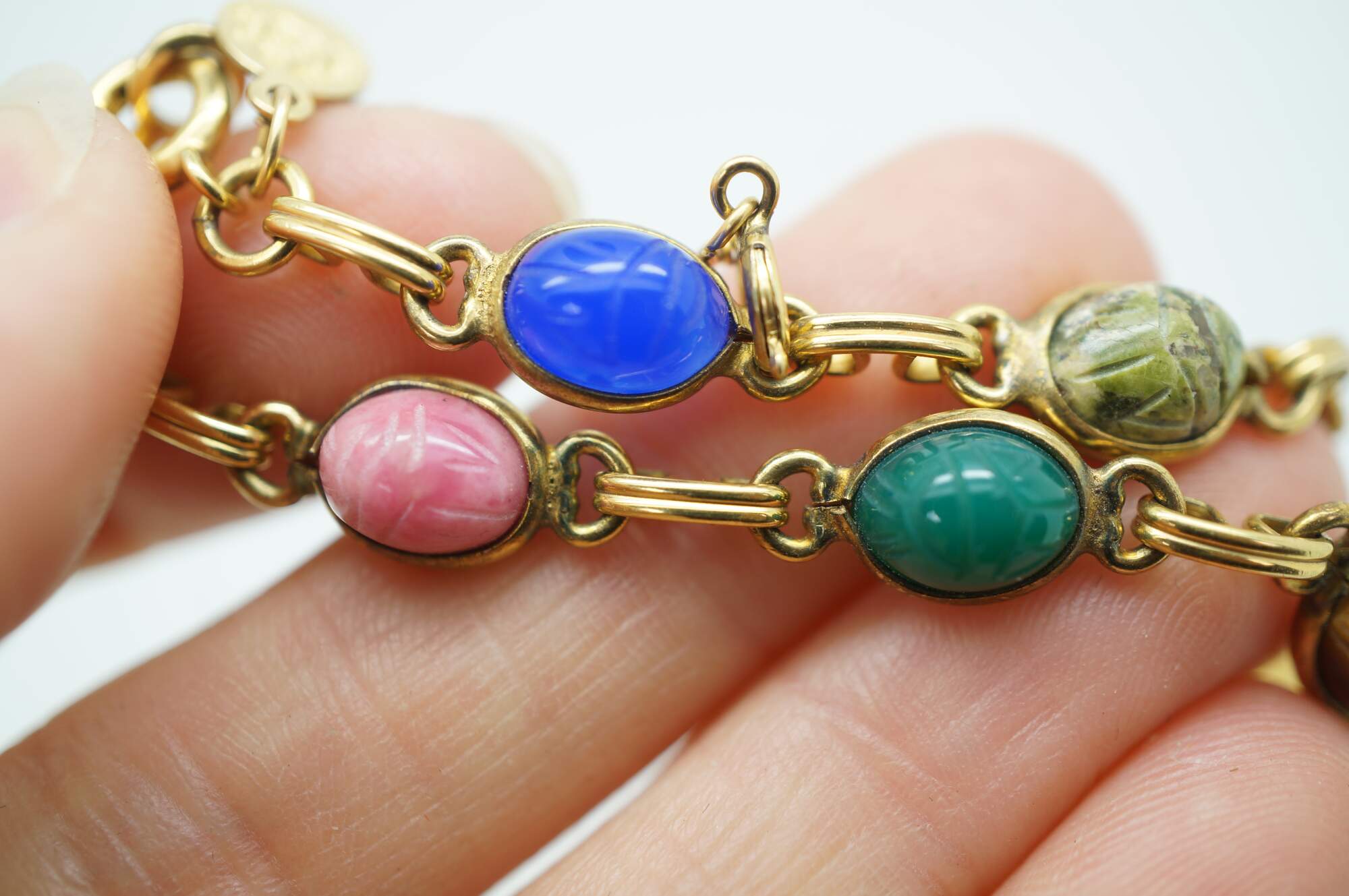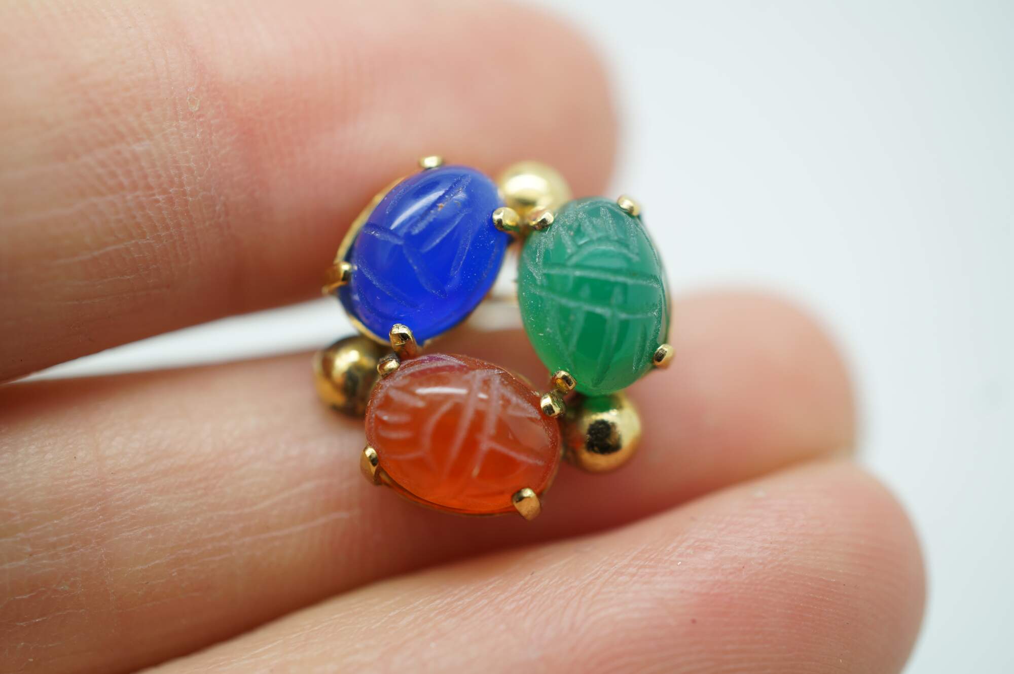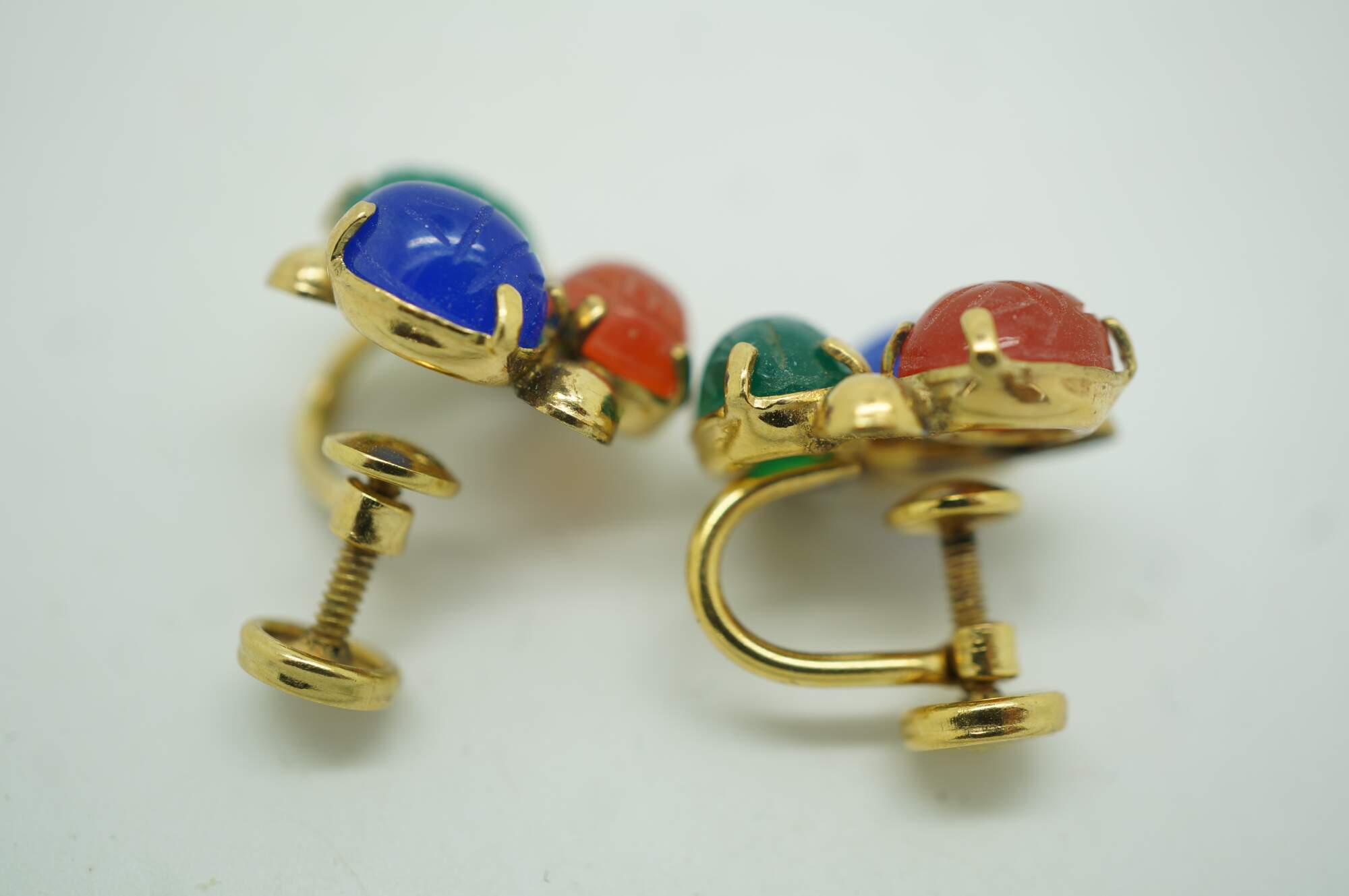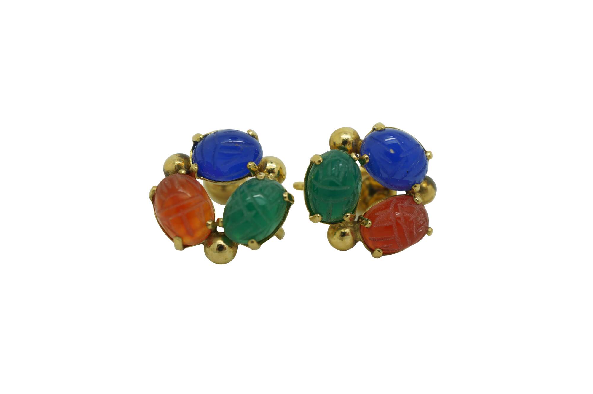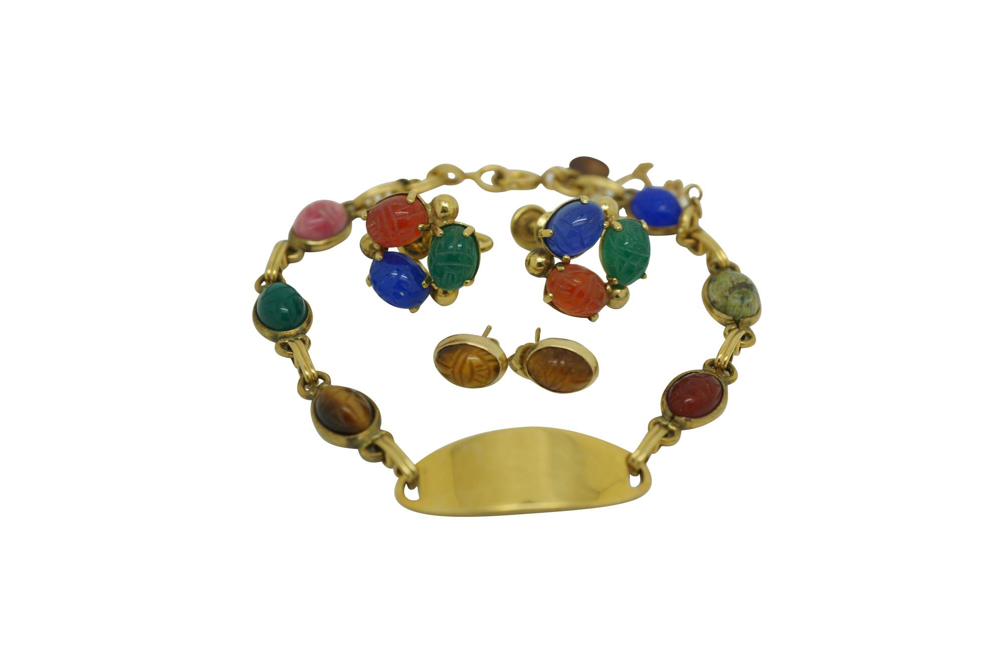 Vintage Egyptian Revival scarab beetle bracelet and two pairs of earrings jewelry set featuring carved multi-colored gemstones and 1/20th 12k gold settings.
