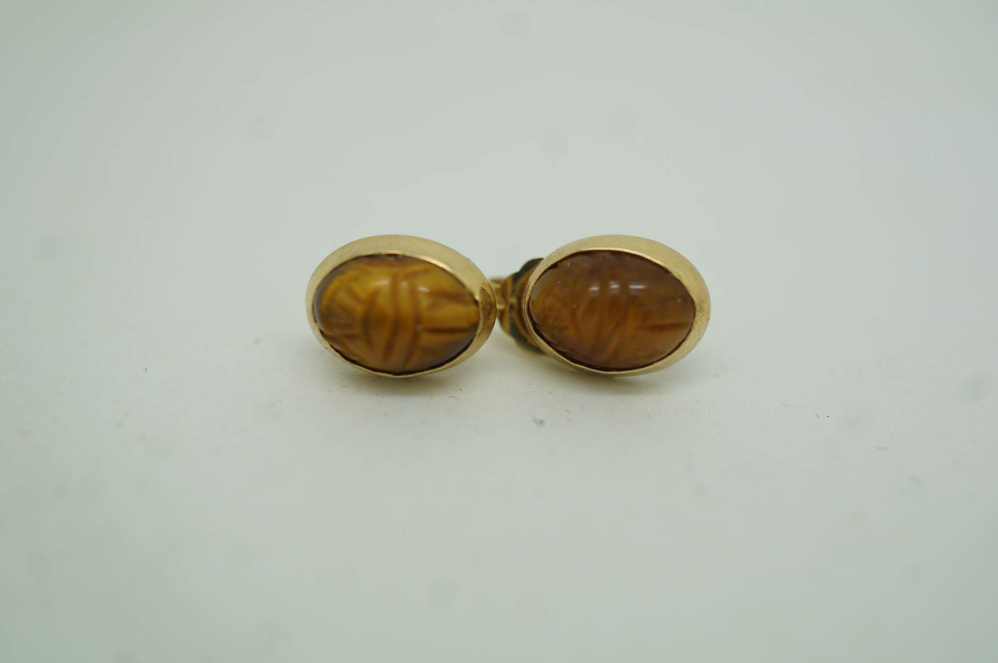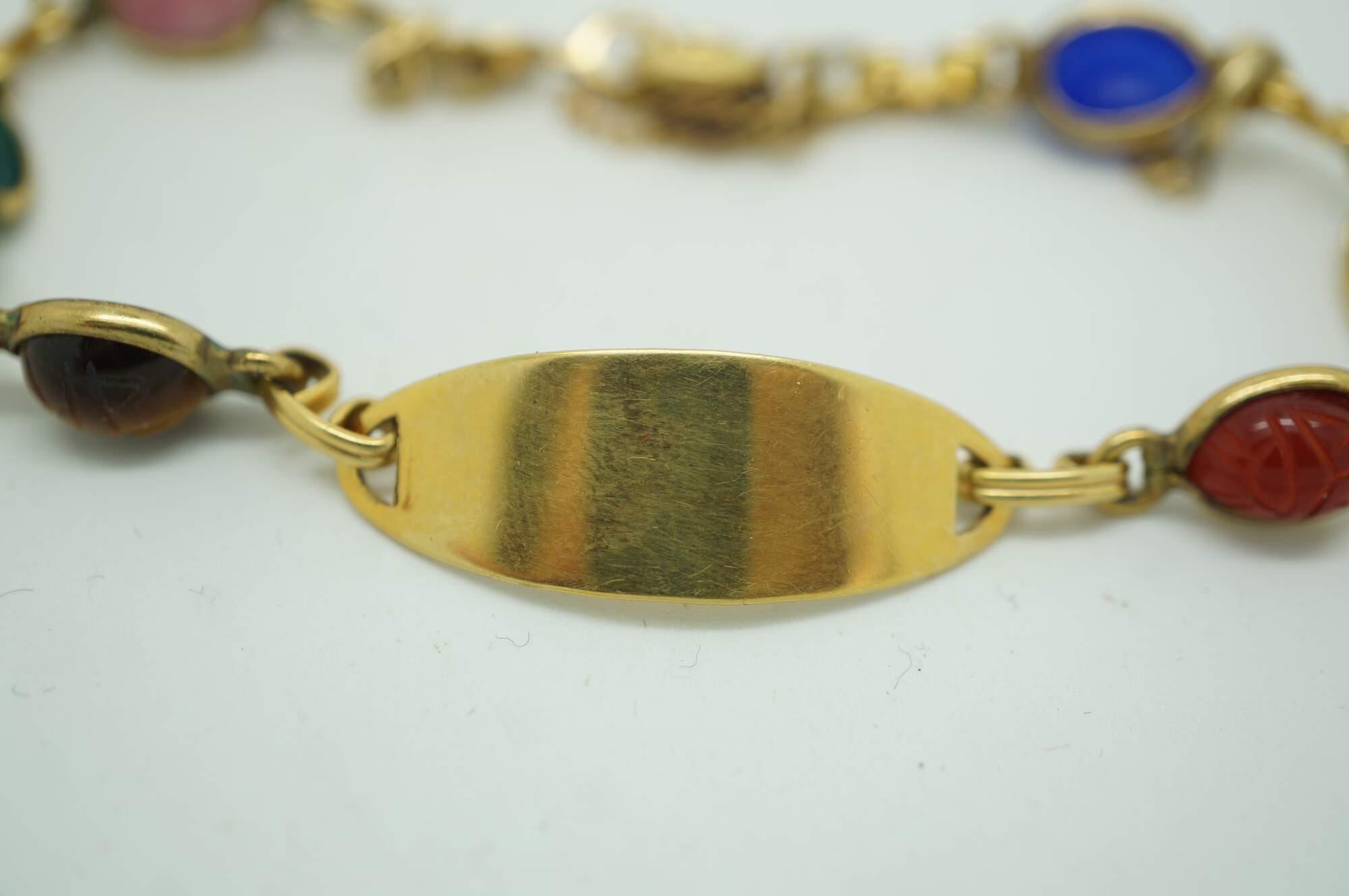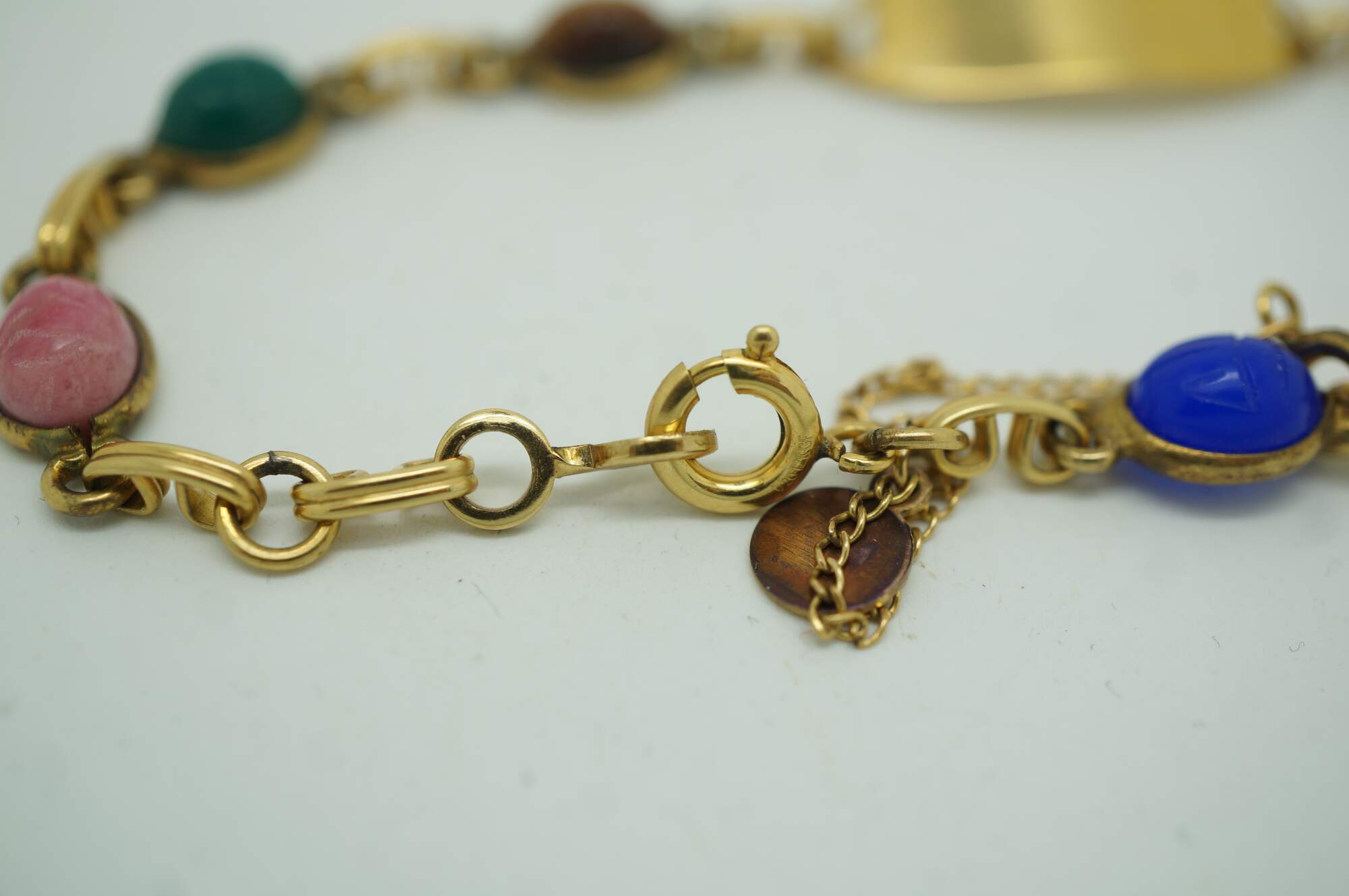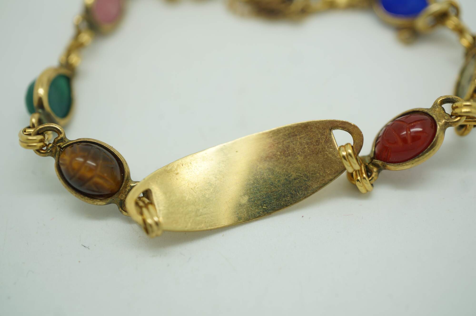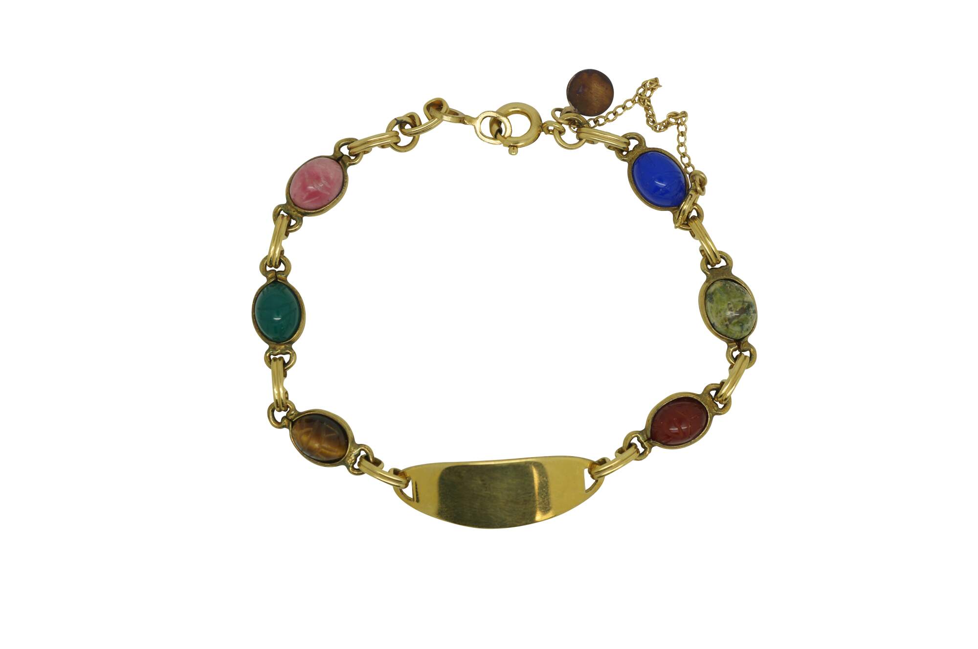 Vintage Egyptian Revival scarab beetle bracelet and two pairs of earrings jewelry set featuring carved multi-colored gemstones and 1/20th 12k gold settings.