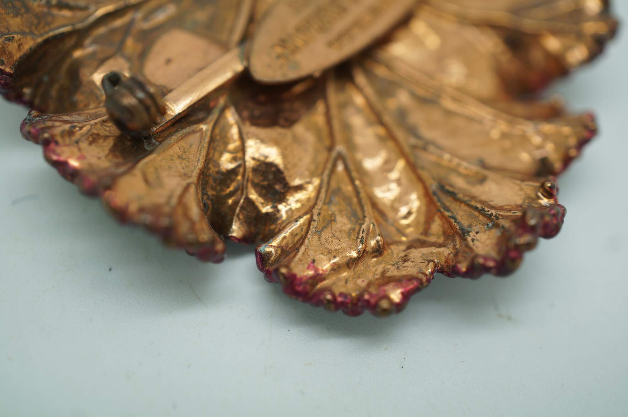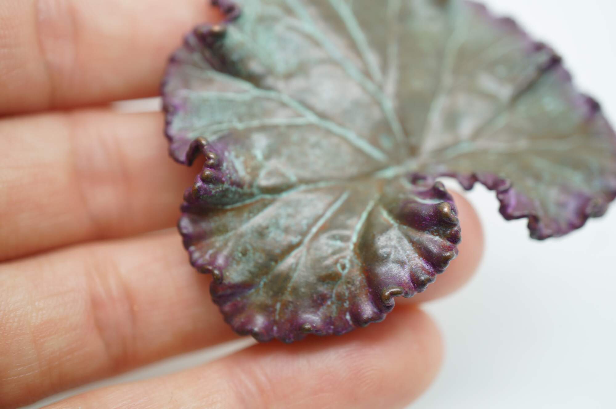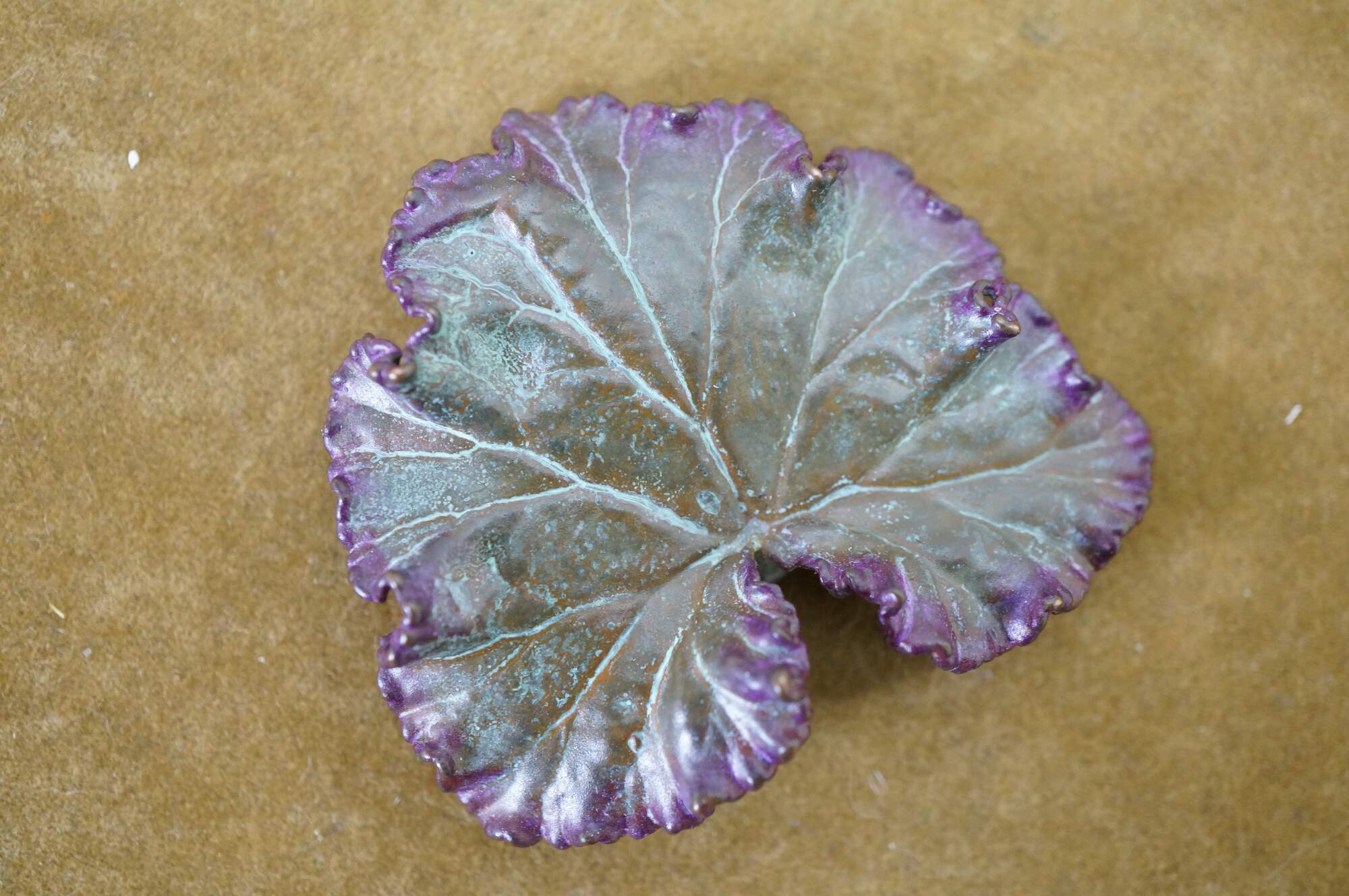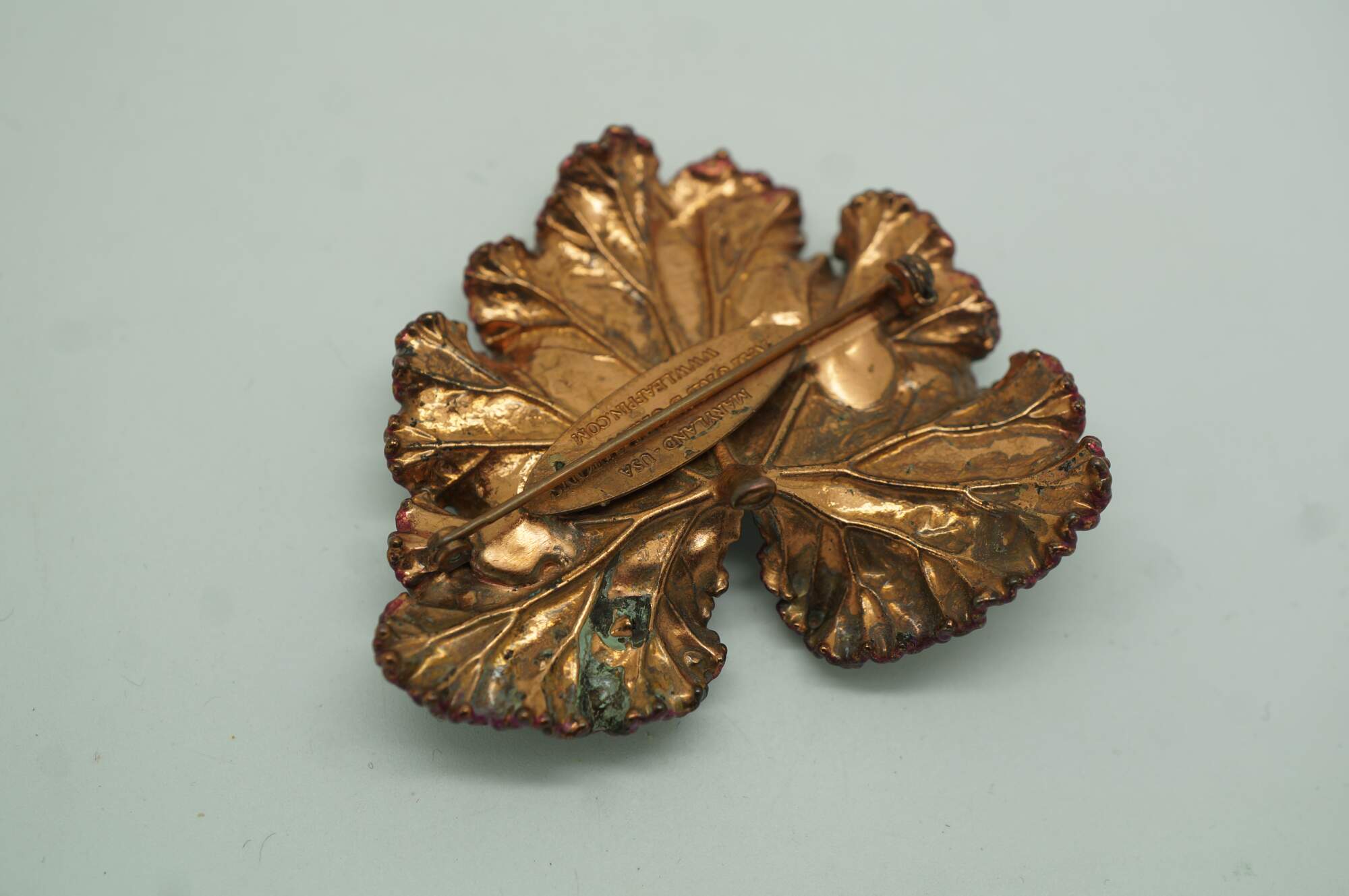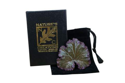 Vintage Nature's Creations copper geranium leaf brooch pin with original box, The Geranium, or storkbill in the United States, provides a wonderfully palmate shaped leaf with many unique curves. Though the aroma of the Scented Geranium is lost in the capturing process, its beauty is forever present with this beautiful brooch pendant.