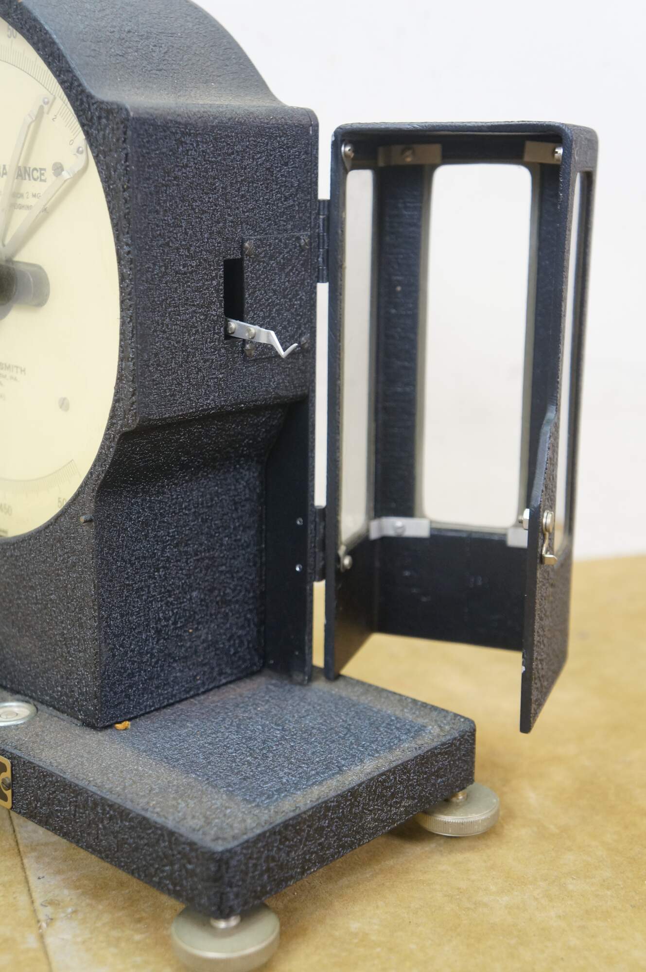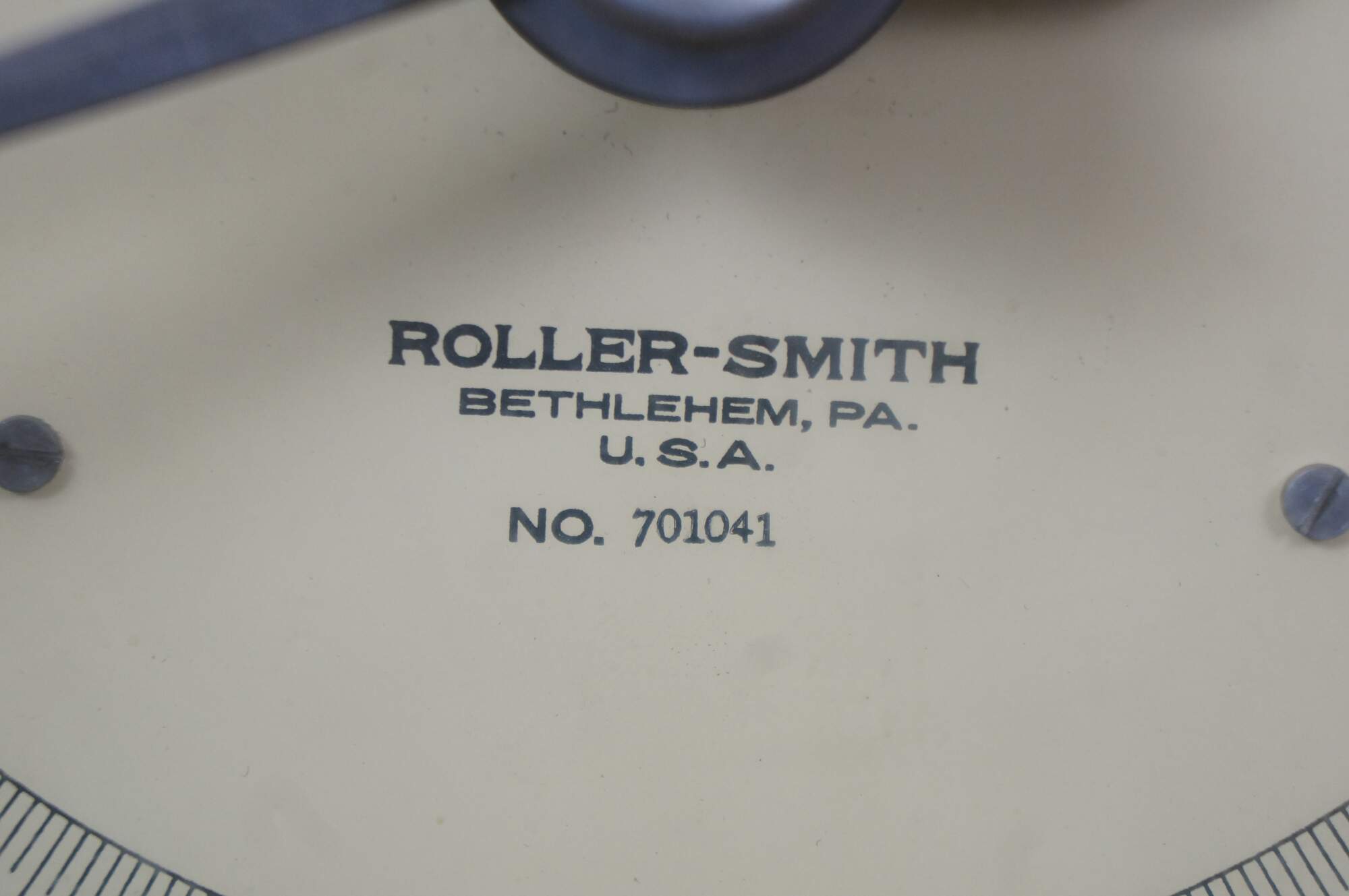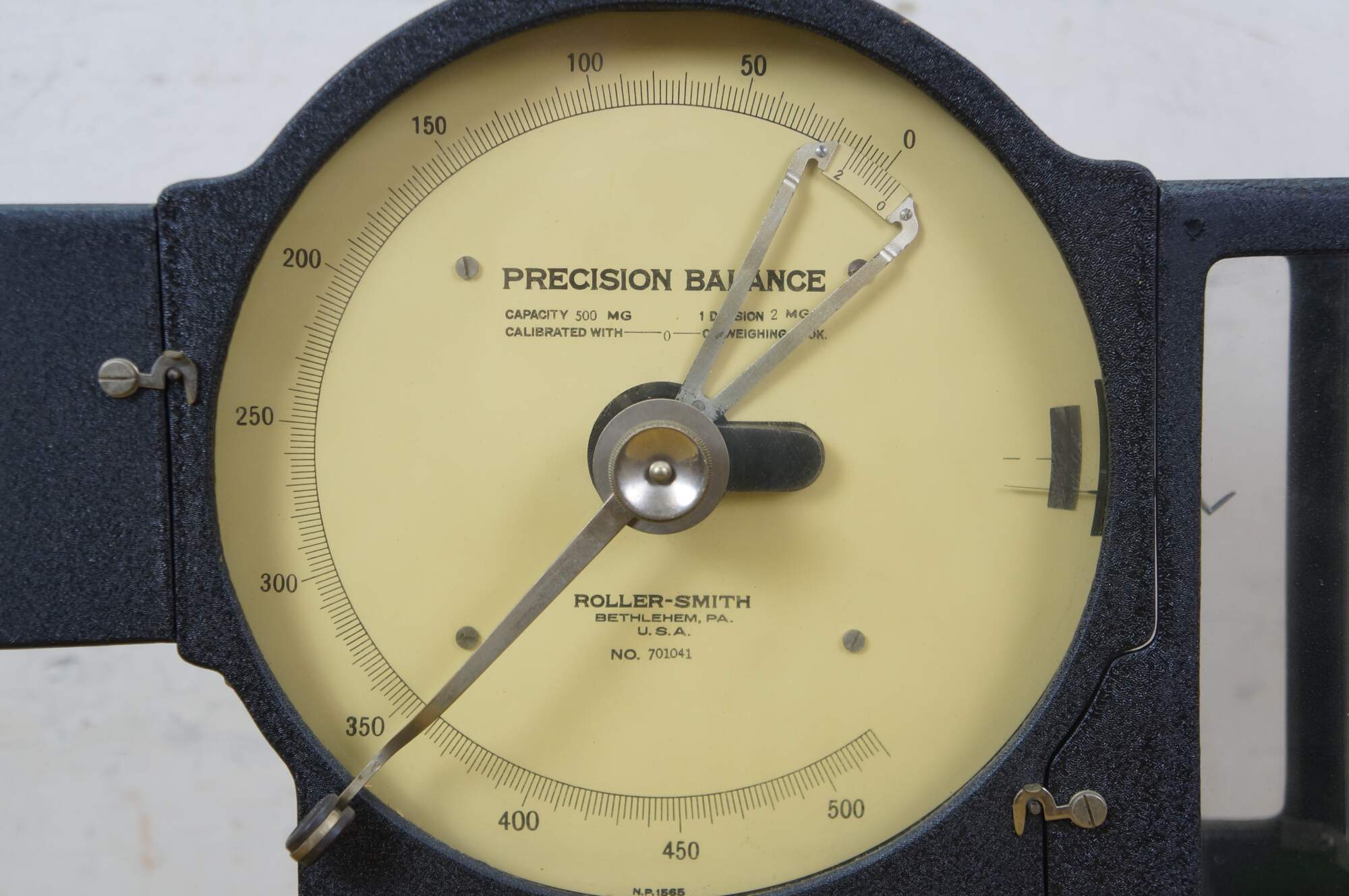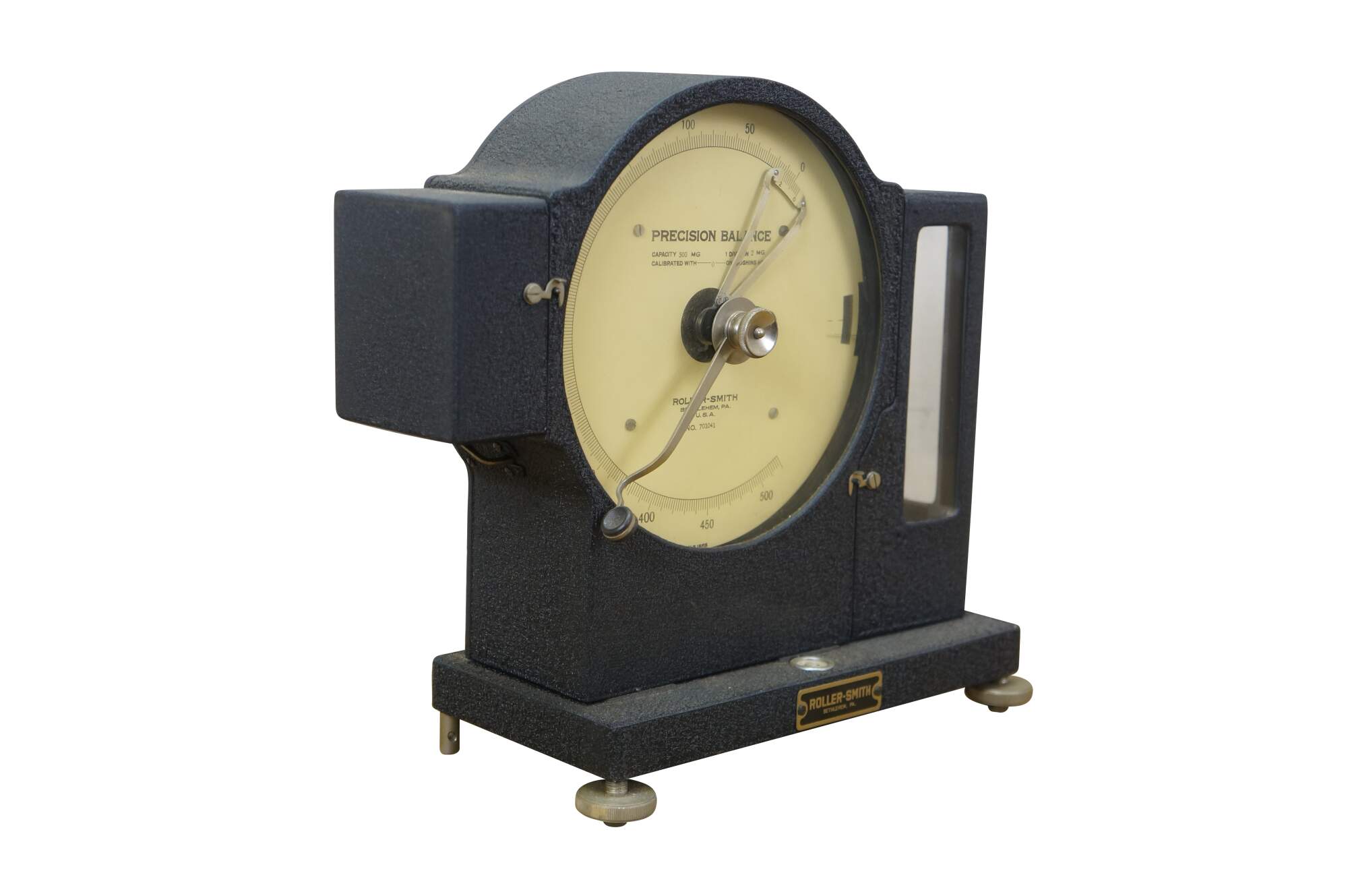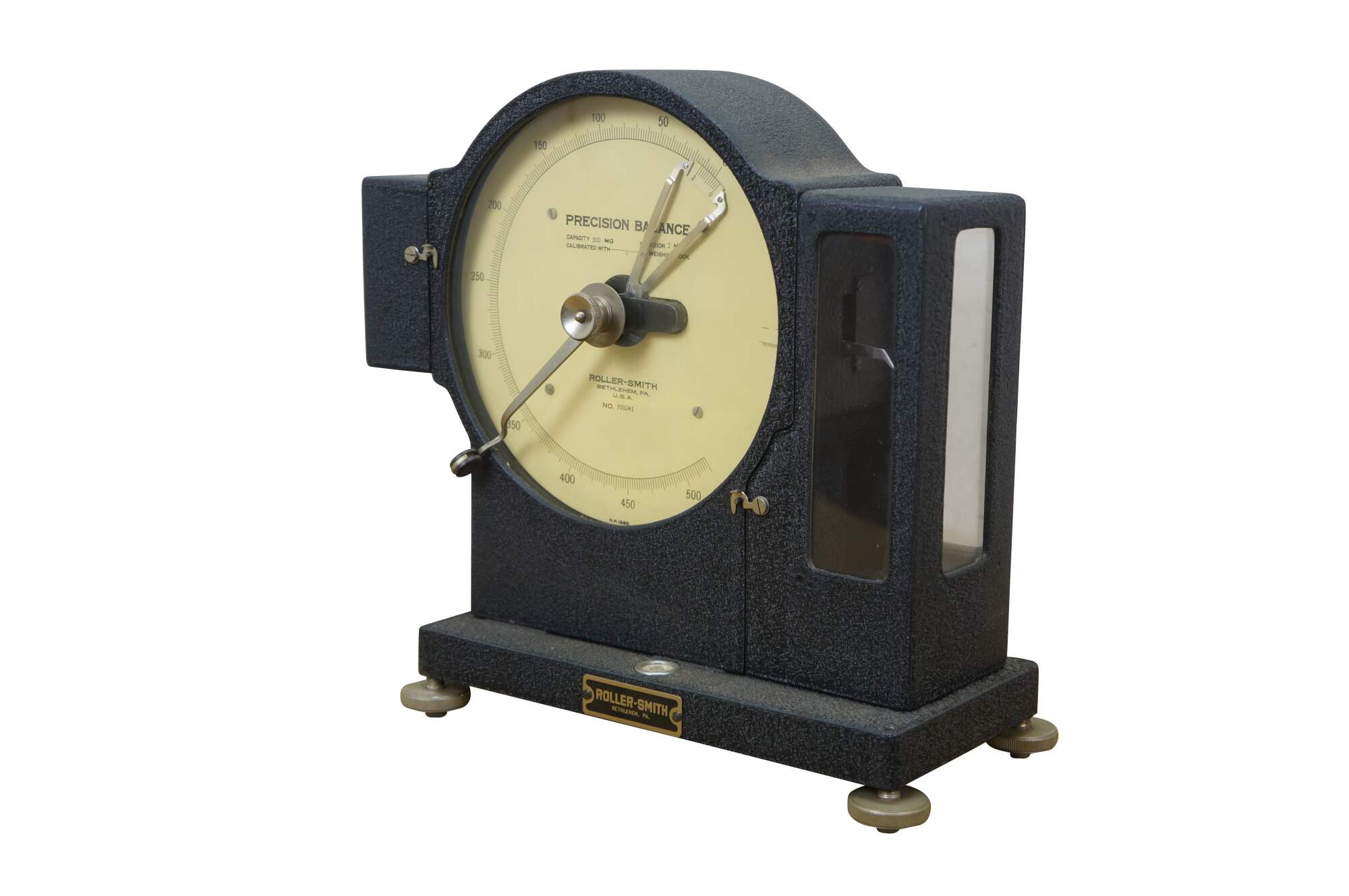 Vintage Roller-Smith precision laboratory balance scale, used for weighing very small objects with high accuracy in laboratory settings. Roller-Smith Company, formerly based in Bethlehem, PA. Features a cast-iron base, a 500mg dial for reading measurements, and a mechanism for high-precision weighing. 701041.