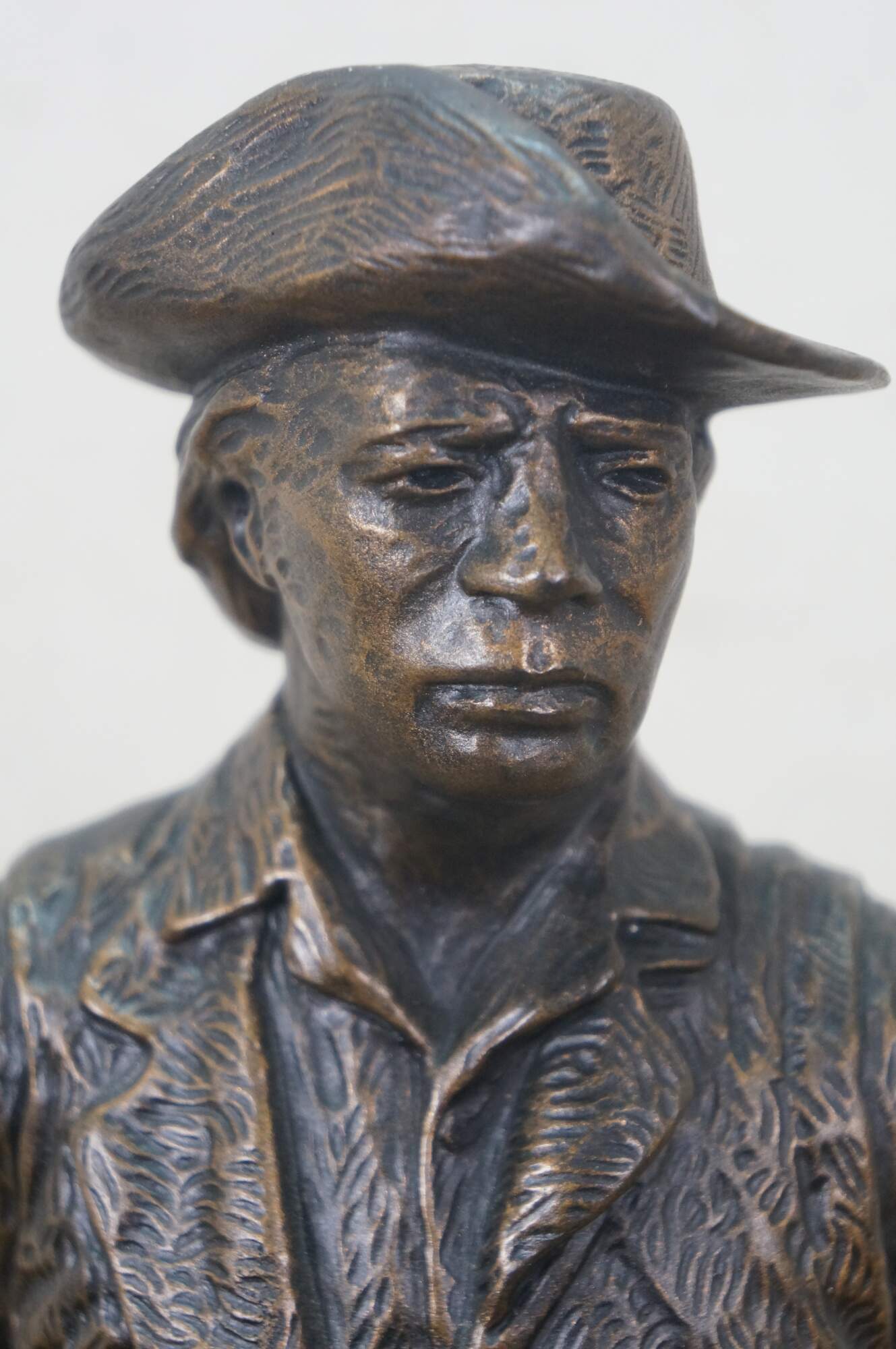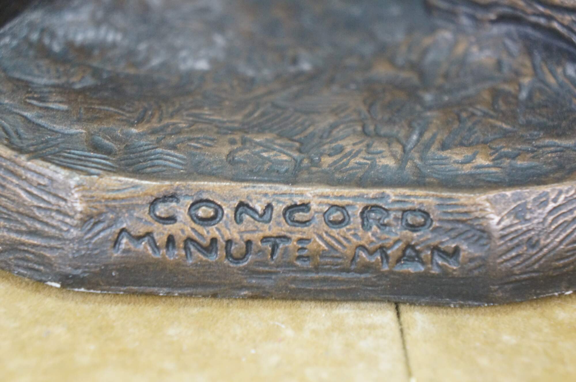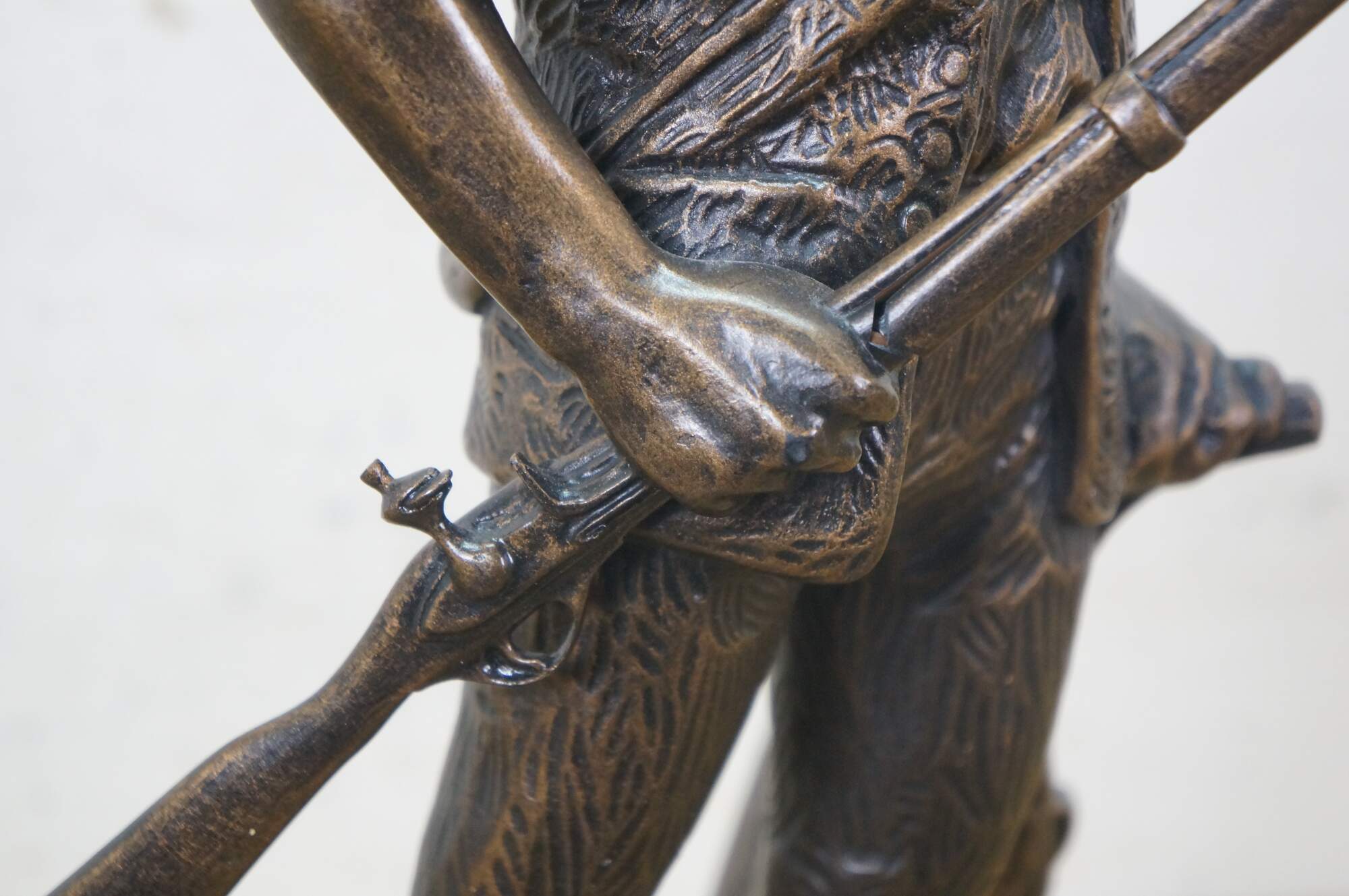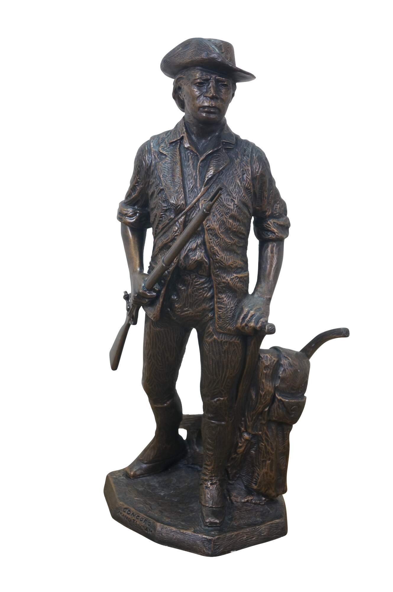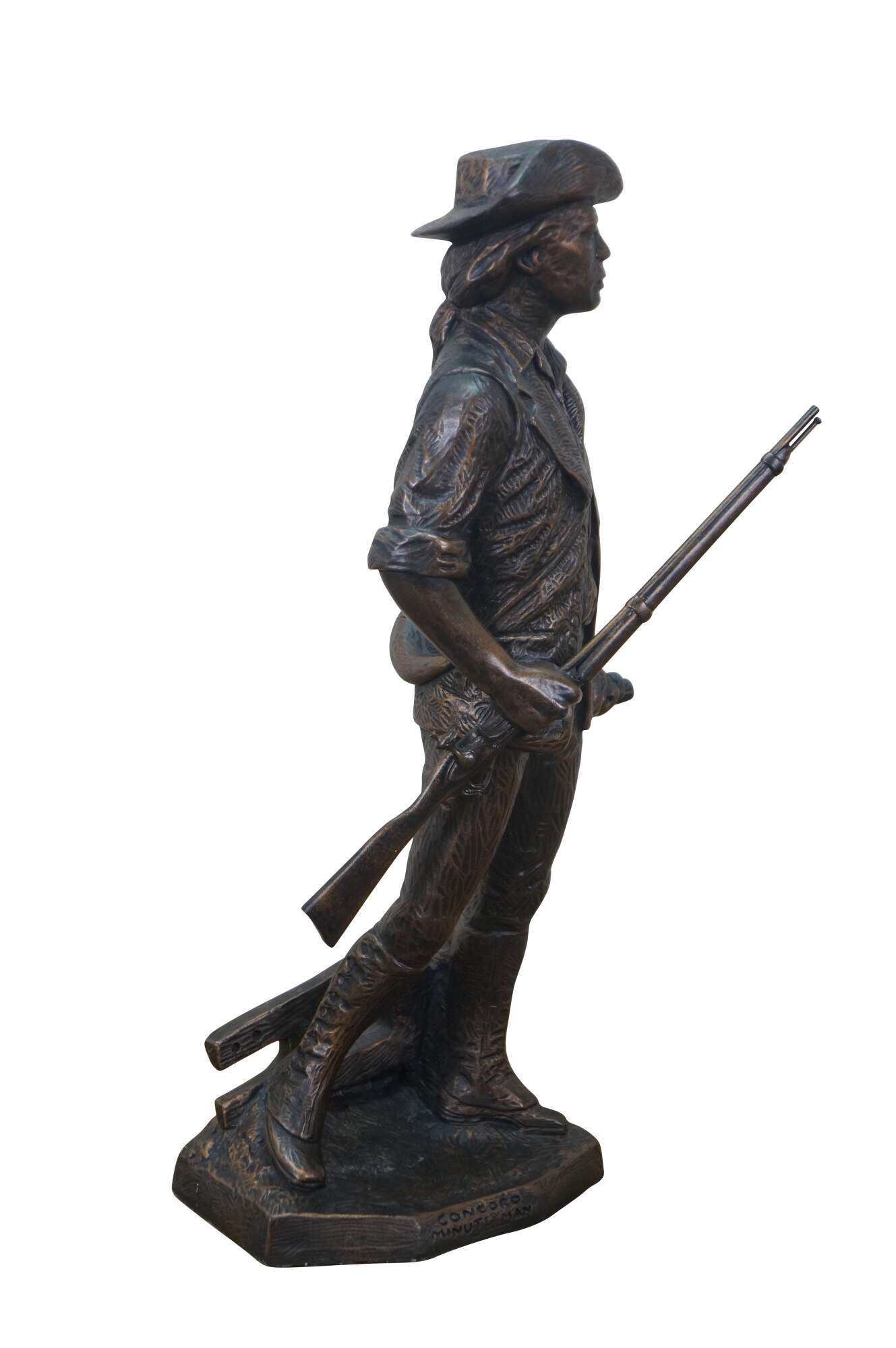 Large vintage 1987 patinated bronze terracotta Minute Man soldier holding rifle / gun by Terrance Patterson. Based on the monument by Daniel Chester French, created in 1875 and located in Minute Man National Historical Park, Concord, Massachusetts, the statue depicts a minuteman stepping away from his plow to join the Patriot forces at the Battle of Concord, at the start of the American Revolutionary War.