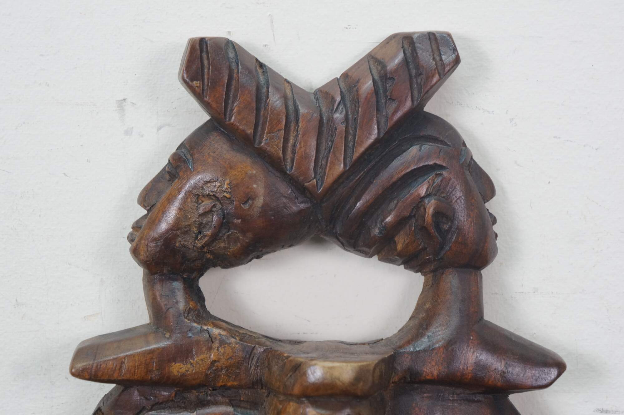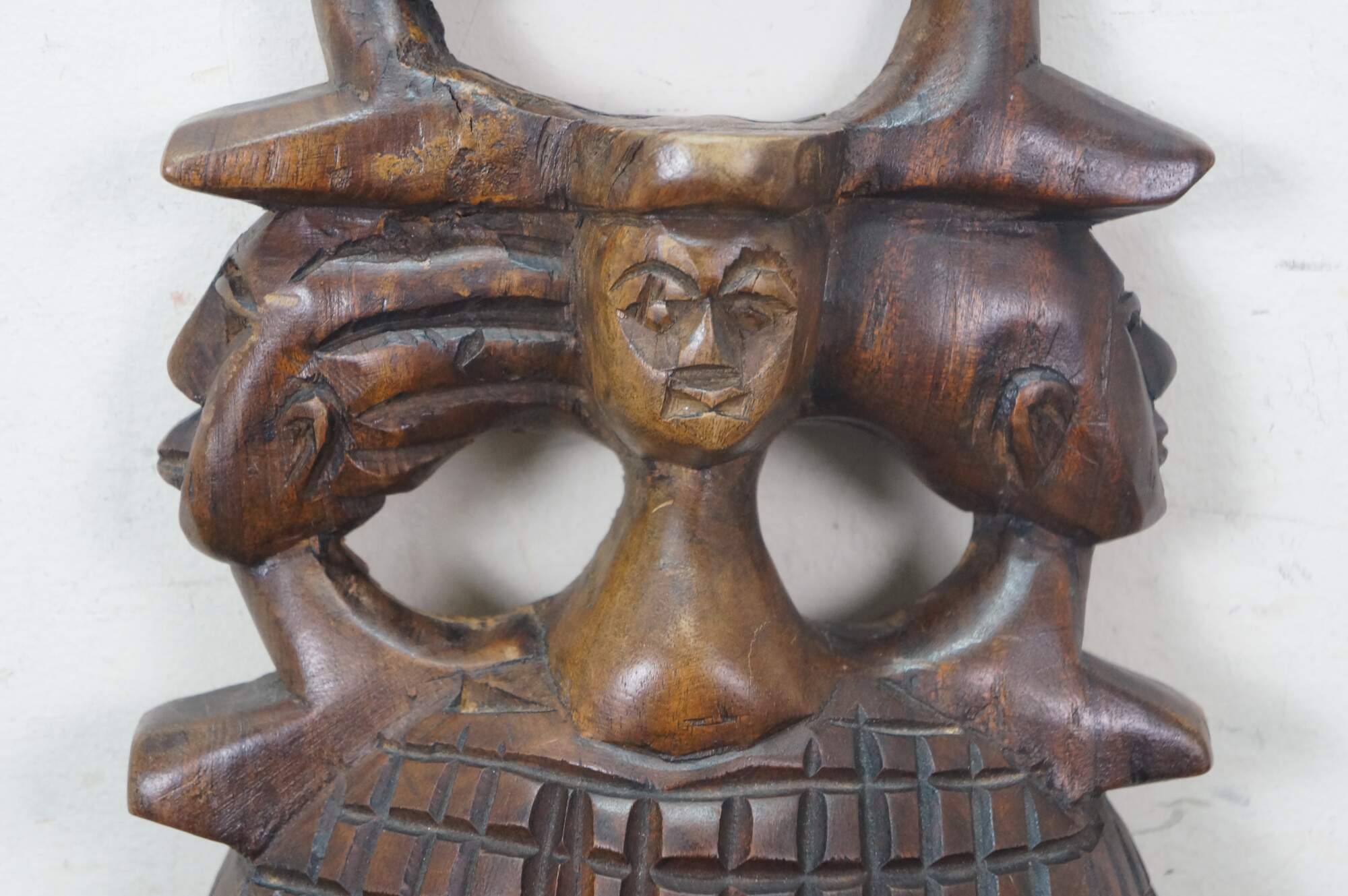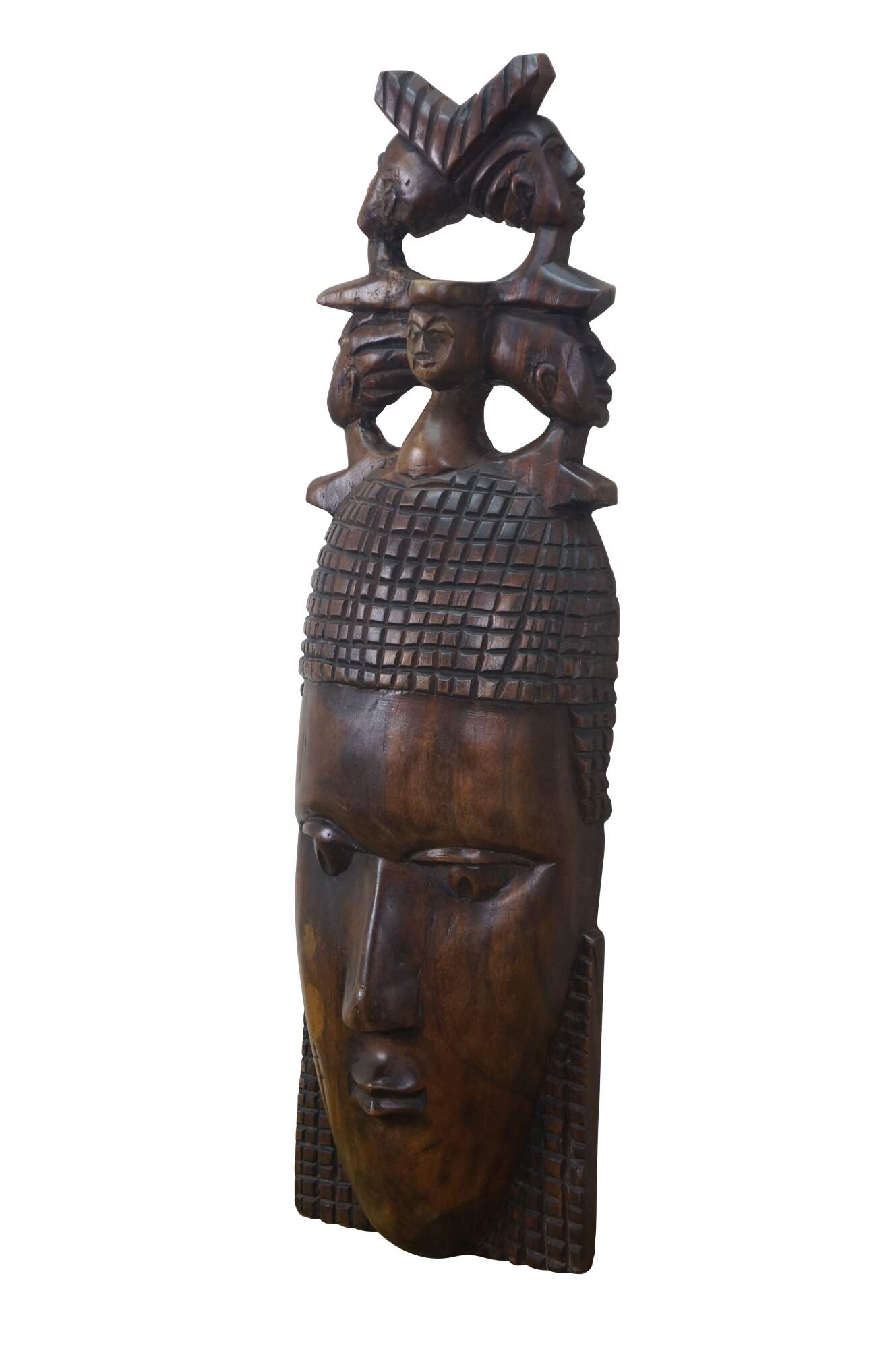 Vintage African tribal head mask featuring a matriarch wearing a headdress of her family.