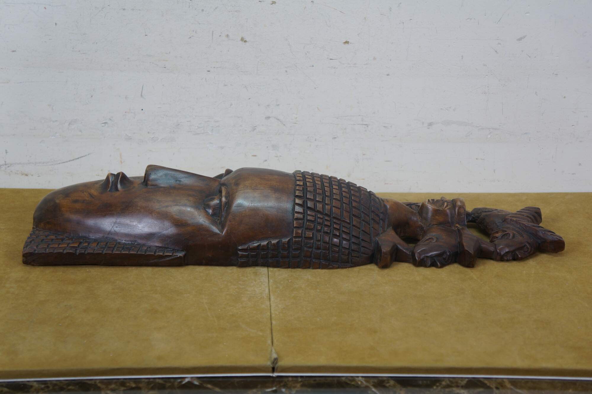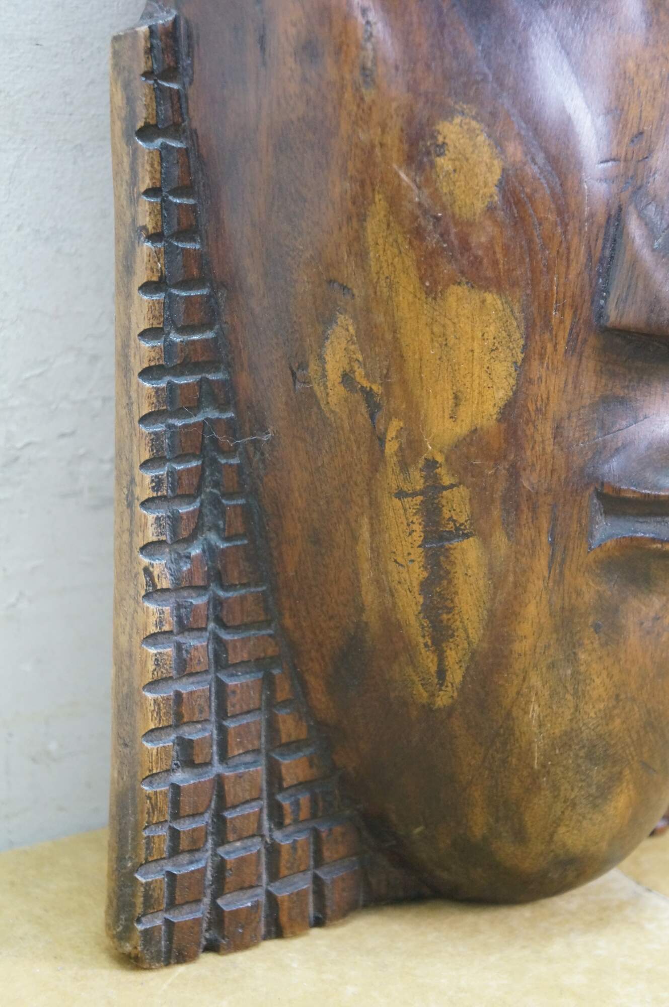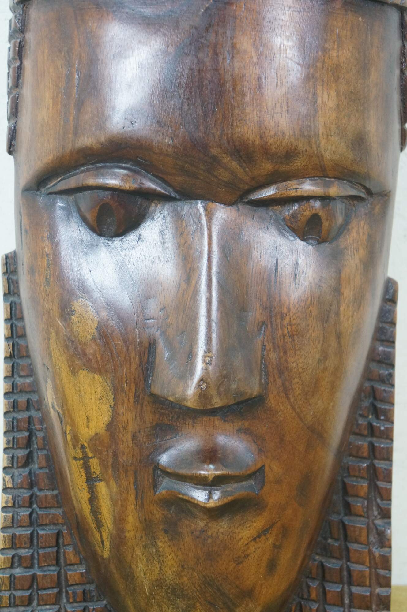Vintage African tribal head mask featuring a matriarch wearing a headdress of her family.