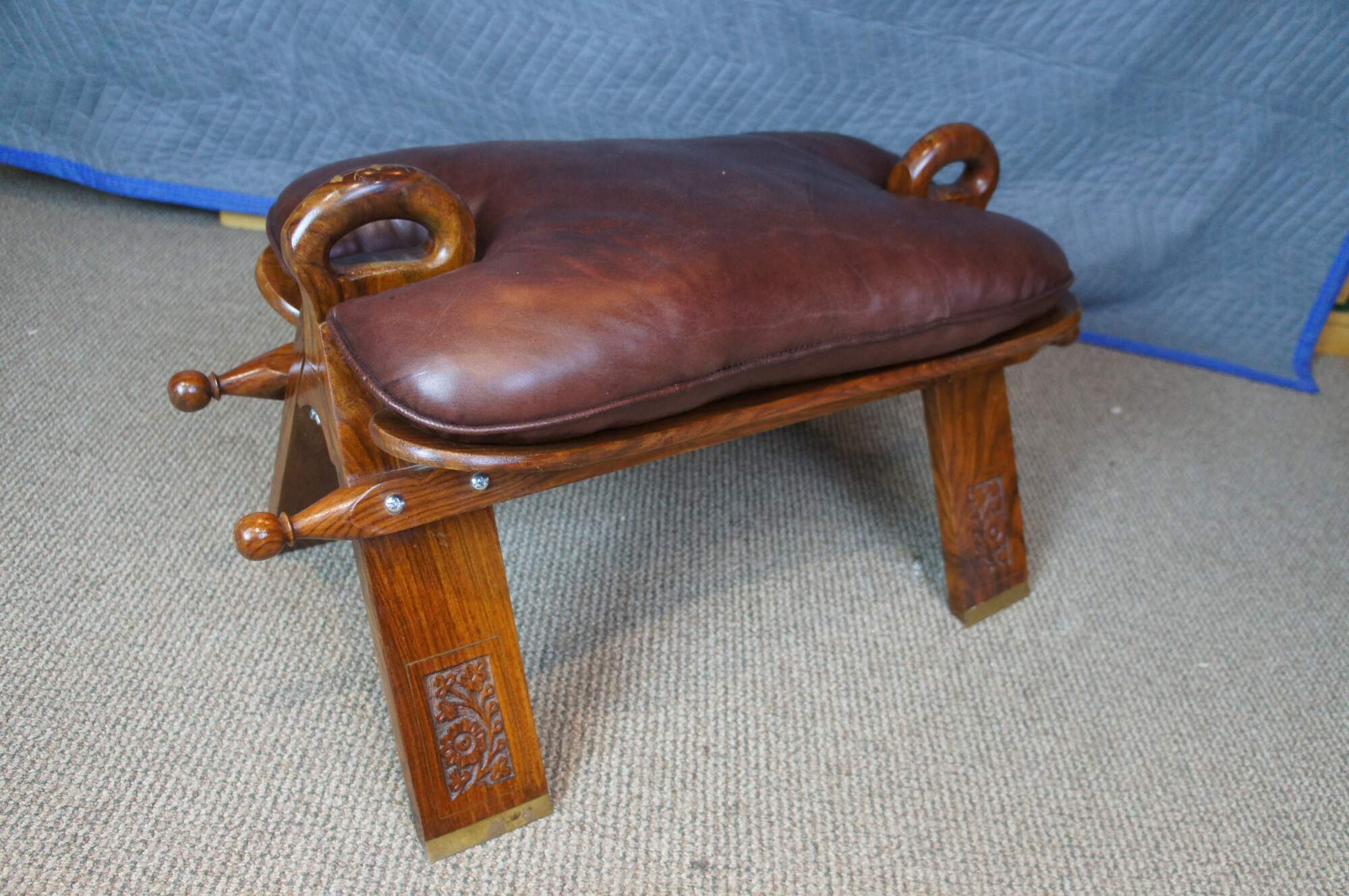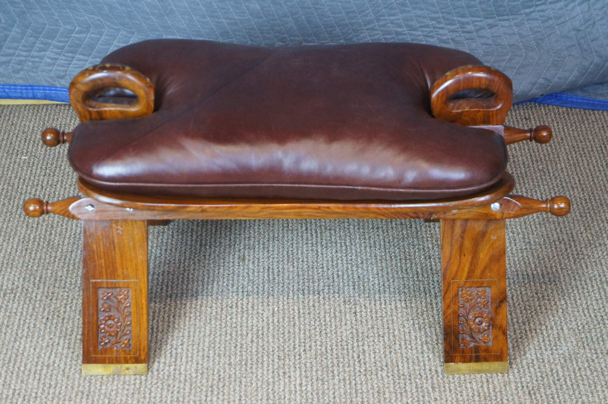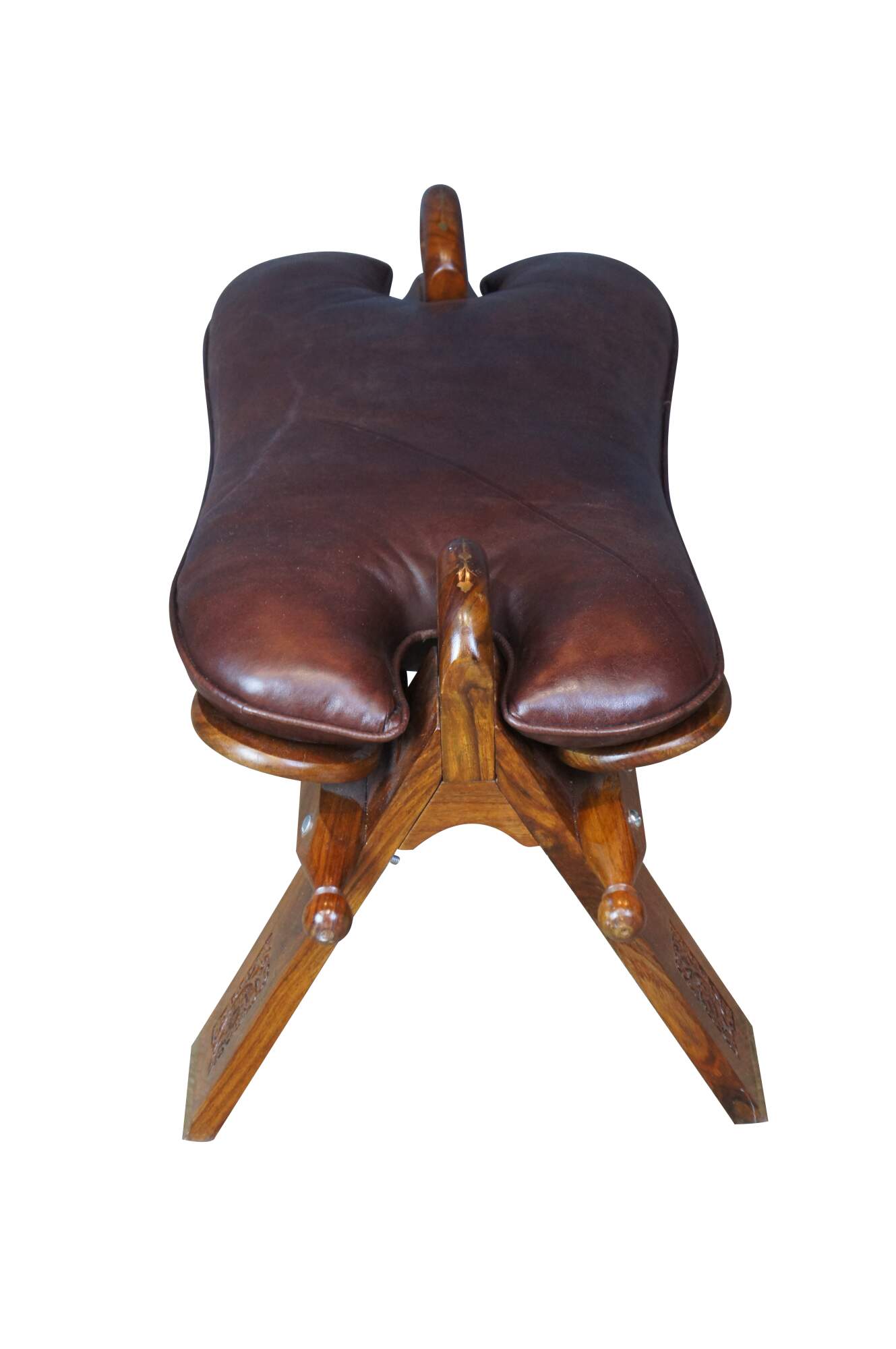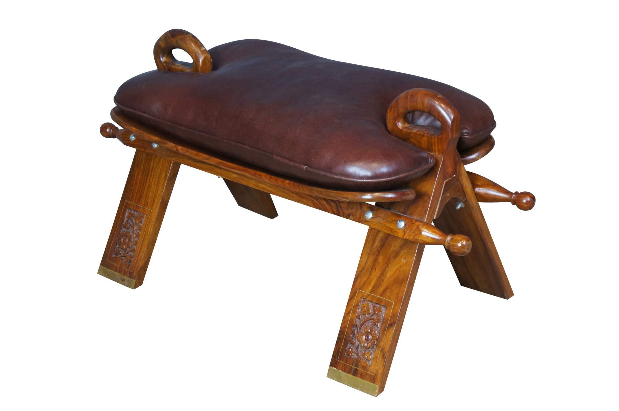 Mid century camel seat stools. Made of Rosewood featuring a carved floral accents with brown leather seat, two handles and brass accents.