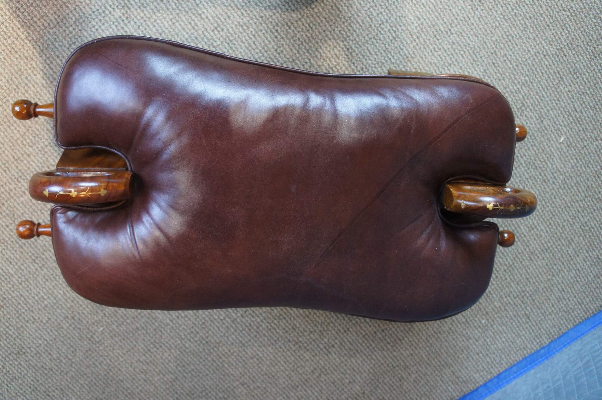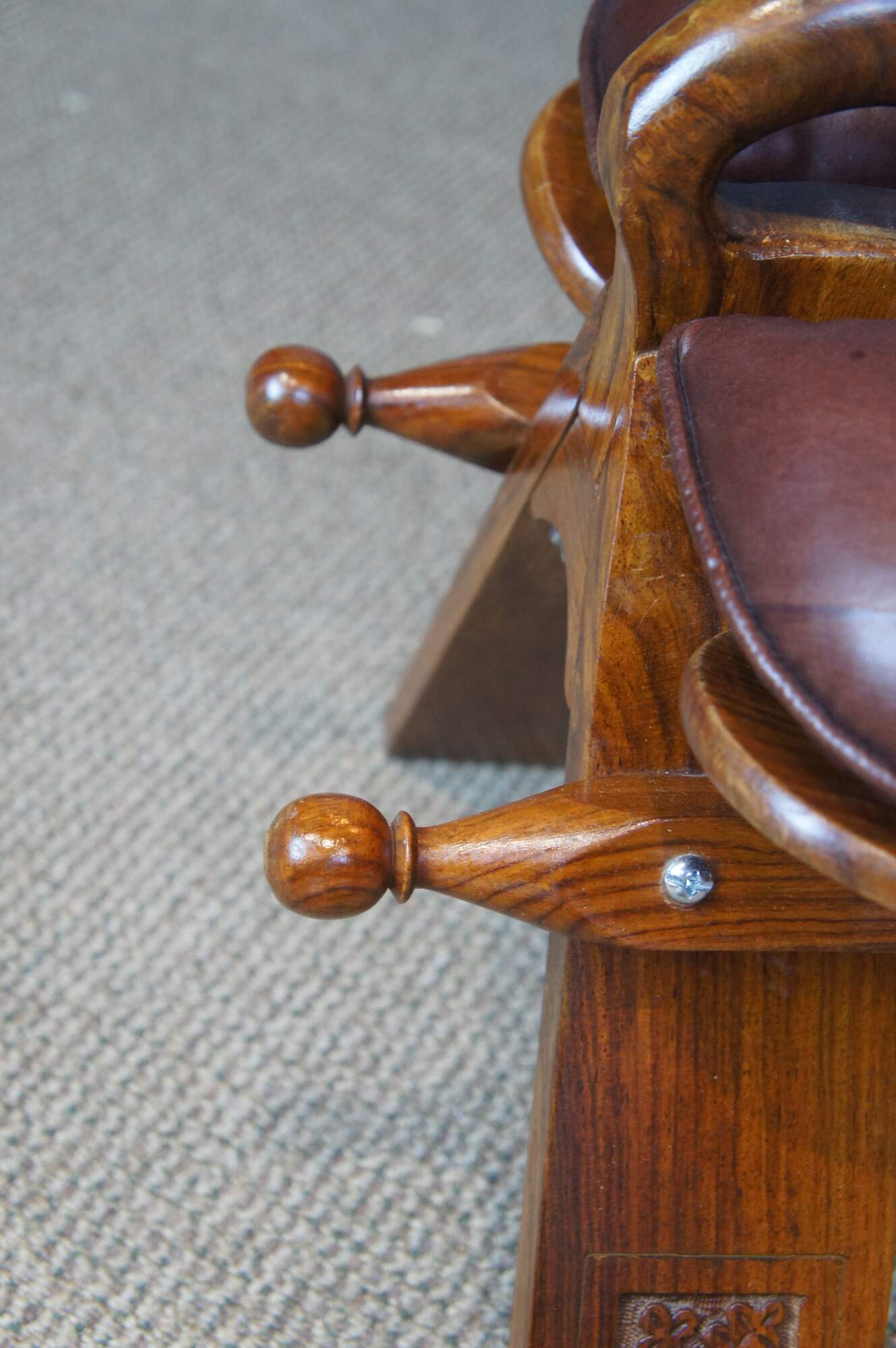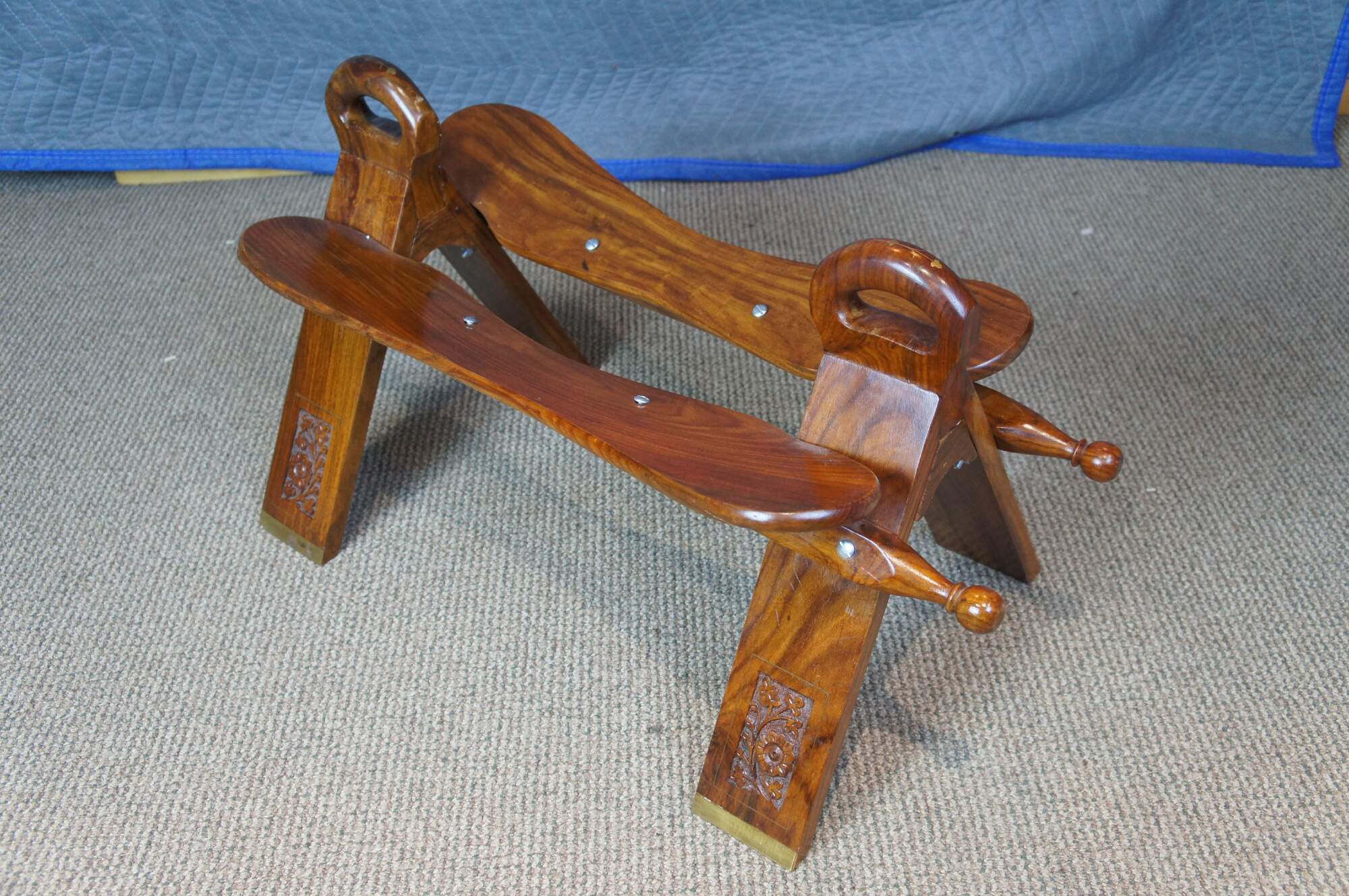 Mid century camel seat stools. Made of Rosewood featuring a carved floral accents with brown leather seat, two handles and brass accents.