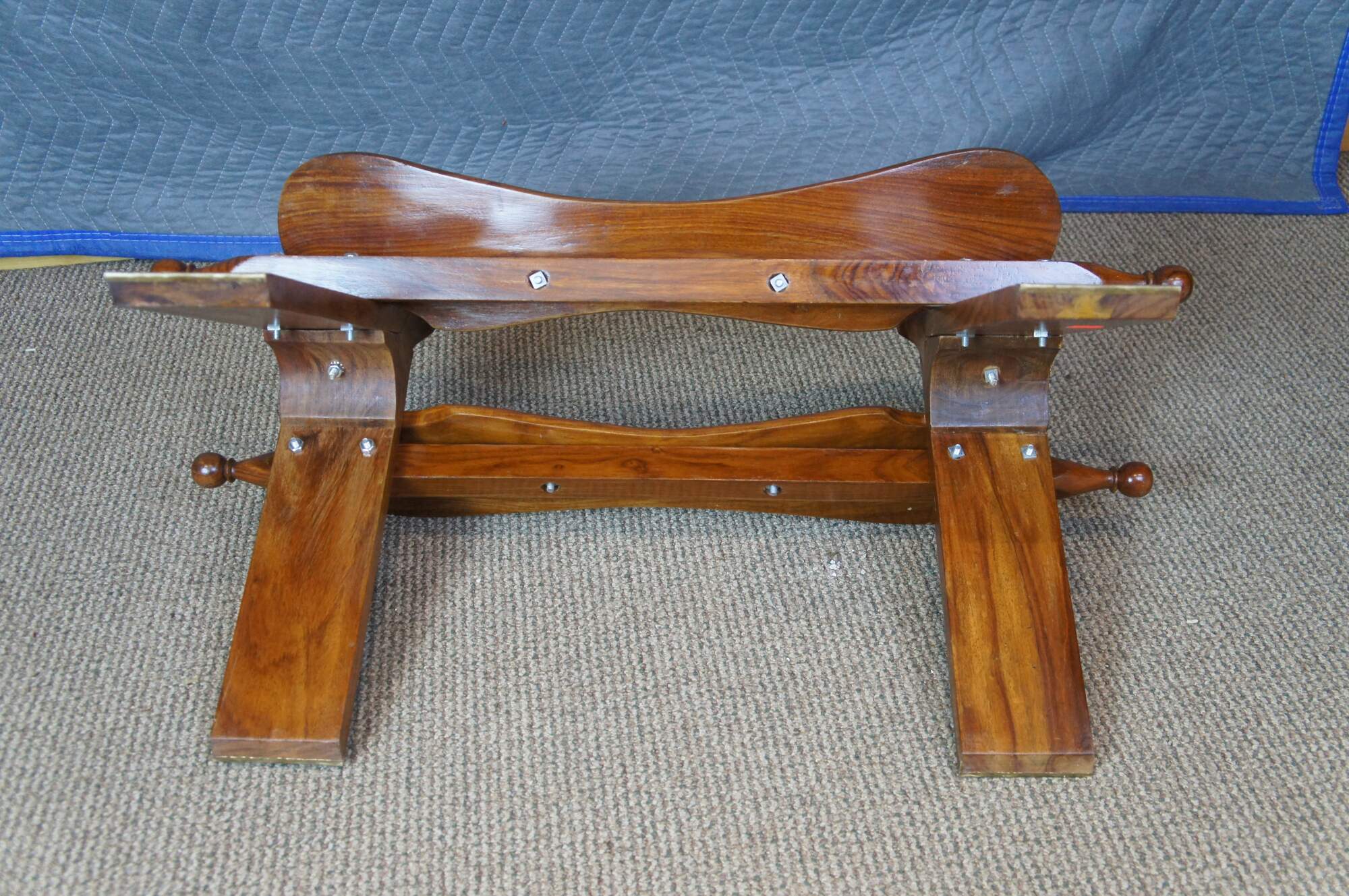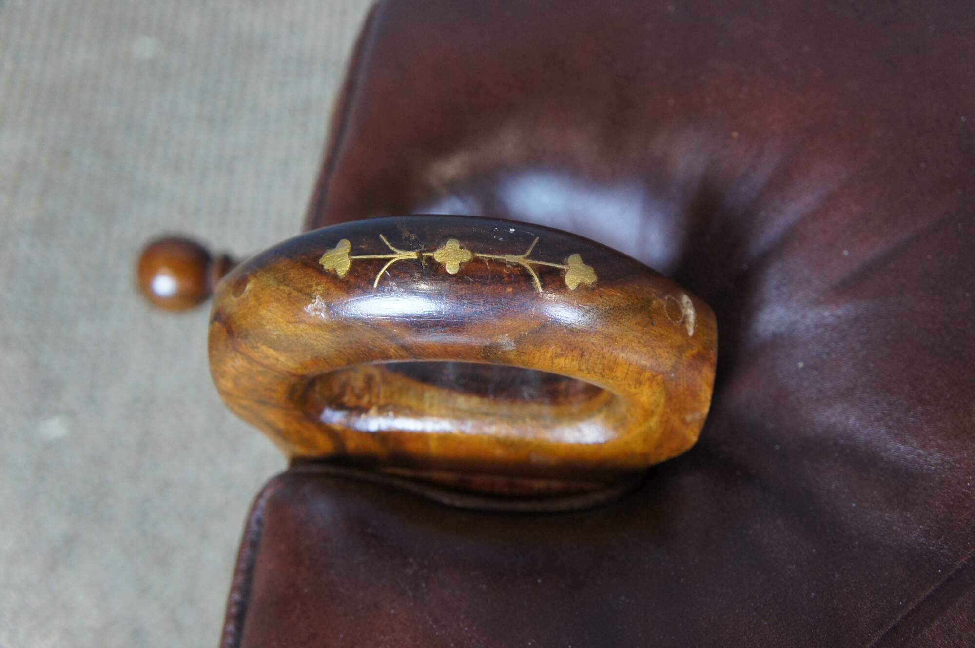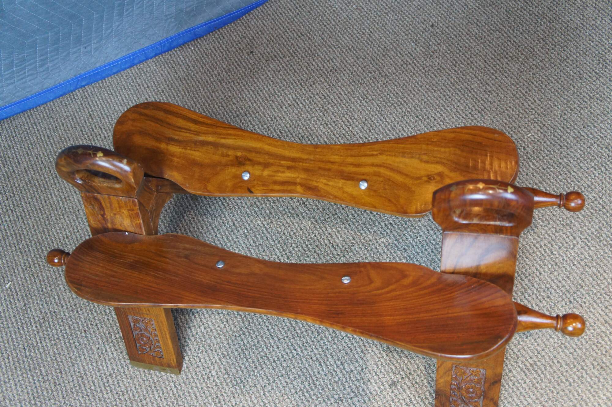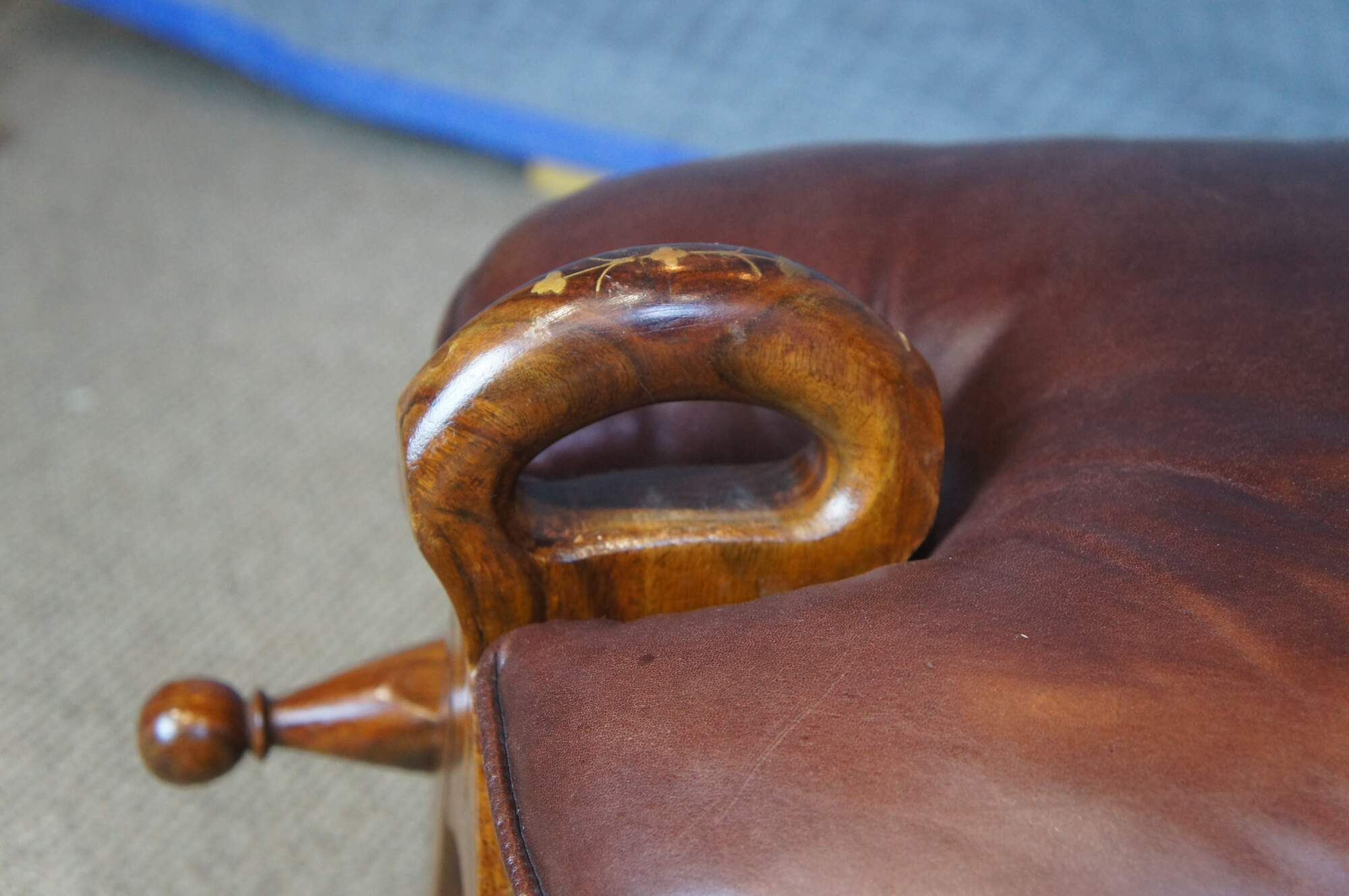 Mid century camel seat stools. Made of Rosewood featuring a carved floral accents with brown leather seat, two handles and brass accents.