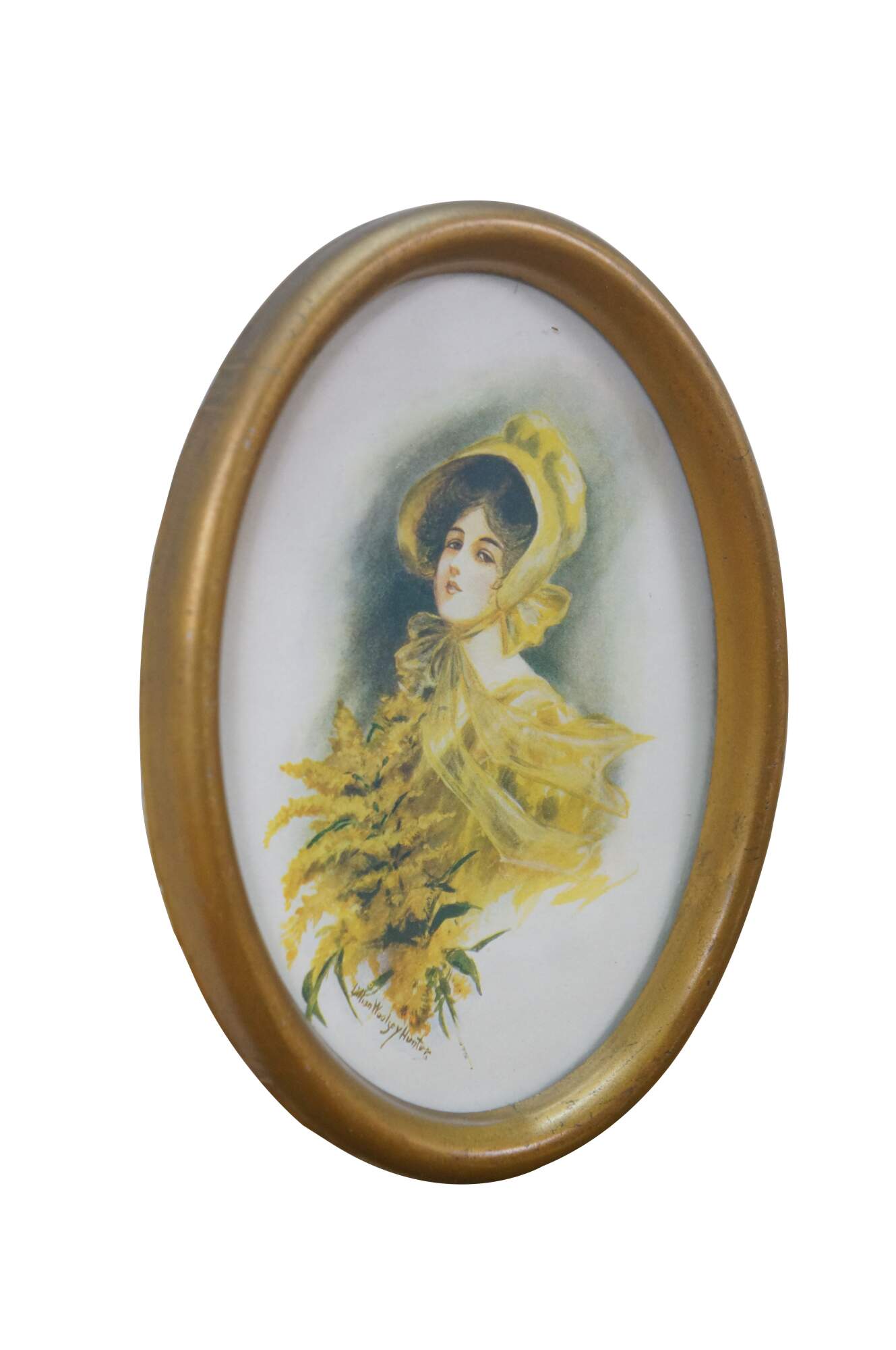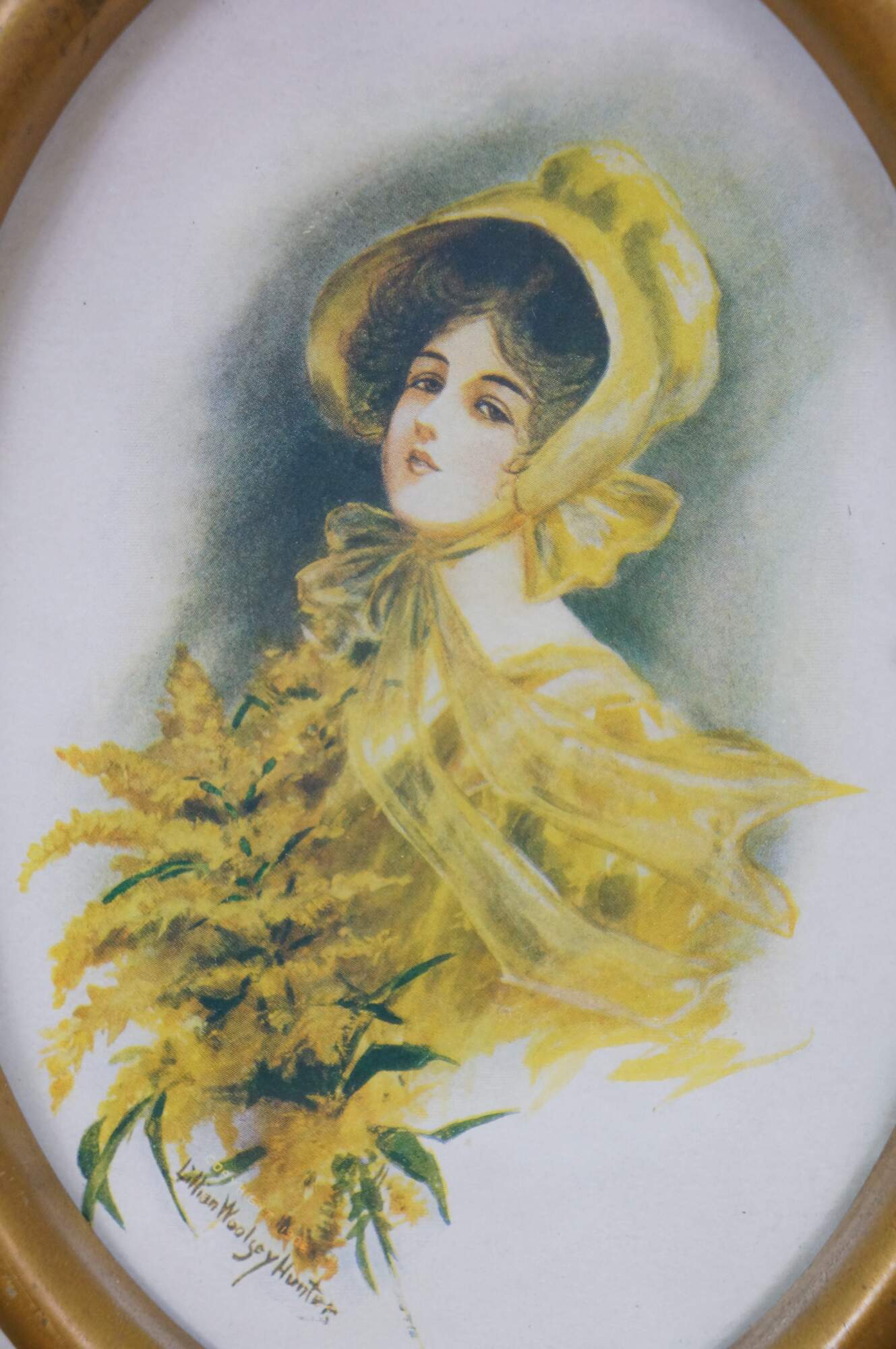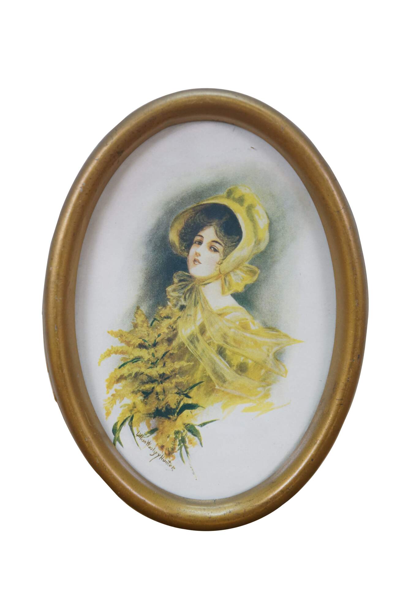 Small antique 1906 Lillian Woolsey Hunter Victorian lady portrait print in oval gold frame.